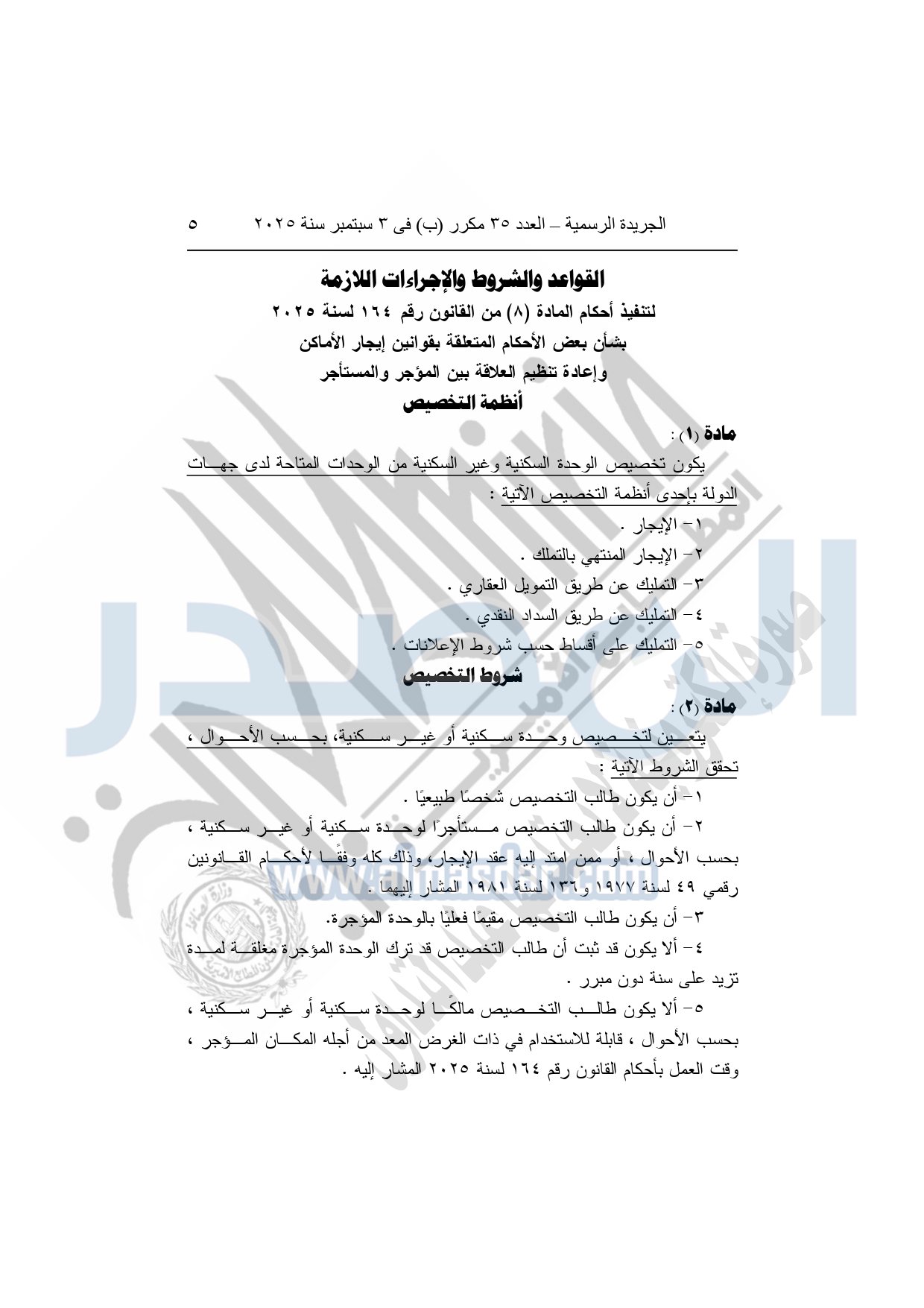 وحددت المواد، شروط التخصيص بأن يكون طالب التخصيص شخصاً طبيعياً، وأن يكون مستأجراً لوحدة سكنية أو غير سكنية، بحسب الأحوال، أو ممن امتد إليه عقد الإيجار، وفقاً لأحكام القانونين رقمي 49 لسنة 1977 و136 لسنة 1981، وأن يكون مُقيمًا فعلياً بالوحدة المُؤجرة، وألا يكون قد ثبت أنه ترك الوحدة المؤجرة مغلقة لمدة تزيد على سنة دون مبرر، وألا يكون مالكاً لوحدة سكنية أو غير سكنية، بحسب الأحوال، قابلة للاستخدام في ذات الغرض المعد من أجله المكان المؤجر، وقت العمل بأحكام القانون رقم "164" لسنة 2025المُشار اليه، وأن تكون الوحدة المطلوب تخصيصها والوحدة المُؤجرة التي سيتم إخلاؤها من ذات الغرض وبذات المحافظة، والتزام طالب التخصيص بتقديم إقرار بإخلاء وتسليم العين المُؤجرة فور صدور قرار التخصيص واستلام الوحدة على أن يكون موثقاً بالشهر العقاري.