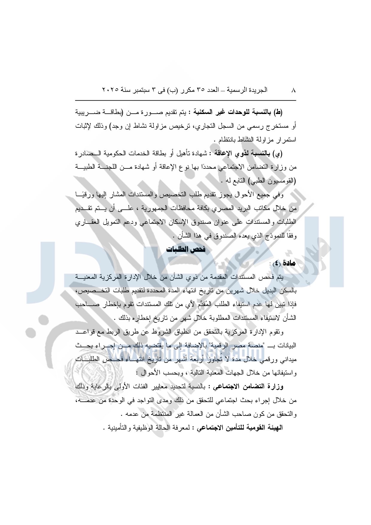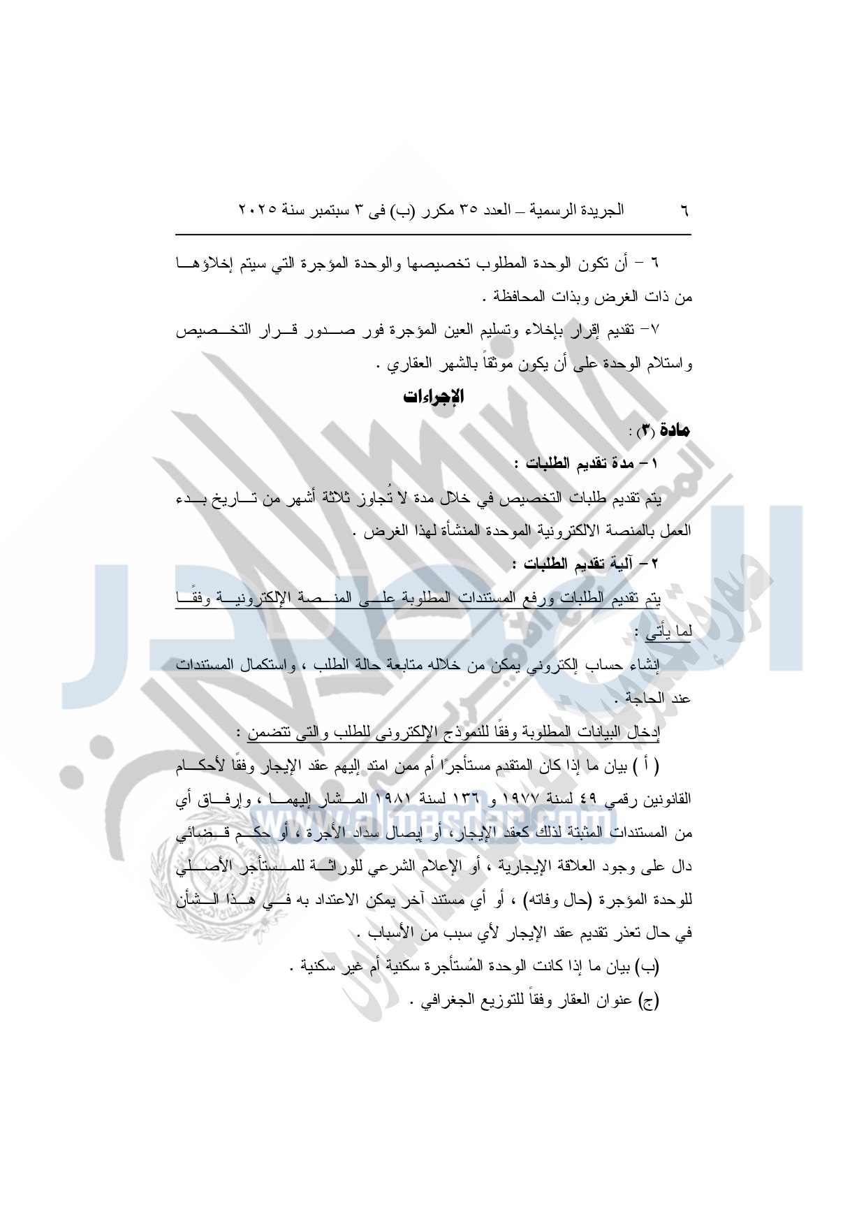 كما حدد مشروع القرار، مُدة وآلية تقديم طلبات التخصيص، تضمنت أن يكون تقديم طلبات التخصيص على المنصة الإلكترونية الموحدة المنشأة لغرض تخصيص الوحدات وفقا لأحكام هذا القرار، وأن يتم التقديم خلال مدة لا تجاوز 3 أشهر من تاريخ بدء العمل بهذه المنصة الالكترونية، وأن يكون ذلك من خلال إنشاء حساب إلكتروني يمكن من خلاله متابعة حالة الطلب واستكمال المستندات عند الحاجة، وتحديد المستندات المطلوبة، ومن بينها المستندات المثبتة للعلاقة الإيجارية والحالة الاجتماعية، وما يفيد دخل الأسرة، وتقديم المستندات التي تفيد استمرار مزاولة النشاط بالنسبة للوحدات غير السكنية، وتقديم شهادة تأهيل أو بطاقة الخدمات الحكومية الصادرة من وزارة التضامن الاجتماعي، أو شهادة من اللجنة الطبية والقومسيون الطبي بالنسبة لذوي الإعاقة.