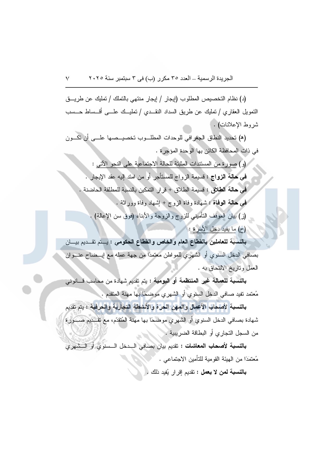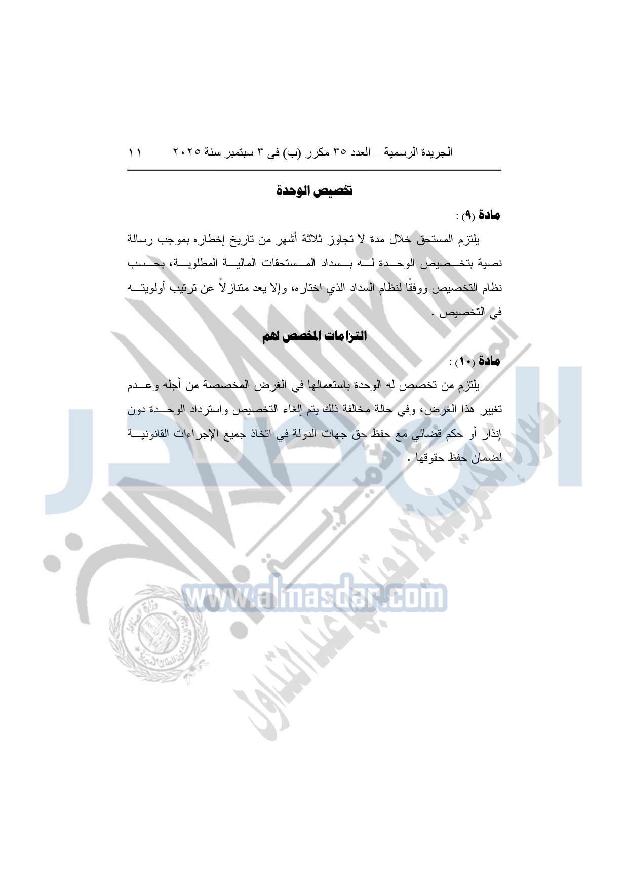 وألزم، المُستحق خلال مدة لا تجاوز 3 أشهر من تاريخ إخطاره بموجب رسالة نصية بتخصيص الوحدة له، بسداد المستحقات المالية المطلوبة، بحسب نظام التخصيص ووفقاً لنظام السداد الذي اختاره، وإلا يعد مُتنازلاً عن ترتيب أولويته في التخصيص، كما ألزمه باستعمال الوحدة في الغرض المخصصة من أجله وعدم تغيير هذا الغرض، وفي حالة مخالفة ذلك يتم إلغاء التخصيص واسترداد الوحدة دون إنذار أو حكم قضائي مع حفظ حق جهات الدولة في اتخاذ جميع الإجراءات القانونية لضمان حفظ حقوقها.