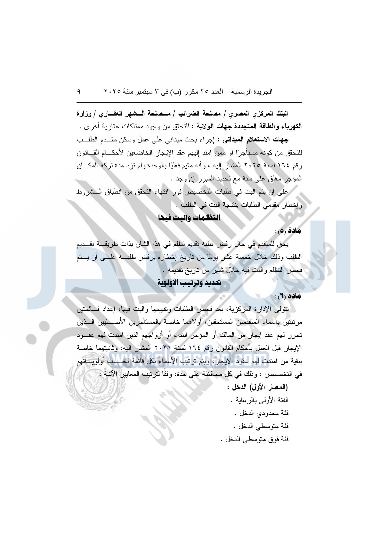 كما حدد مشروع القرار، ورتب الأولوية في التخصيص والمعايير المُتبعة في هذا الشأن، حيث تضمنت أن يتم إعداد قائمتين مرتبتين بأسماء المتقدمين المستحقين، أولاهما خاصة بالمستأجرين الأصليين الذين تحرر لهم عقد إيجار من المالك أو المؤجر ابتداء أو أزواجهم الذين امتدت لهم عقود الإيجار قبل العمل بأحكام القانون رقم "164" لسنة 2025 المشار إليه، وثانيهما خاصة ببقية من امتدت لهم عقود الإيجار، ويتم ترتيب الأسماء بكل قائمة بحسب أولوياتهم في التخصيص، وذلك في كل محافظة، وفقاً لترتيب معايير: السن، والدخل، والحالة الاجتماعية، على أن يتم في حالة التساوي في فئات المعيار الأول اللجوء إلى فئات المعيار الثاني؛ وفي حالة التساوي يتم التحديد وفقاً للمعيار الثالث.