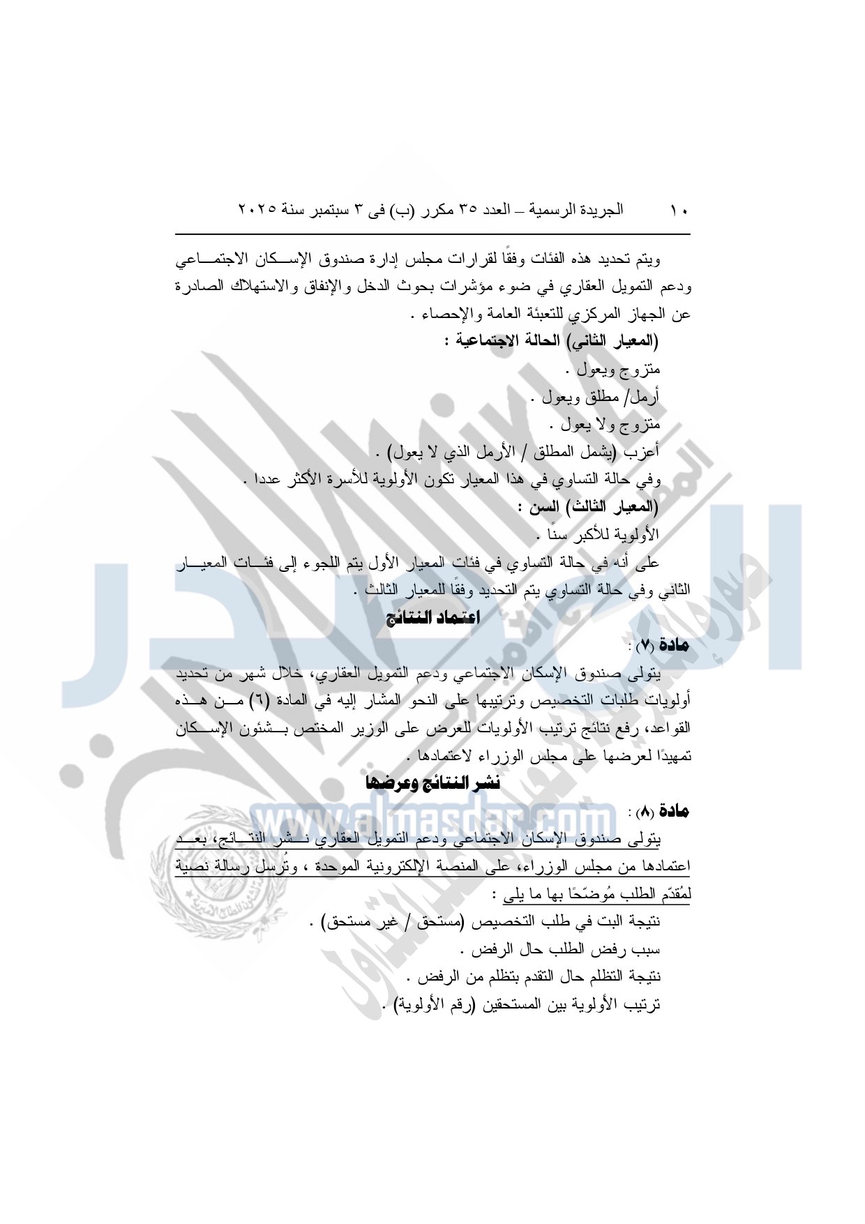 وأقر مشروع القرار، 10 مواد تضمنت القواعد والشروط والإجراءات اللازمة لتنفيذ حكم المادة "8" من القانون رقم "164" لسنة 2025 المشار إليه، أوضح من خلالها أنظمة تخصيص الوحدات السكنية وغير السكنية وفقا لأحكام هذا القرار، والتي تتمثل في نظام الإيجار أو نظام الإيجار المنتهي بالتملك، أو نظام التمليك عن طريق التمويل العقاري، أو نظام التمليك عن طريق السداد النقدي، أو نظام التمليك على أقساط حسب شروط الإعلانات.