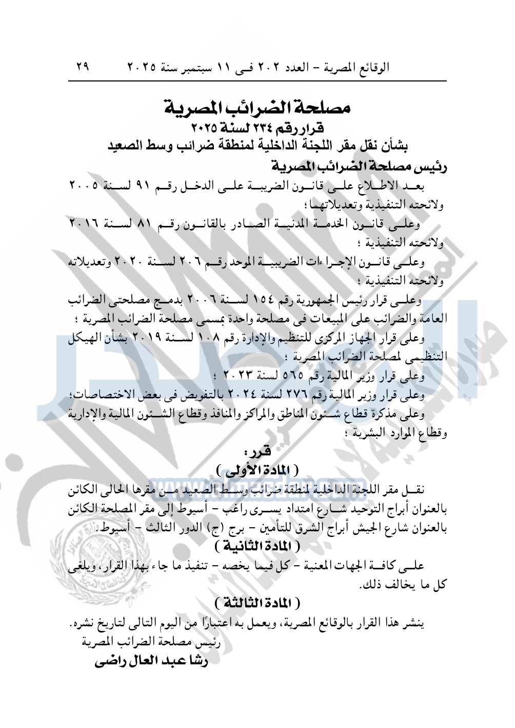نشرت الوقائع المصرية في العدد 202، في 11 ديسمبر 2025، قرار مصلحة الضرائب المصرية، رقم 234 لسنة 2025، بشأن نقل مقر اللجنة الداخلية لمنطقة ضرائب وسط الصعيد.