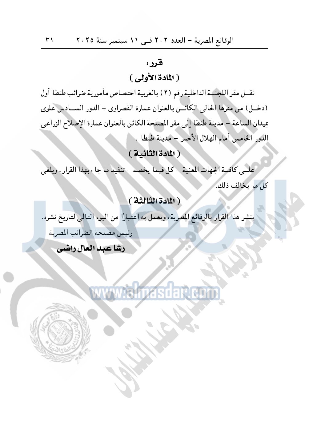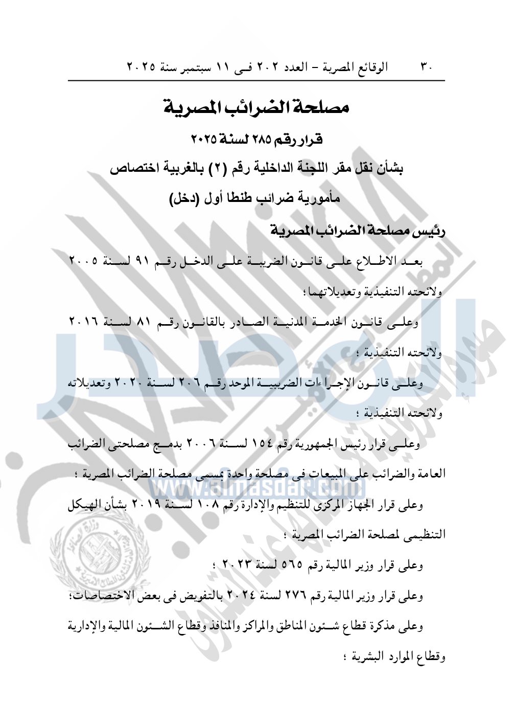 كما نشرت الوقائع المصرية في العدد 202، في 11 ديسمبر 2025، قرار مصلحة الضرائب المصرية، رقم 285 لسنة 2025، بشأن نقل مقر اللجنة الداخلية رقم "2" بالغربية اختصاص مأمورية ضرائب طنطا أول "دخل".