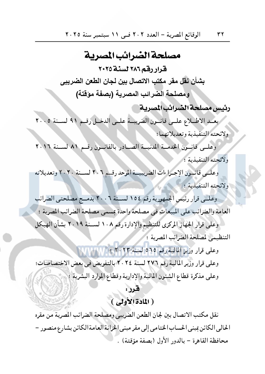 وأيضا نشرت الوقائع المصرية في العدد 202، في 11 ديسمبر 2025، قرار مصلحة الضرائب المصرية، رقم 286 لسنة 2025، بشأن نقل مقر مكتب الاتصال بين لجان الطعن الضريبي ومصلحة الضرائب المصرية "بصفة مؤقتة".