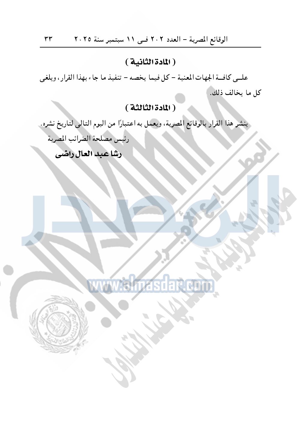 ينشر هذا القرار بالوقائع المصرية، ويعمل به اعتبارًا من اليوم التالي لتاريخ نشره.