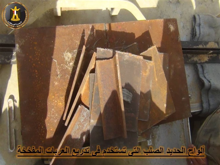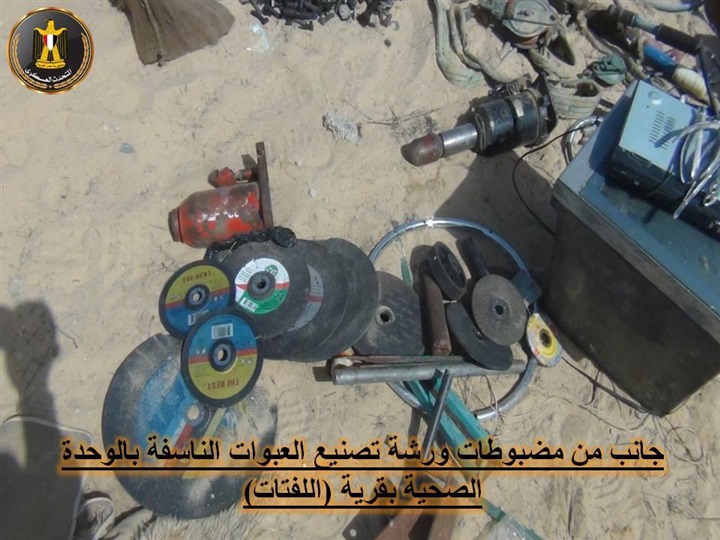 6- ضبط وتدمير ورشة لتصنيع العبوات الناسفة وتدريع العربات المفخخة داخل الوحدة الصحية بقرية "اللفتات" حيث عثر بها على الآتى [ عدد "7" عبوة ناسفة معبأة بالمسامير والصواميل الحديدية لإحداث أكبر قدر من الخسائر فى صفوف القوات - عدد "12" إسطوانة صاروخ - عدد "2" أنبوبة بوتاجاز - عدد "3" كوريك رفع عربات ثقيلة - عدد "15" تجهيزة حديد لتصنيع العبوات الناسفة - عدد "4" بلانكو رفع بجنزير - عدد "2" طلمبة كبس - ضغط - عدد "20" خوصة حديد - عدد "6" لوح حديد صلب مقاس "1.5x2" متر يستخدم فى تدريع العربات المفخخة - عدد "100" مقذوف مدفعية - عدد "11" خزنة بندقية آلية - قنبلة دفاعية F1- ملابس عسكرية".