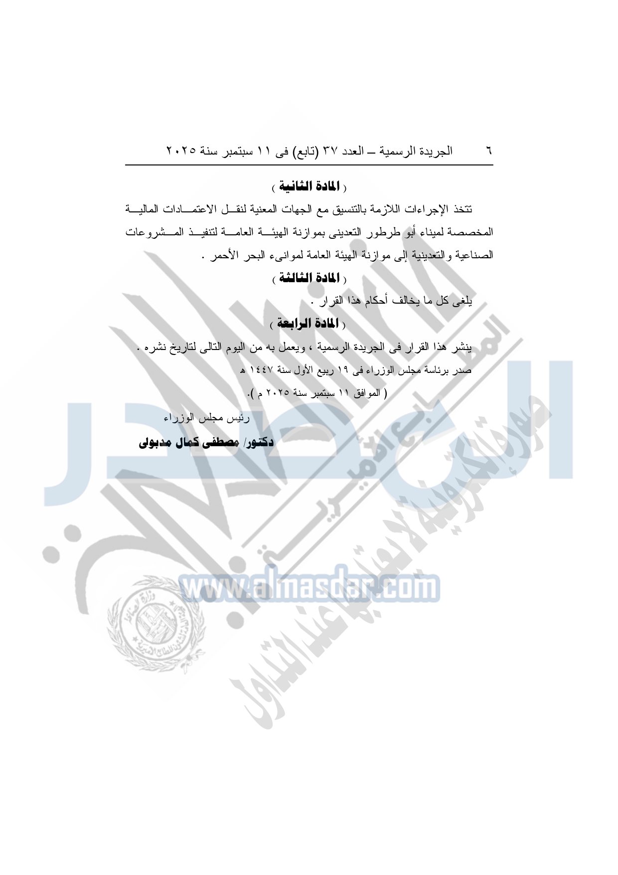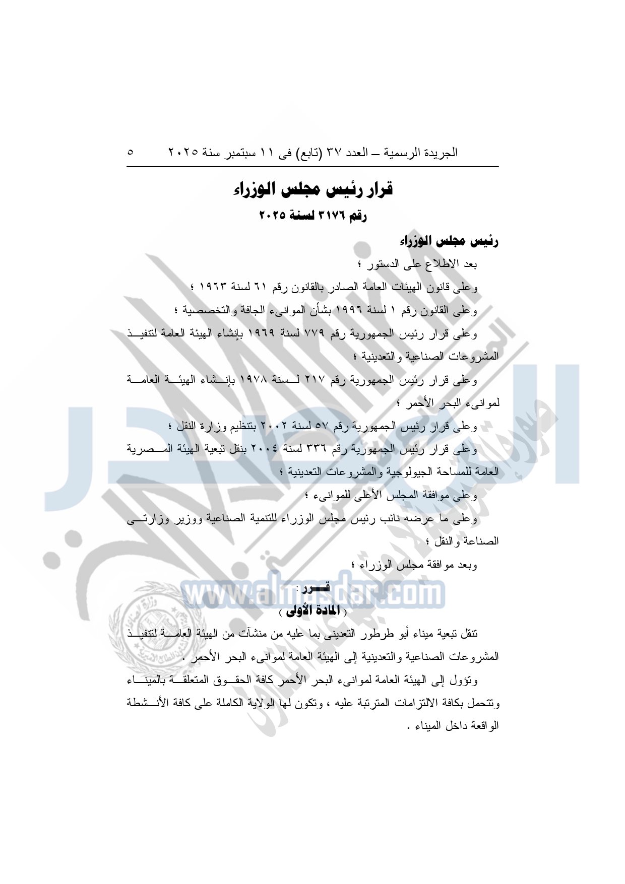 نشرت الجريدة الرسمية، في العدد 37 "تابع"، الصادر في 11 سبتمبر سنة 2025، قرار رئيس مجلس الوزراء، قرار رقم 3176 لسنة 2025، بشأن تنقل تبعية ميناء أبو طرطور التعديني بما عليه من منشآت من الهيئة العامة لتنفيذ المشروعات الصناعية والتعدينية إلى الهيئة العامة لموانىء البحر الأحمر.