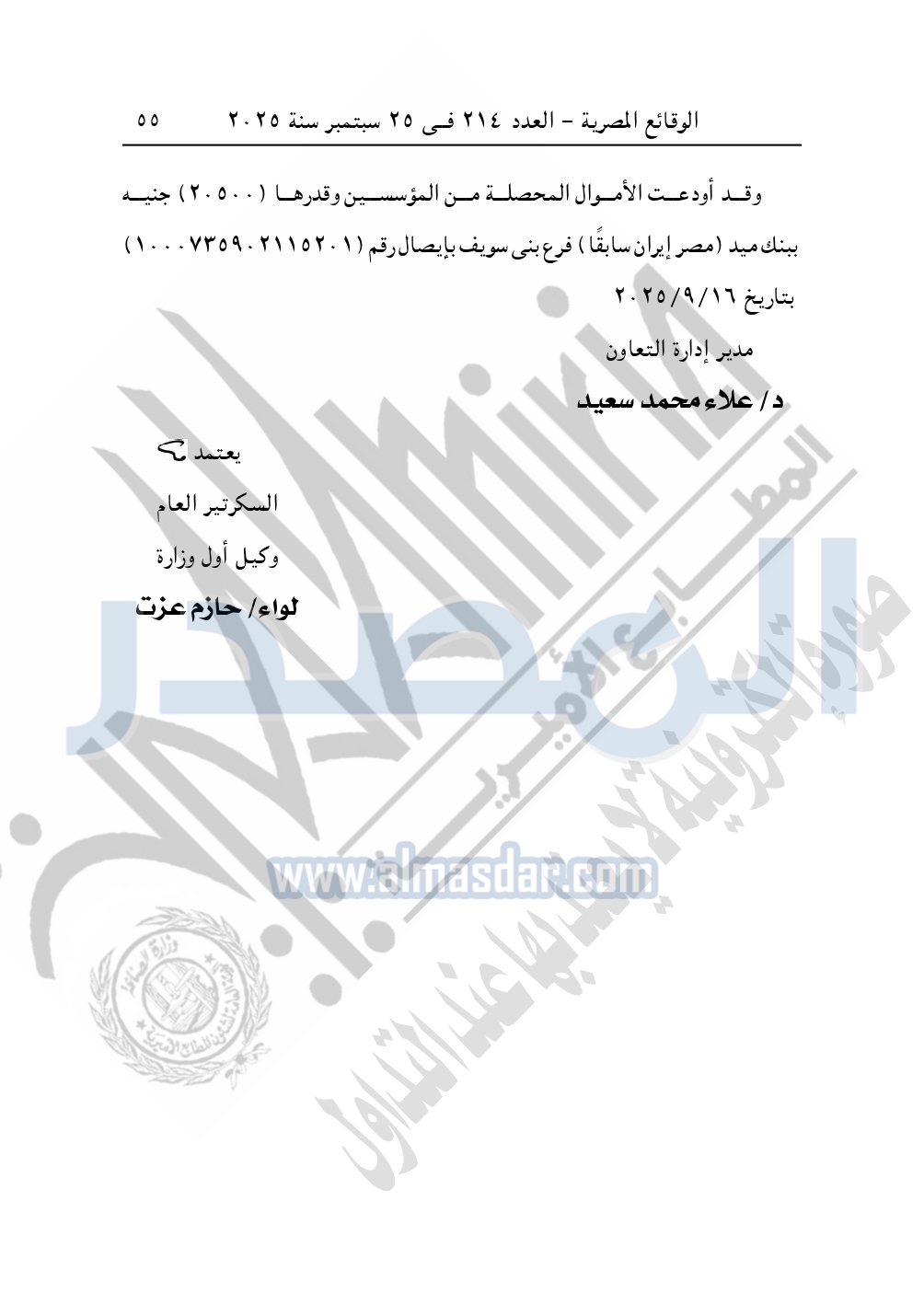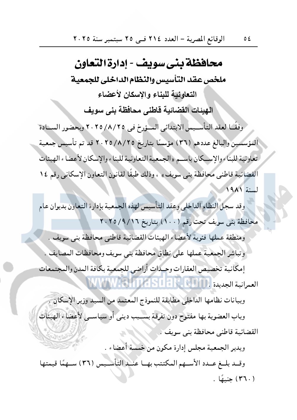 نشرت الوقائع المصرية في العدد 214، بتاريخ 25 سبتمبر 2025، قرار محافظة بنى سويف - إدارة التعاون، بشأن ملخص عقد التأسيس والنظام الداخلى للجمعية التعاونية للبناء والإسكان لأعضاء الهيئات القضائية قاطنى محافظة بني سويف.
