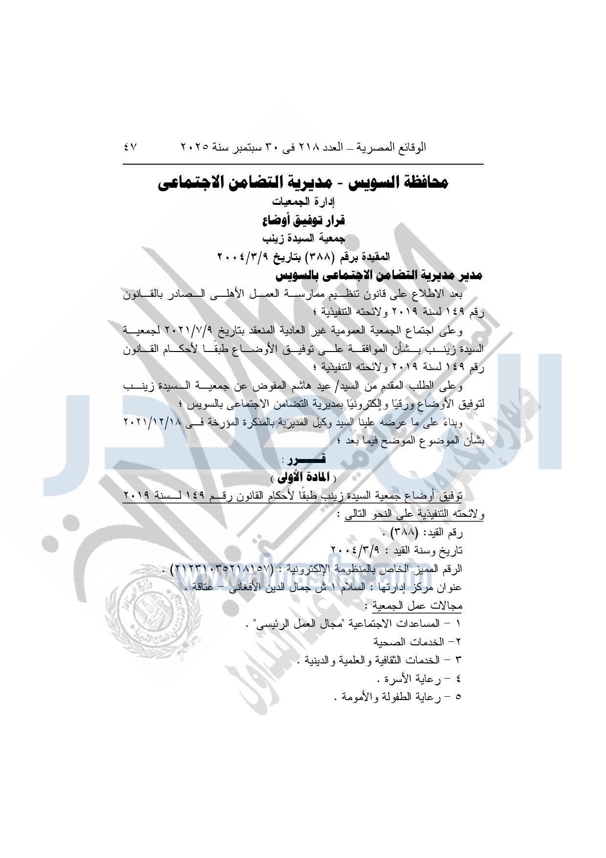 نشرت الوقائع المصرية في العدد 218، في 30 سبتمبر 2025، قرار مديرية التضامن الاجتماعي بالسويس، بشأن توفيق أوضاع جمعية السيدة زينب، المقيدة برقم "388"، بتاريخ 9-3-2004.