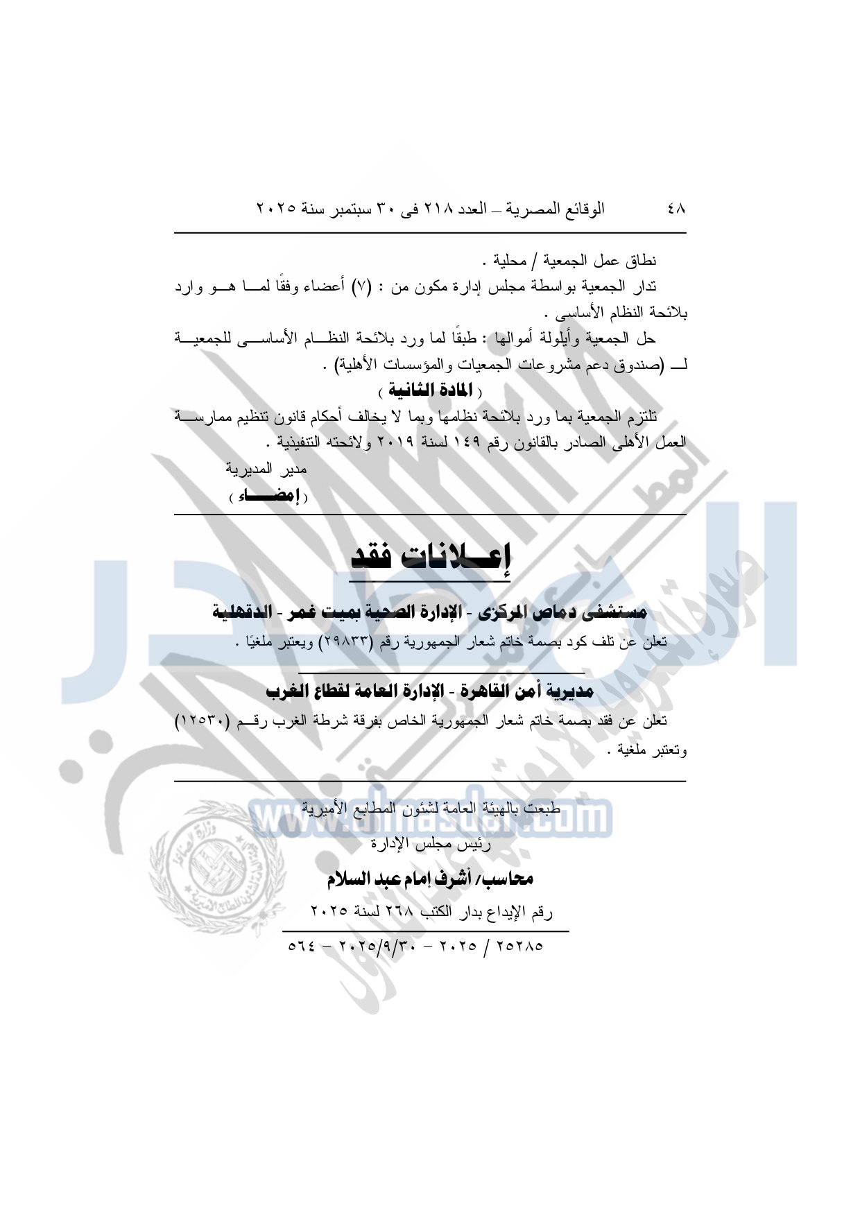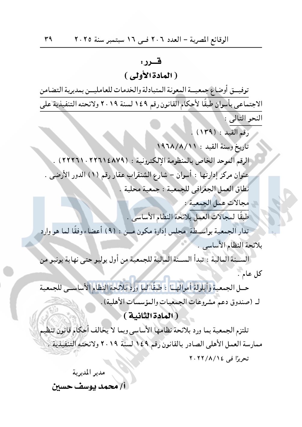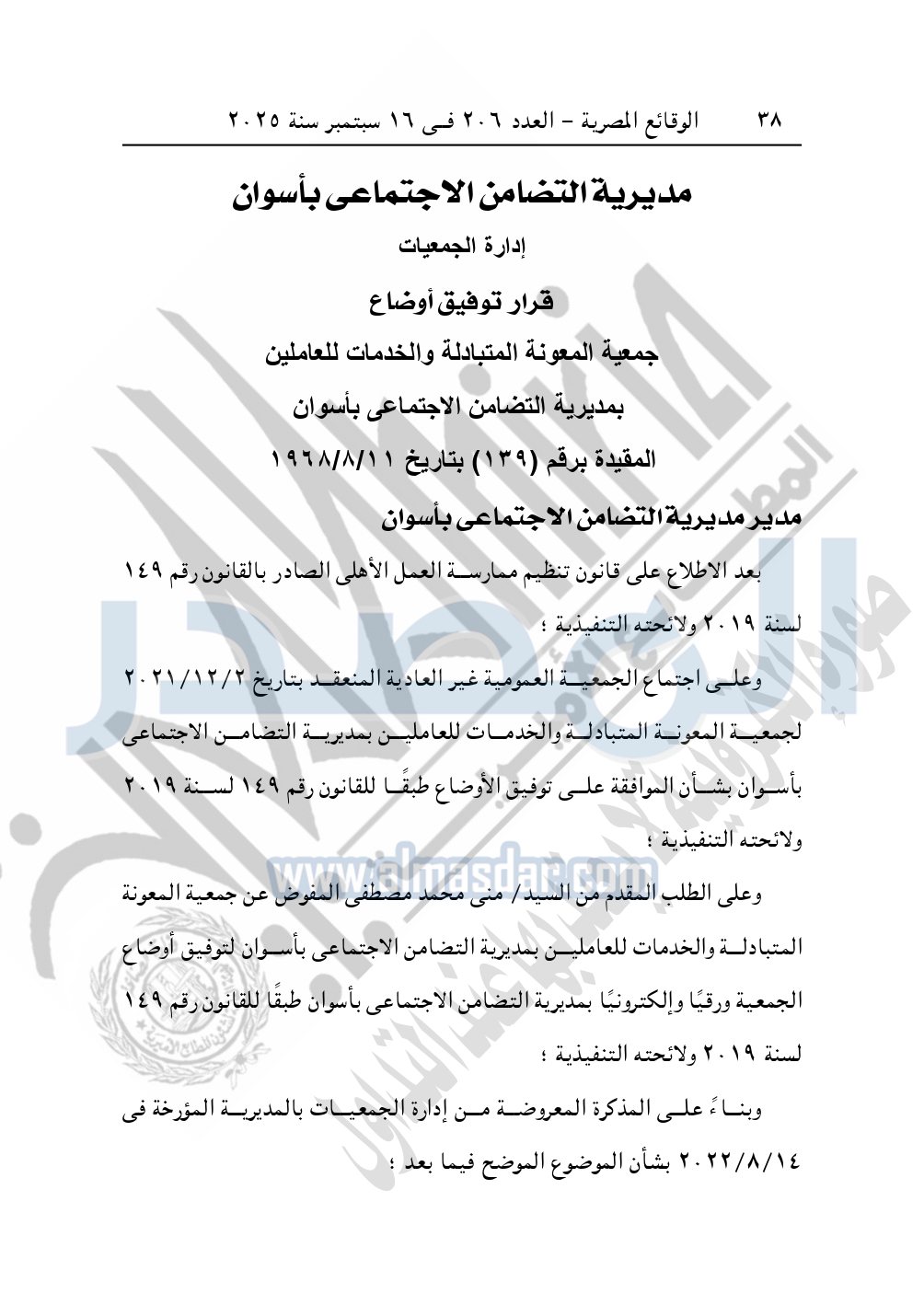 كما نشرت الوقائع المصرية في العدد 206، في 16 سبتمبر 2025، قرار مديرية التضامن الاجتماعي بأسوان، بشأن توفيق أوضاع جمعية المعونة المتبادلة والخدمات للعاملين، المقيدة برقم "139"، بتاريخ 11-8-1968.