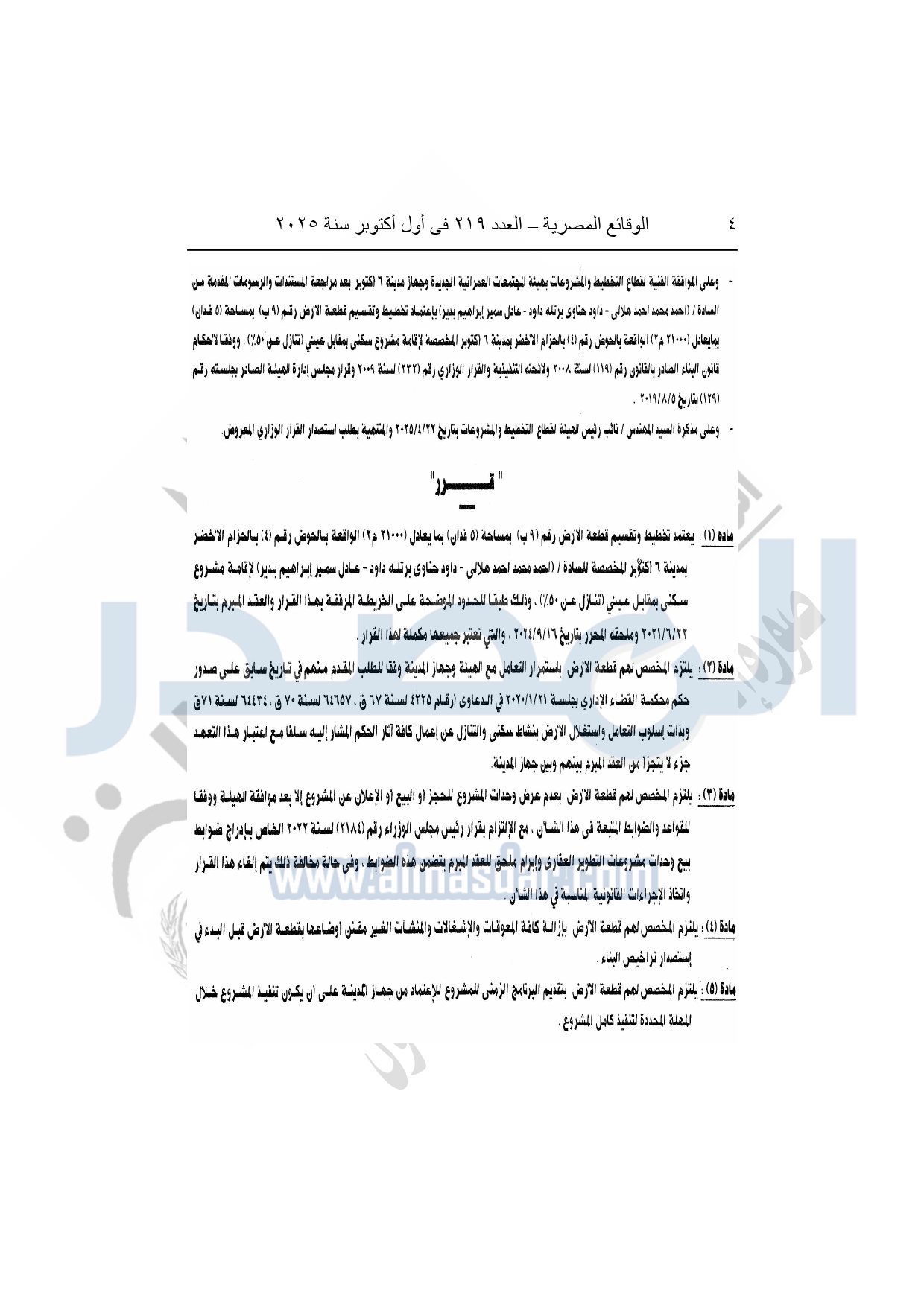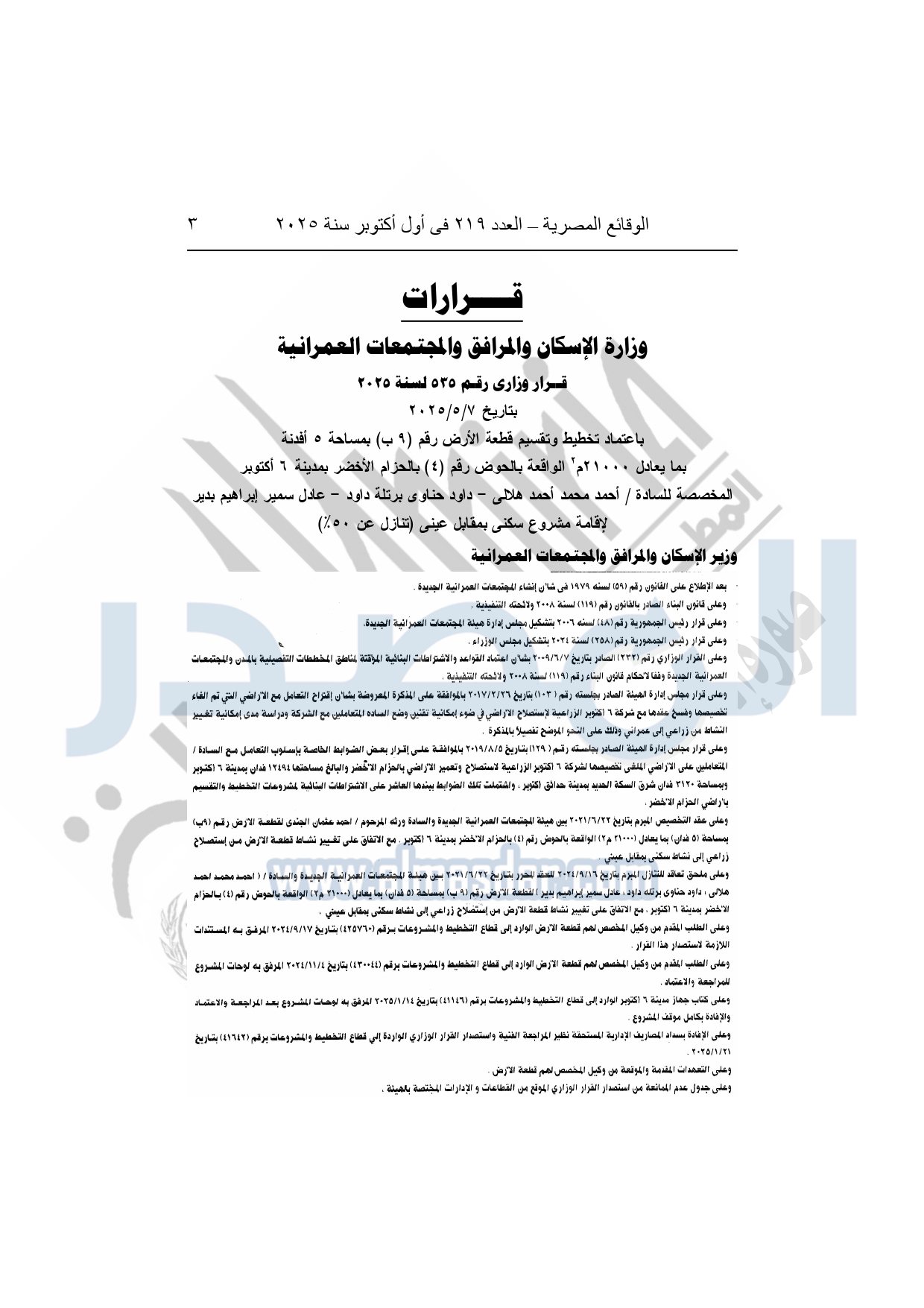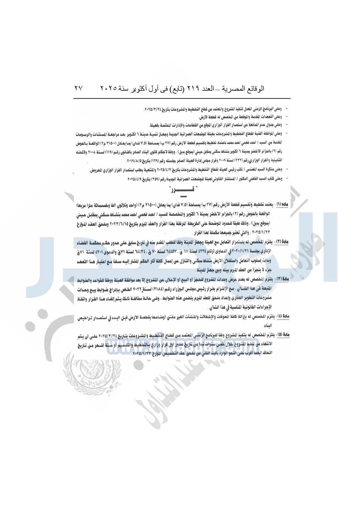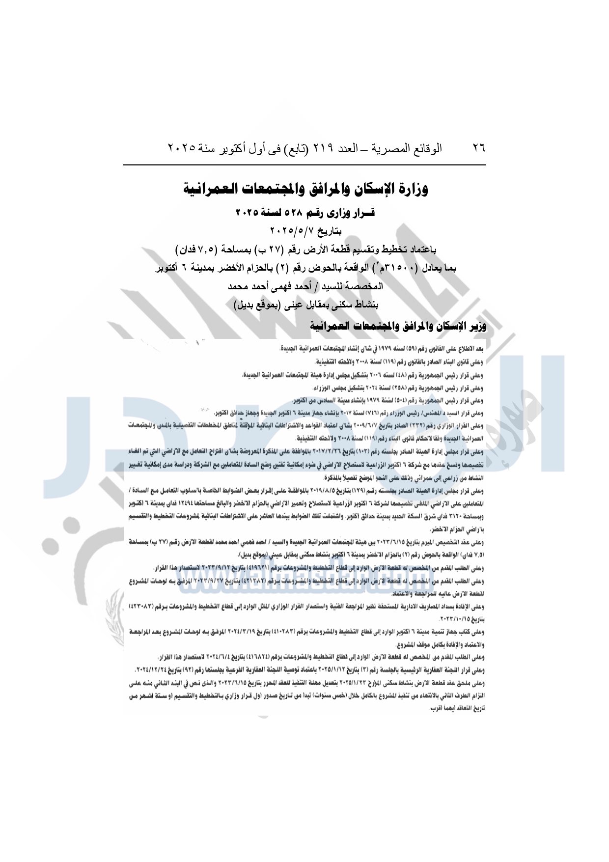 كما نشرت الوقائع المصرية في العدد 219 "تابع"، بتاريخ أول أكتوبر 2025، قرار وزارة الإسكان والمرافق والمجتمعات العمرانية، قرار رقم 528 لسنة 2025، بتاريخ 7-5-2025، بشأن اعتماد تخطيط وتقسيم قطعة الأرض رقم "27 ب" بمساحة "7.5 فدان" بما يعادل "31500م2" الواقعة بالحوض رقم "2" بالحزام الأخضر بمدينة 6 أكتوبر المخصصة لـ أحمد فهمى أحمد محمد بنشاط سكنى بمقابل عينى "بموقع بديل".