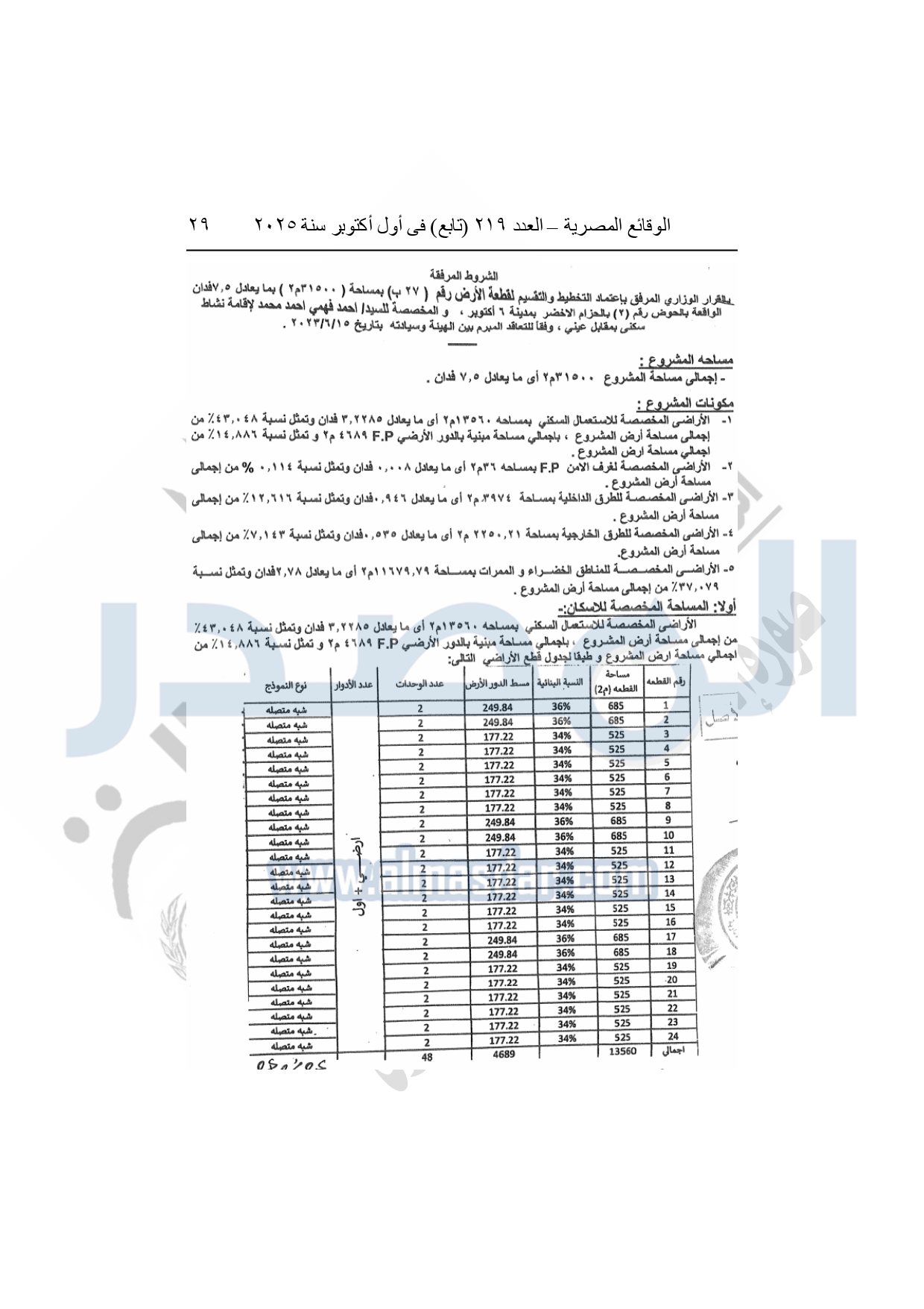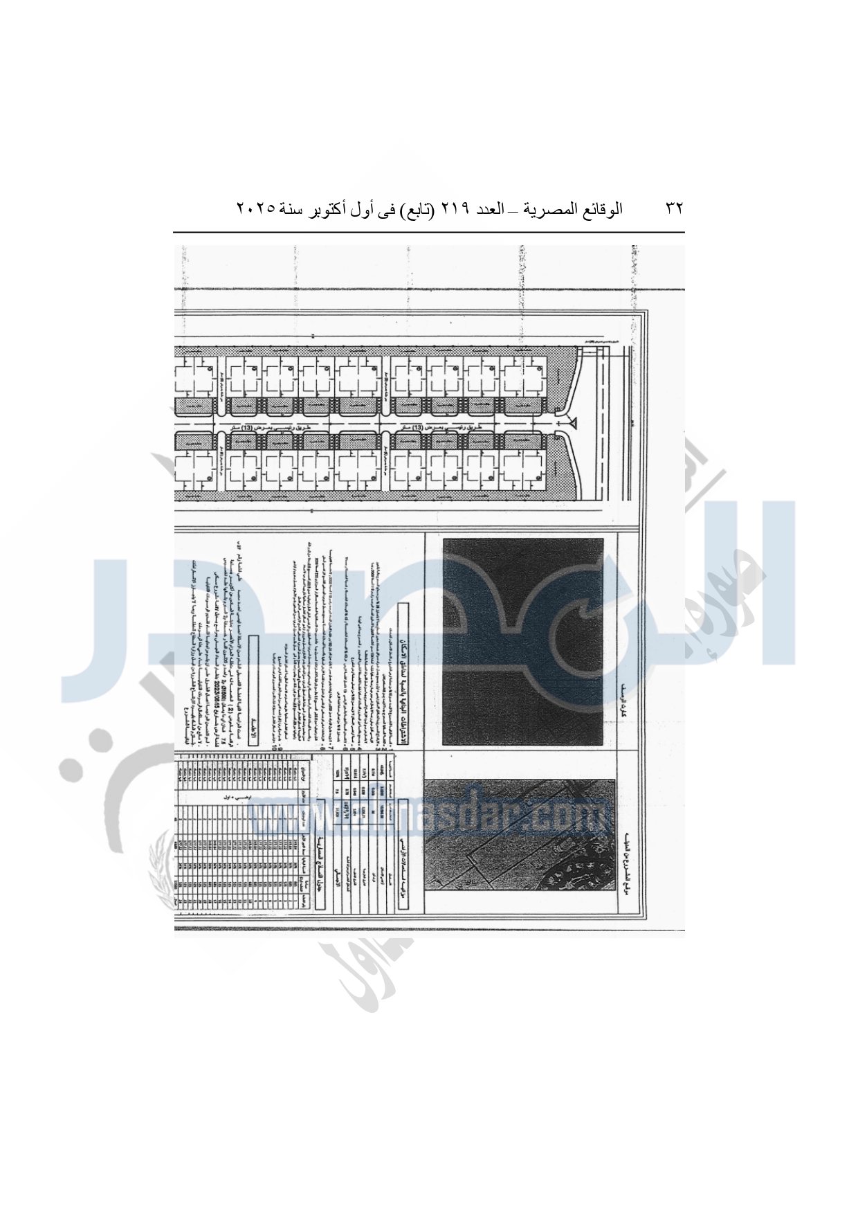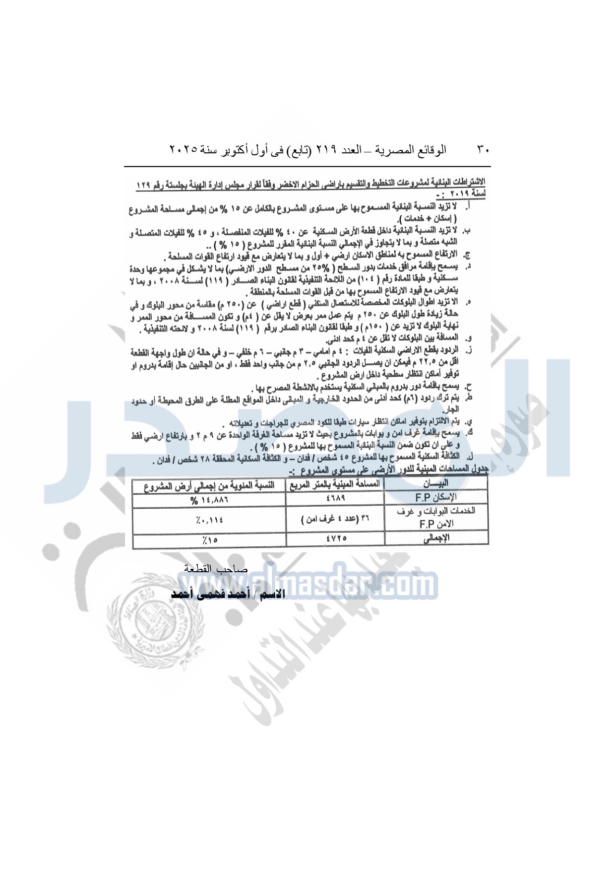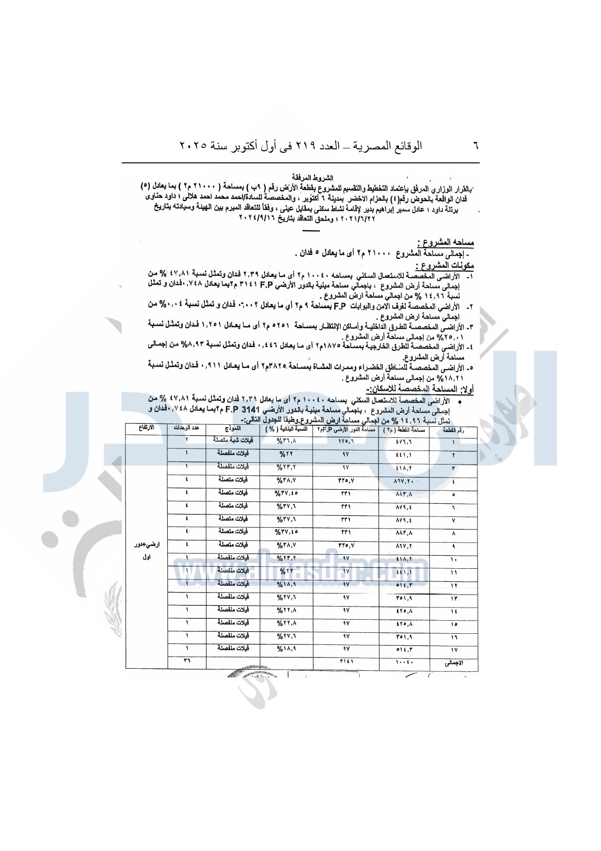 كما نشرت الوقائع المصرية في العدد 219 "تابع"، بتاريخ أول أكتوبر 2025، قرار وزارة الإسكان والمرافق والمجتمعات العمرانية، قرار رقم 528 لسنة 2025، بتاريخ 7-5-2025، بشأن اعتماد تخطيط وتقسيم قطعة الأرض رقم "27 ب" بمساحة "7.5 فدان" بما يعادل "31500م2" الواقعة بالحوض رقم "2" بالحزام الأخضر بمدينة 6 أكتوبر المخصصة لـ أحمد فهمى أحمد محمد بنشاط سكنى بمقابل عينى "بموقع بديل".