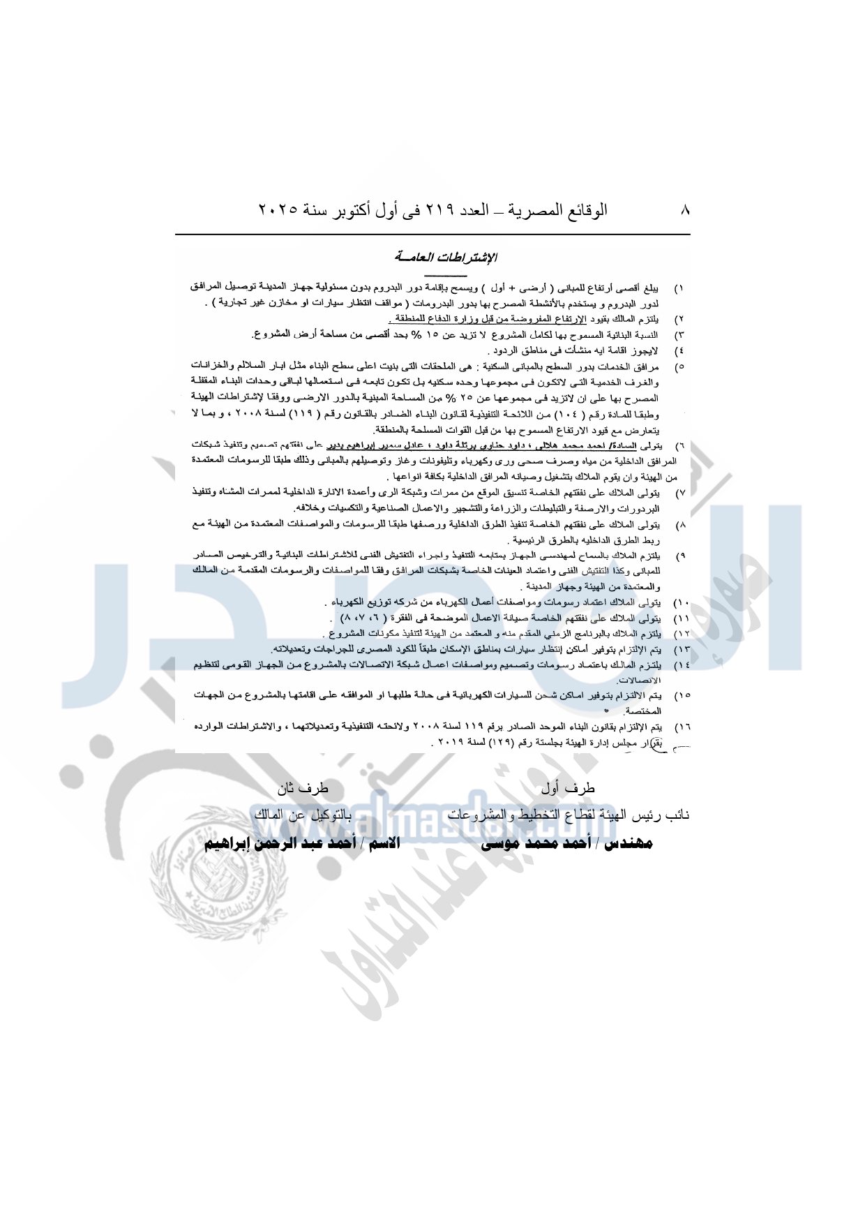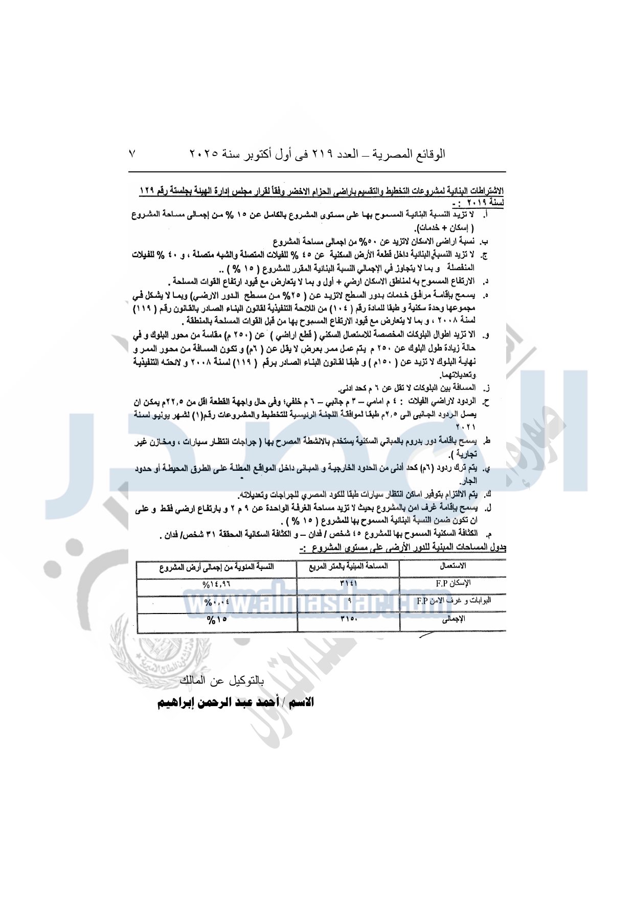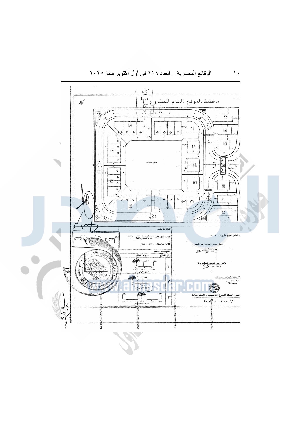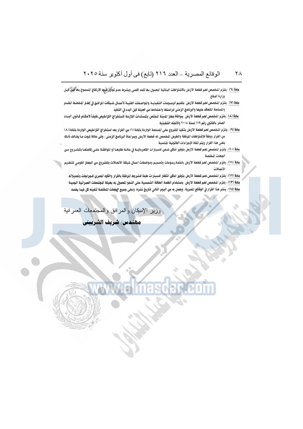 كما نشرت الوقائع المصرية في العدد 219 "تابع"، بتاريخ أول أكتوبر 2025، قرار وزارة الإسكان والمرافق والمجتمعات العمرانية، قرار رقم 528 لسنة 2025، بتاريخ 7-5-2025، بشأن اعتماد تخطيط وتقسيم قطعة الأرض رقم "27 ب" بمساحة "7.5 فدان" بما يعادل "31500م2" الواقعة بالحوض رقم "2" بالحزام الأخضر بمدينة 6 أكتوبر المخصصة لـ أحمد فهمى أحمد محمد بنشاط سكنى بمقابل عينى "بموقع بديل".
