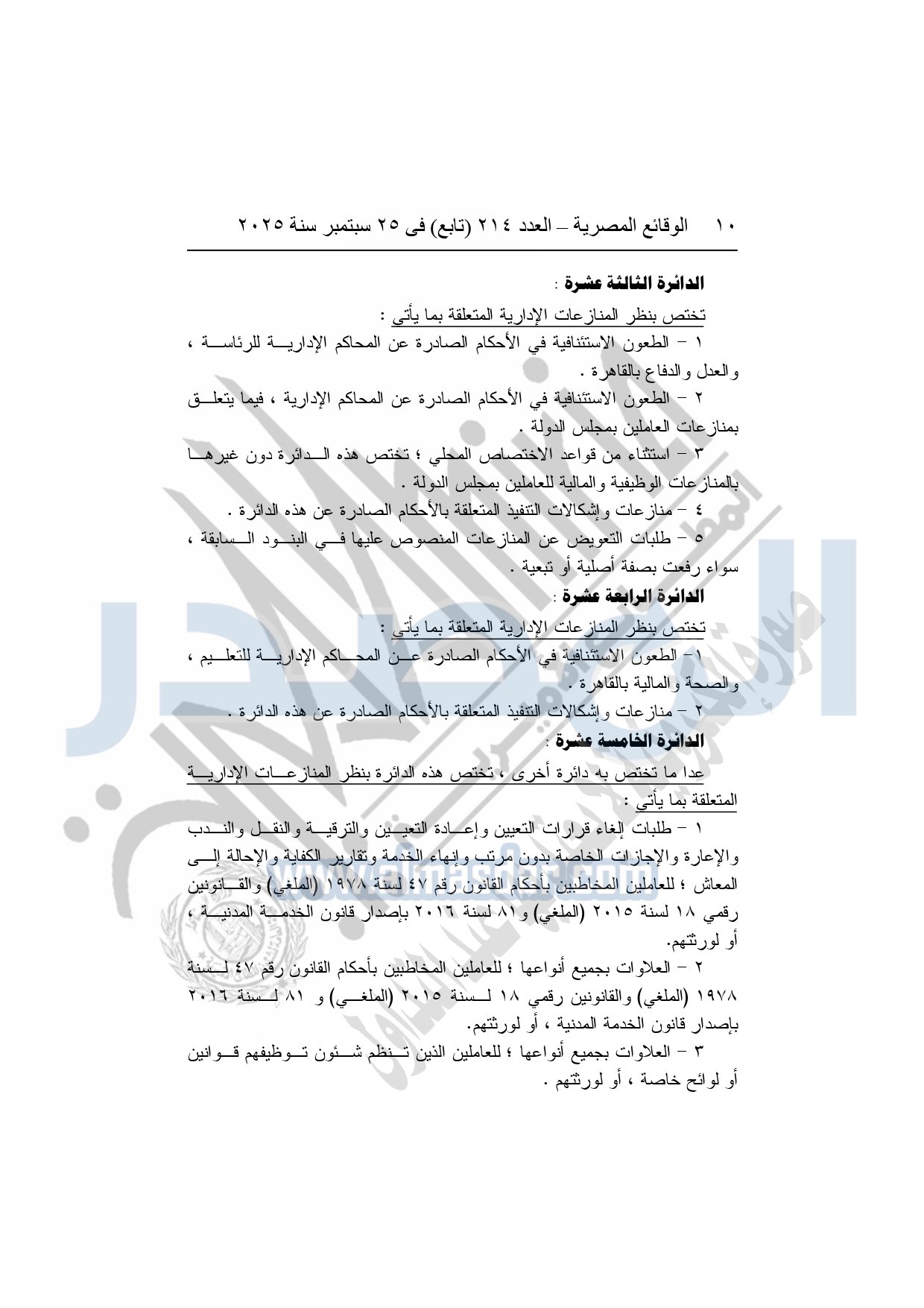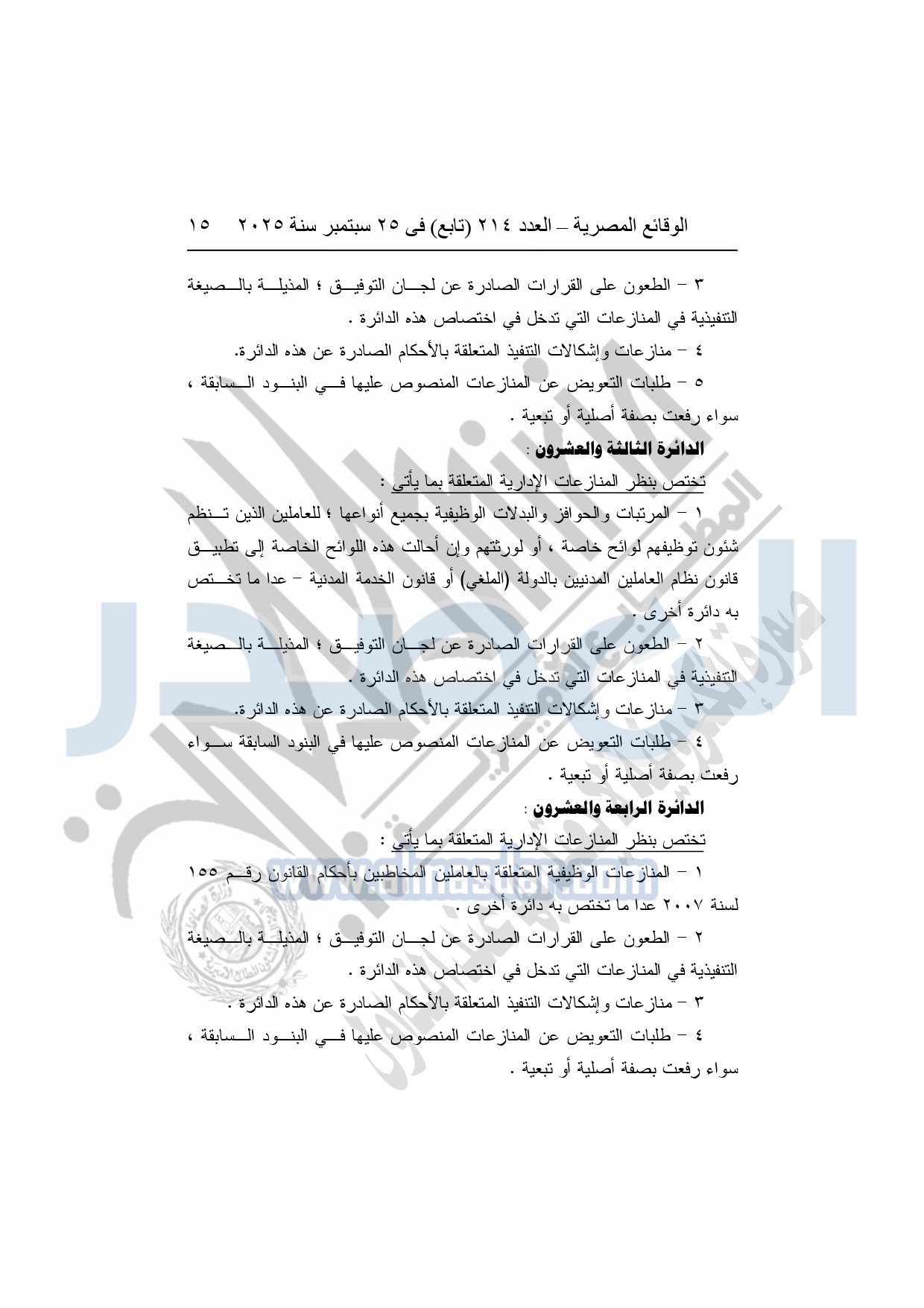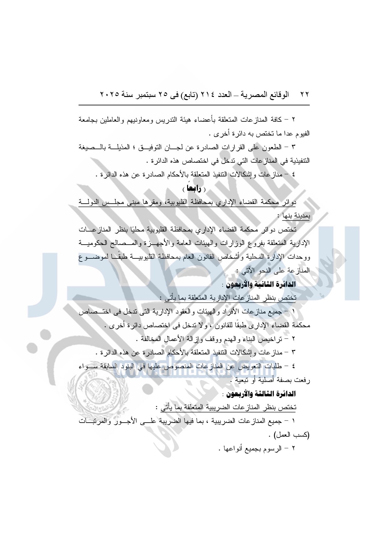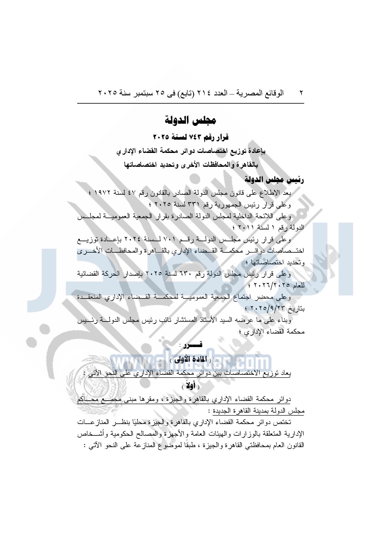 نشرت الوقائع المصرية في العدد 214 "تابع" الصادر في 25 سبتمبر سنة 2025، مجلس الدولة، قرار رقم 743 لسنة 2025، بإعادة توزيع اختصاصات دوائر محكمة القضاء الإداري بالقاهرة والمحافظات الأخرى وتحديد اختصاصاتها.