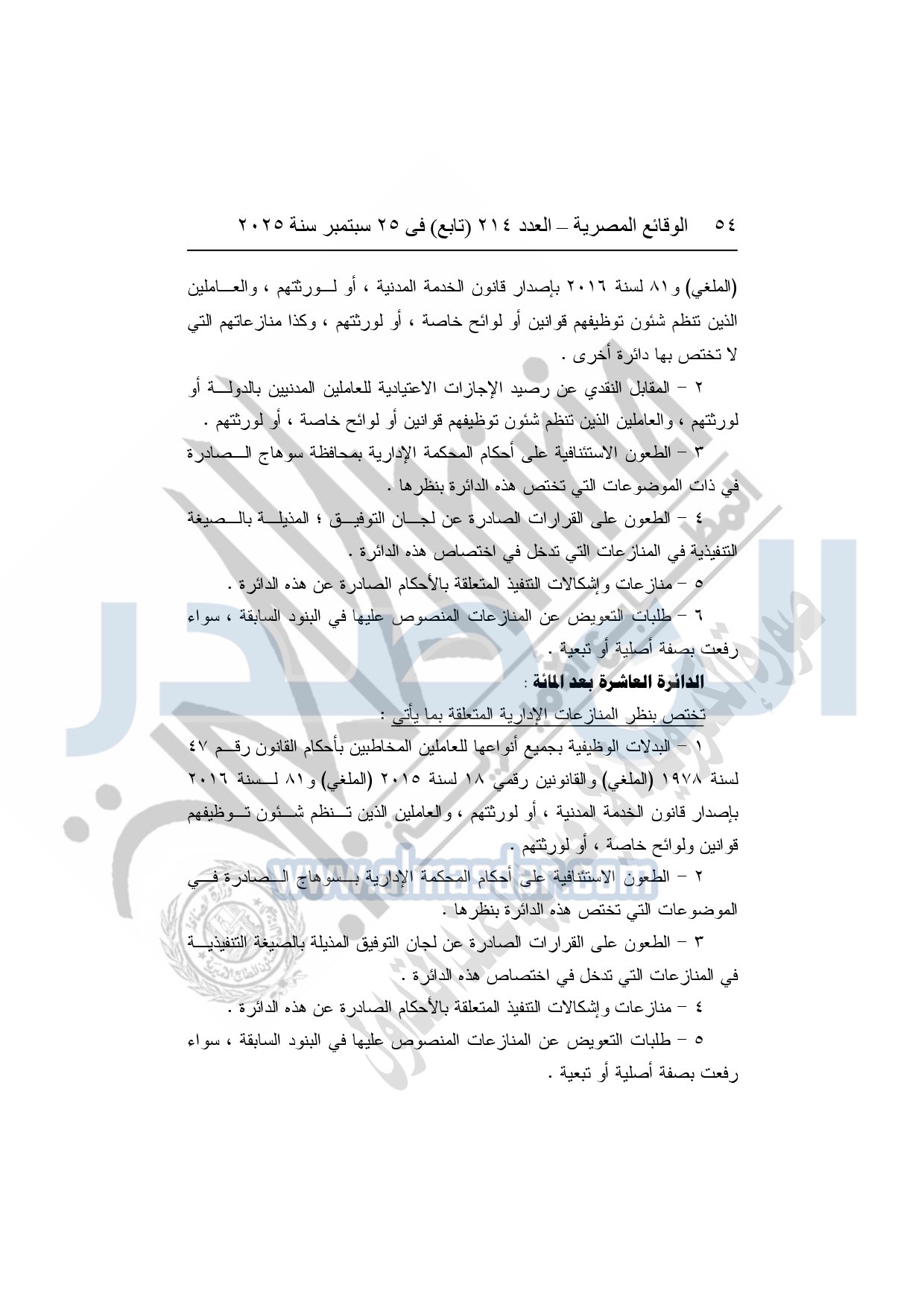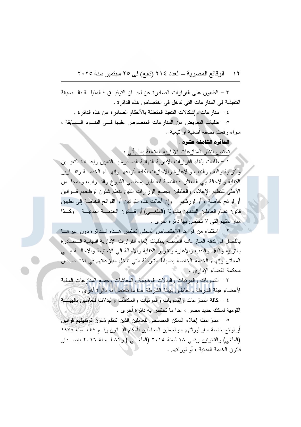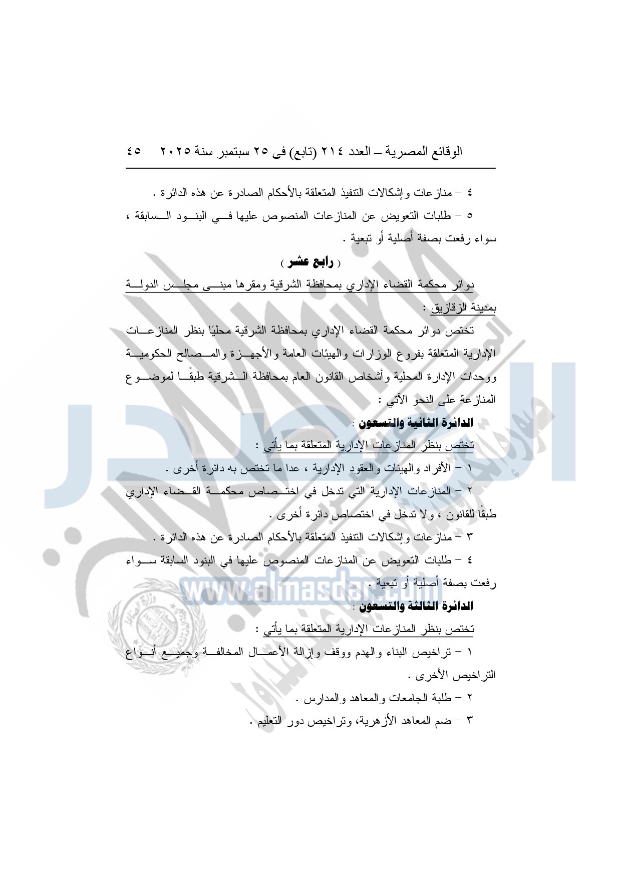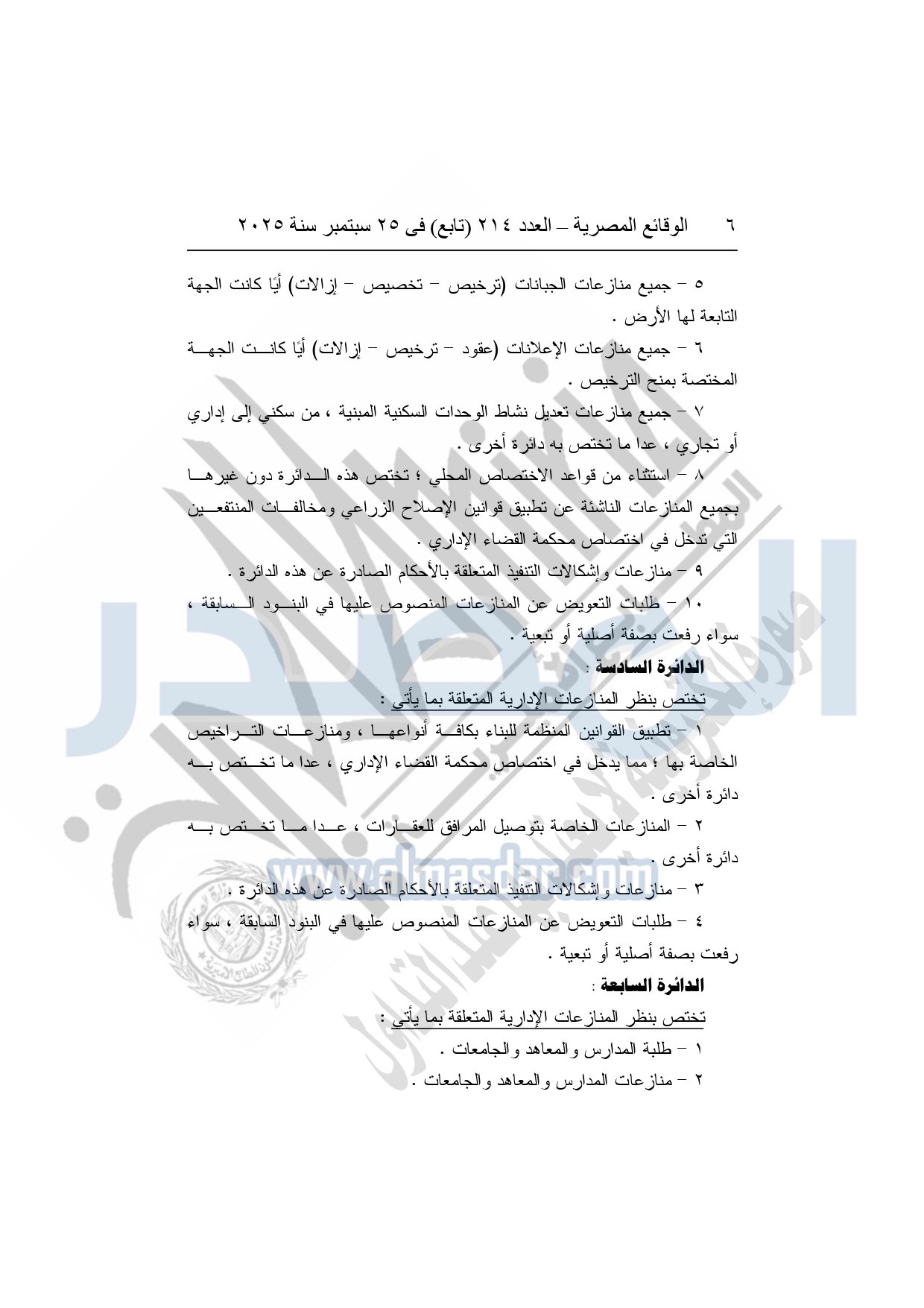 نشرت الوقائع المصرية في العدد 214 "تابع" الصادر في 25 سبتمبر سنة 2025، مجلس الدولة، قرار رقم 743 لسنة 2025، بإعادة توزيع اختصاصات دوائر محكمة القضاء الإداري بالقاهرة والمحافظات الأخرى وتحديد اختصاصاتها.
