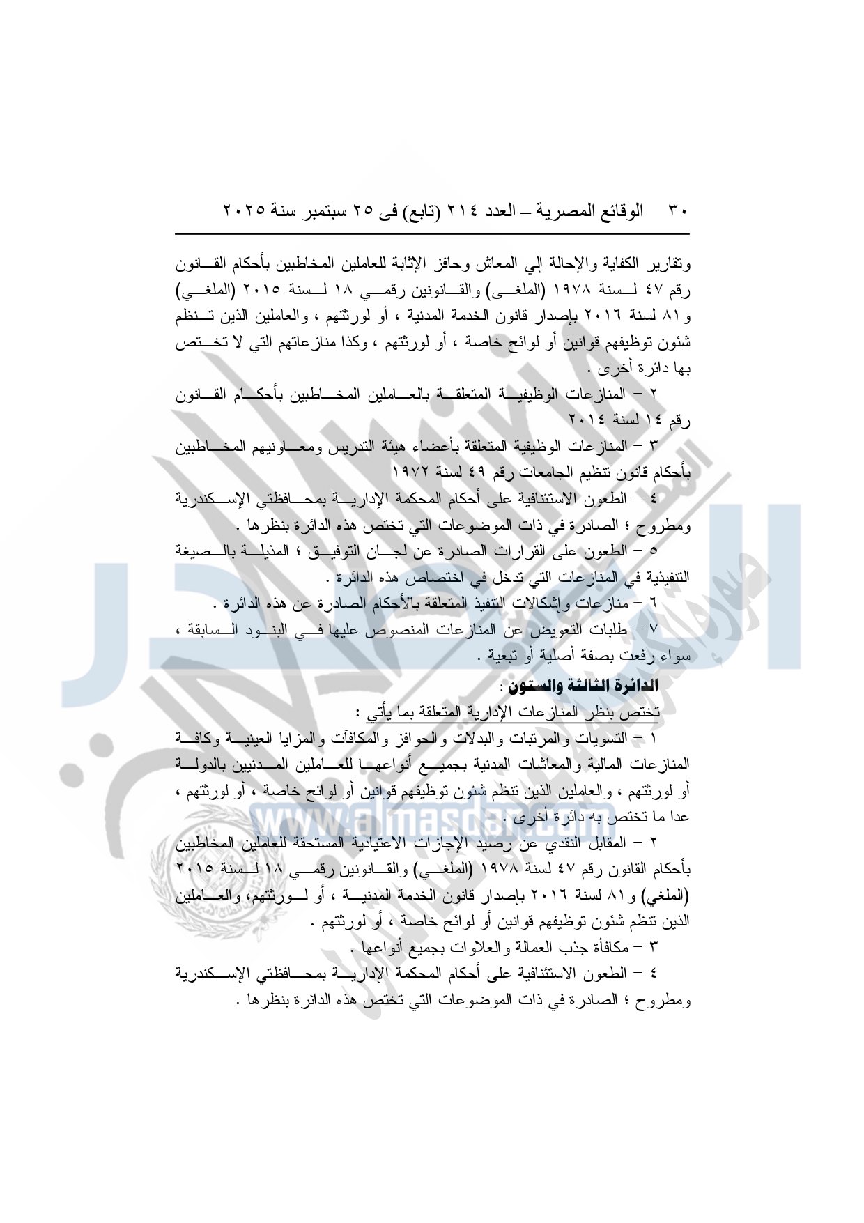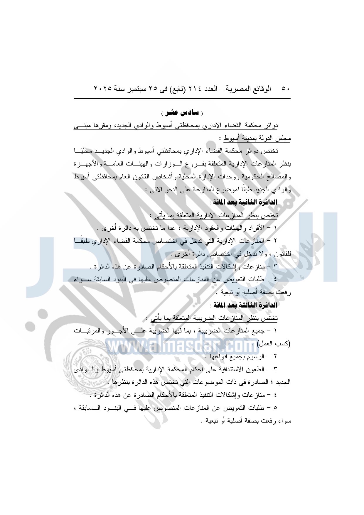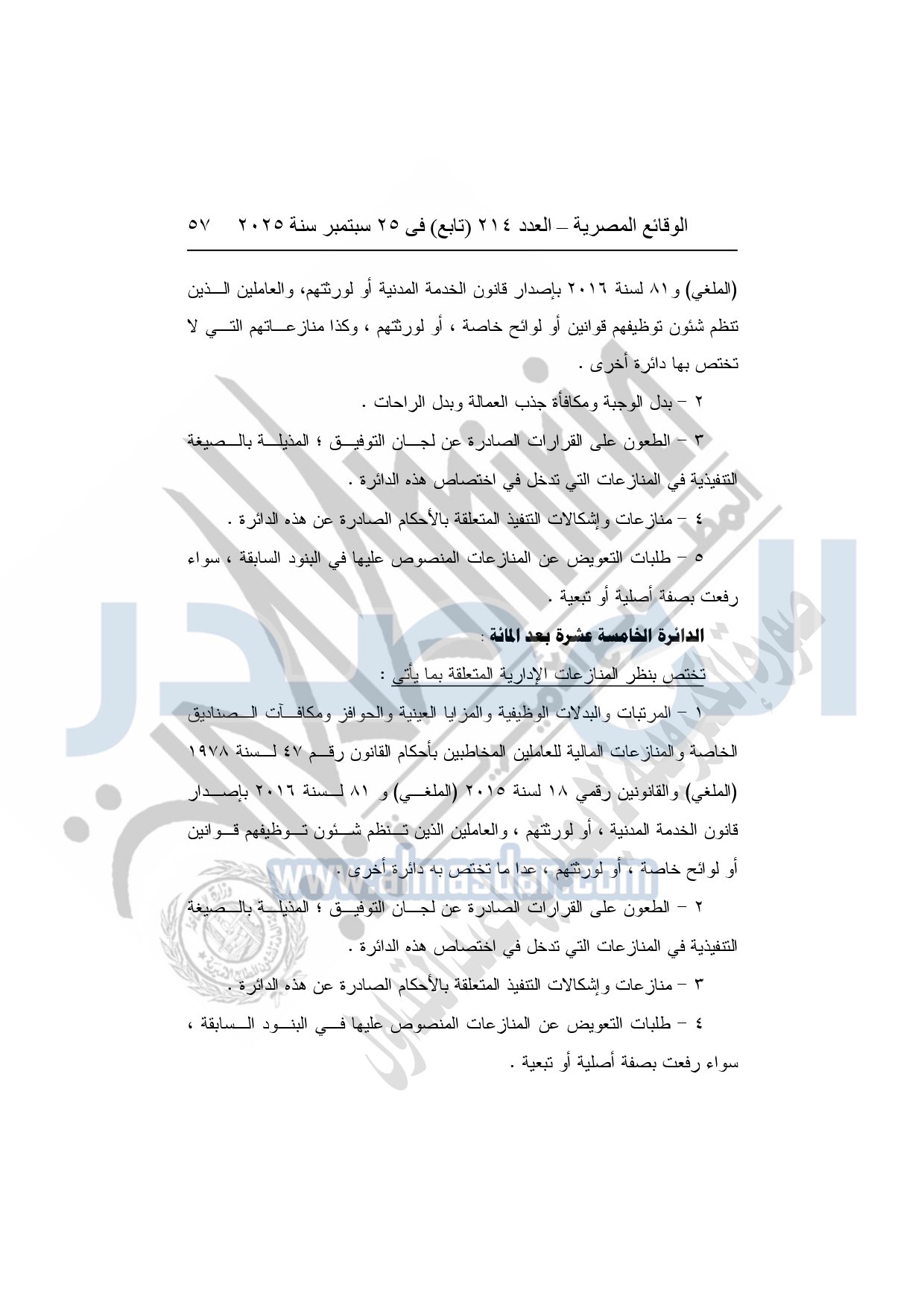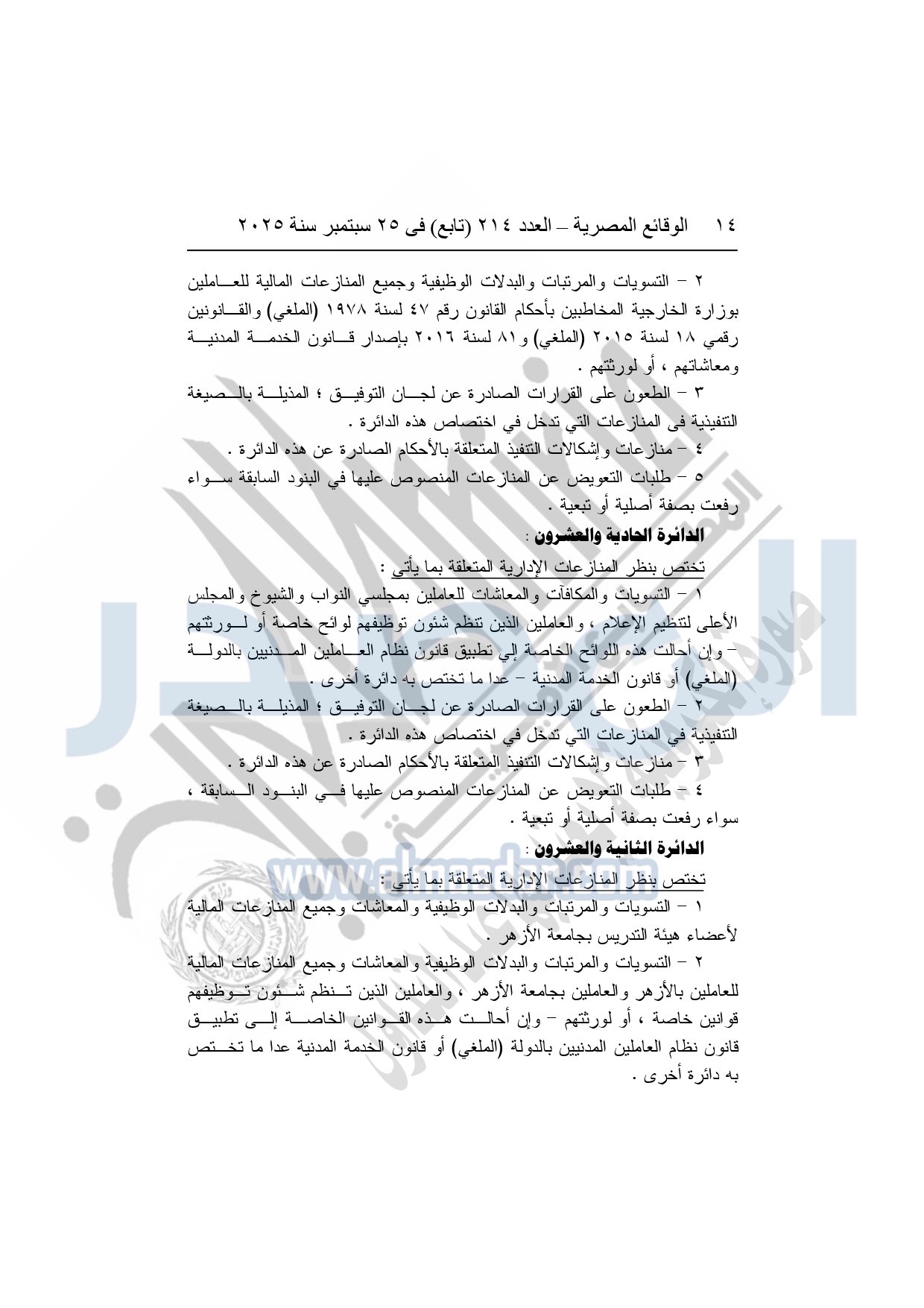 نشرت الوقائع المصرية في العدد 214 "تابع" الصادر في 25 سبتمبر سنة 2025، مجلس الدولة، قرار رقم 743 لسنة 2025، بإعادة توزيع اختصاصات دوائر محكمة القضاء الإداري بالقاهرة والمحافظات الأخرى وتحديد اختصاصاتها.