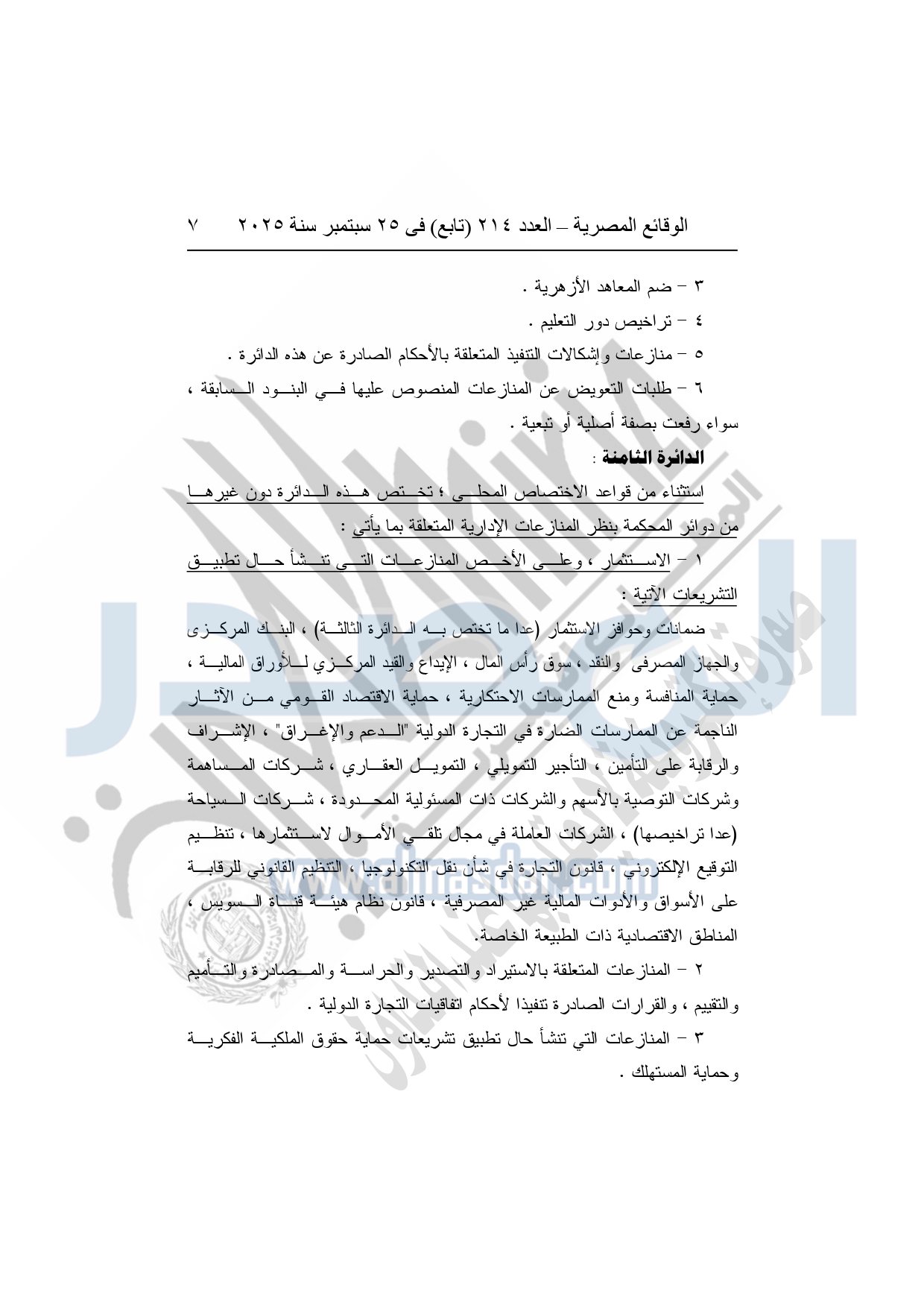 7- منازعات وإشكالات التنفيذ المتعلقة بالأحكام الصادرة عن هذه الدائرة.
