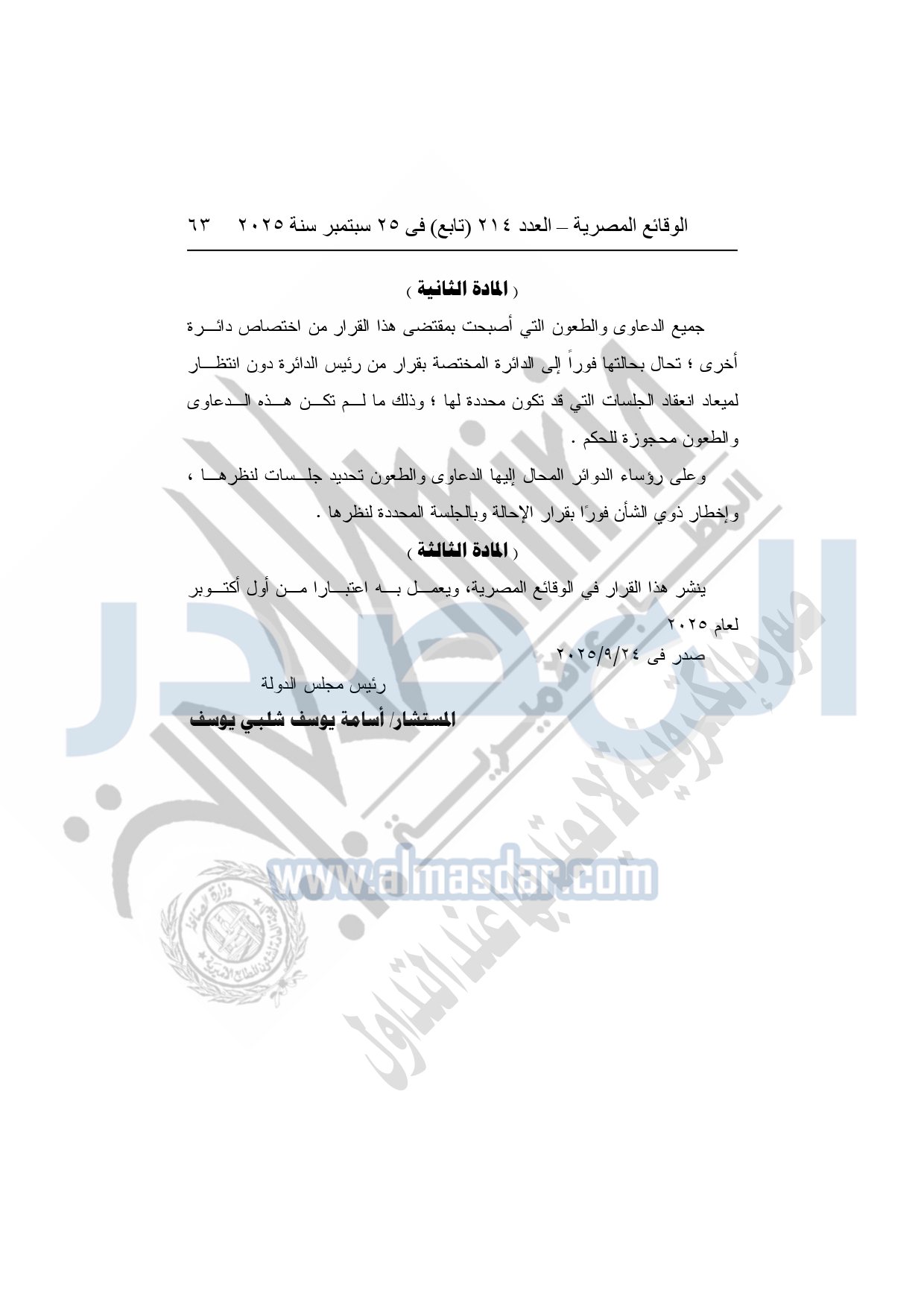 وعلى قرار رئيس مجلس الدولة رقم 701 لسنة 2024 بإعادة توزيع اختصاصات دوائر محكمة القضاء الإداري بالقاهرة والمحافظات الأخرى وتحديد اختصاصاتها؛ وعلى قرار رئيس مجلس الدولة رقم 630 لسنة 2025 بإصدار الحركة القضائية للعام 2025-2026.