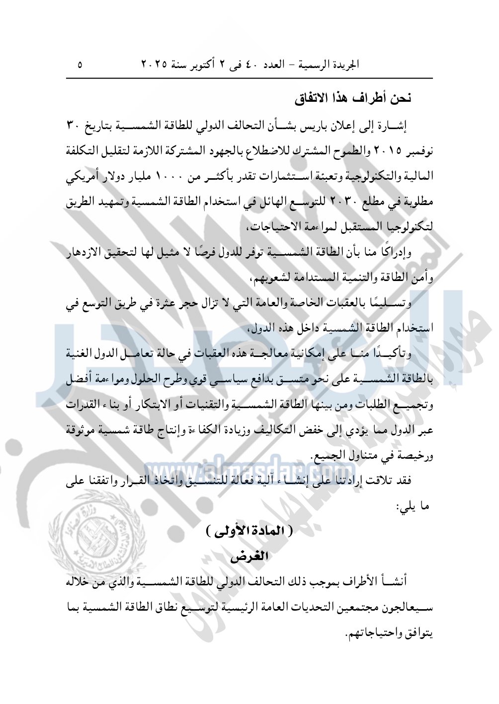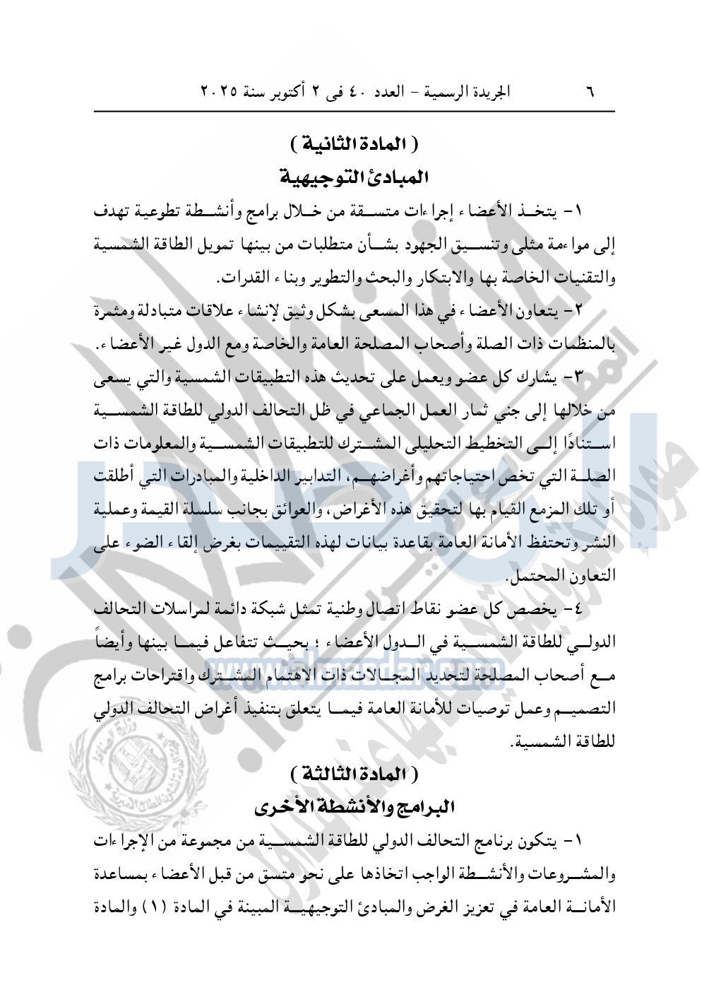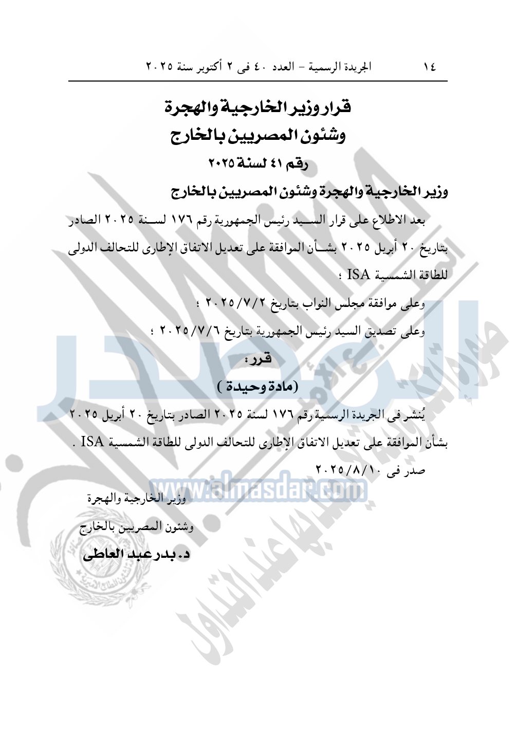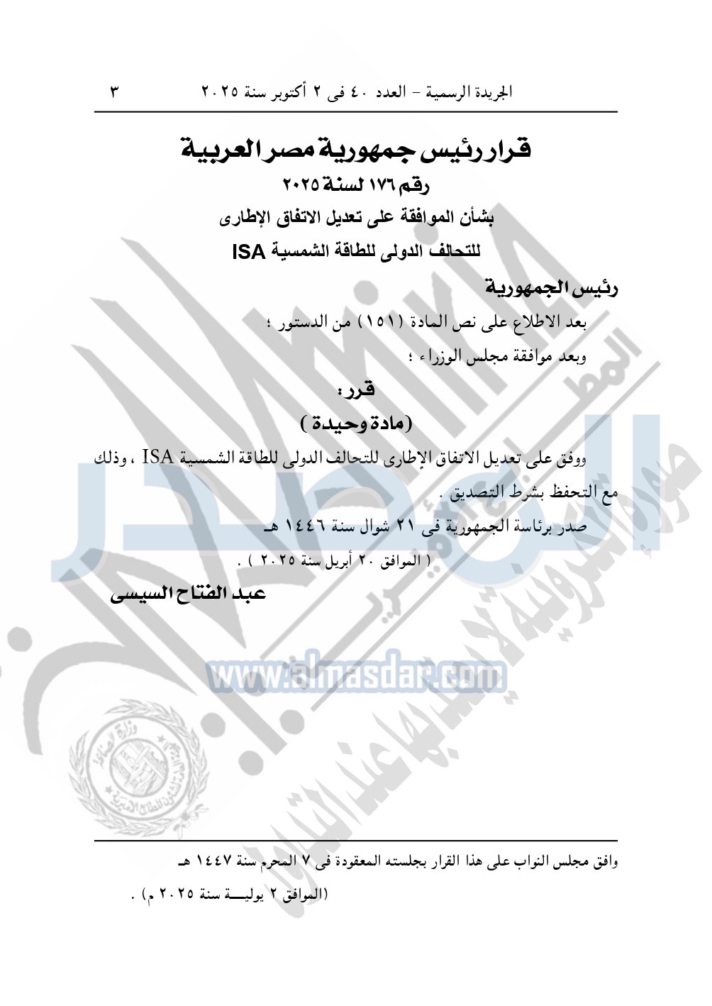 نشرت الجريدة الرسمية في العدد 40، بتاريخ 2 أكتوبر 2025، قرار رئيس جمهورية مصر العربية، رقم 176 لسنة 2025، بشأن الموافقة على تعديل الاتفاق الإطاري للتحالف الدولي للطاقة الشمسية ISA.