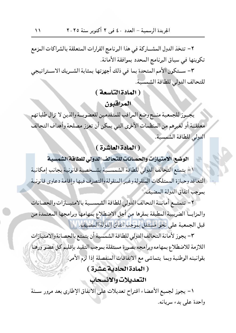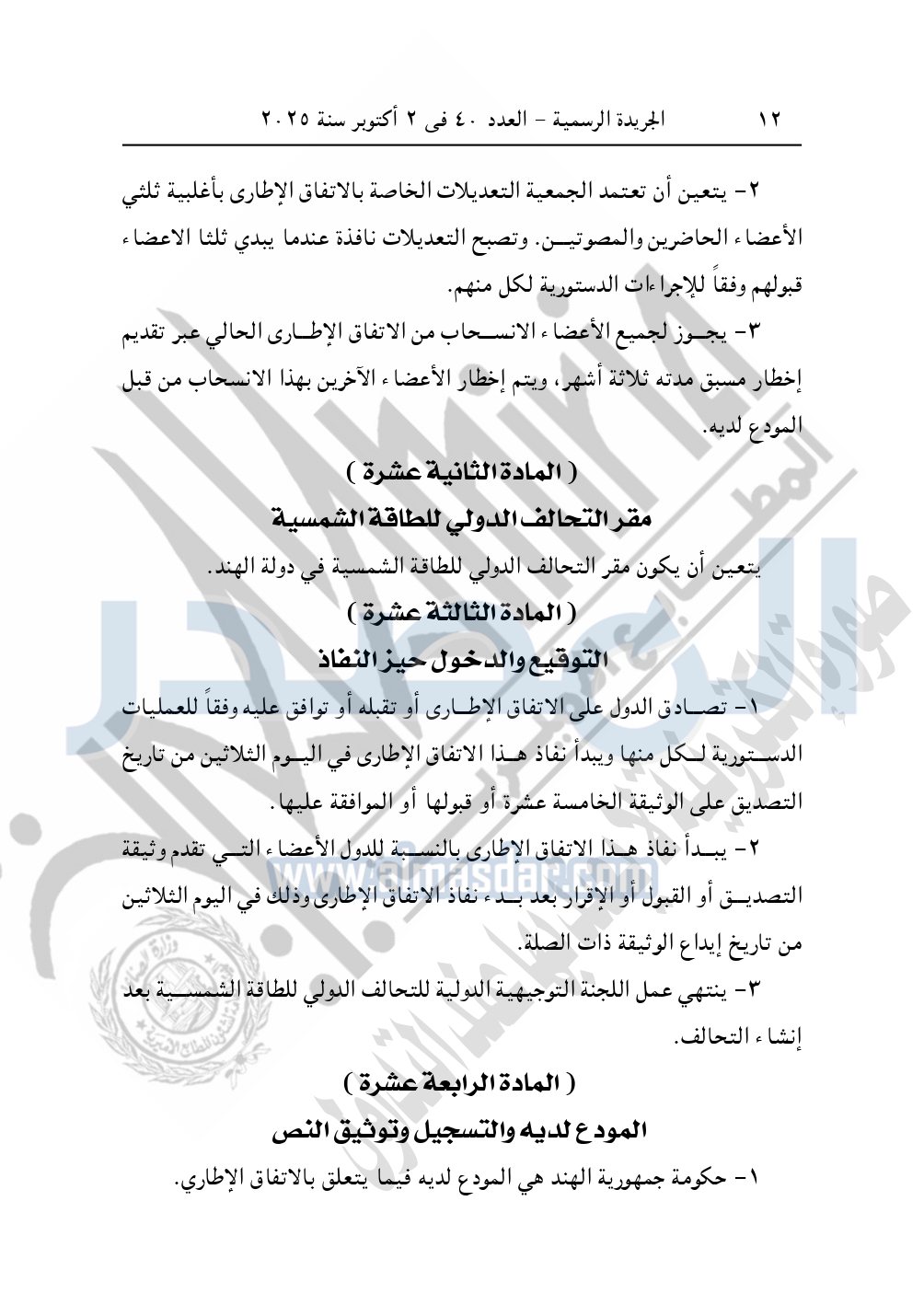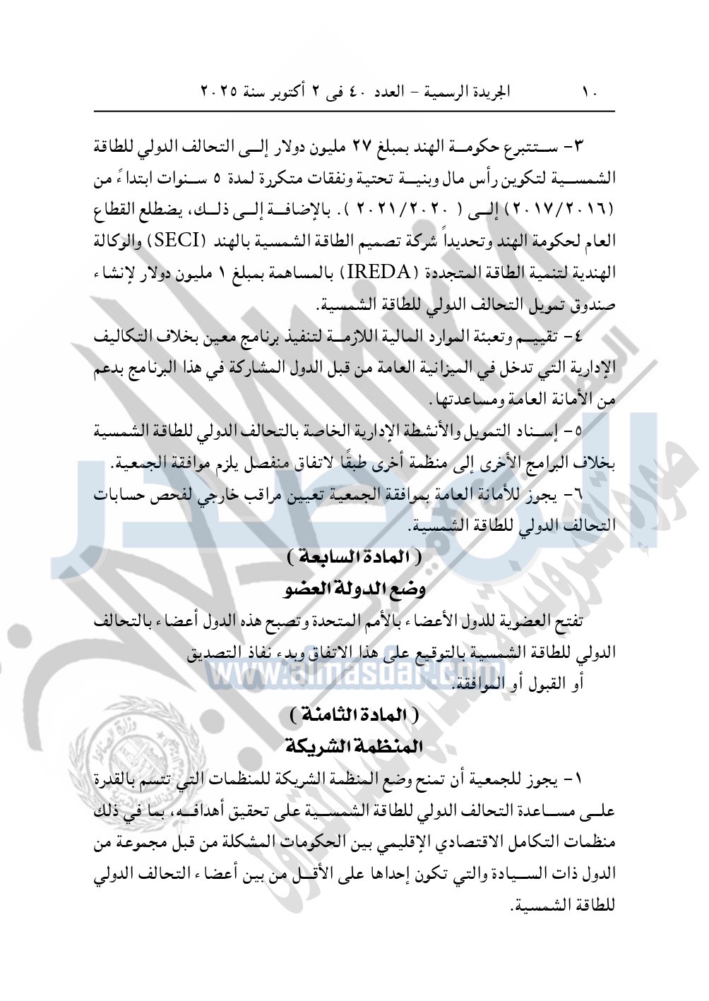 نشرت الجريدة الرسمية في العدد 40، بتاريخ 2 أكتوبر 2025، قرار رئيس جمهورية مصر العربية، رقم 176 لسنة 2025، بشأن الموافقة على تعديل الاتفاق الإطاري للتحالف الدولي للطاقة الشمسية ISA.