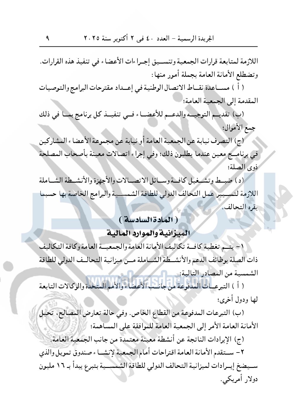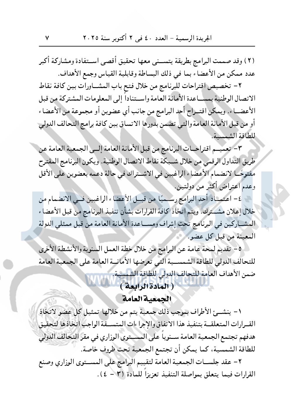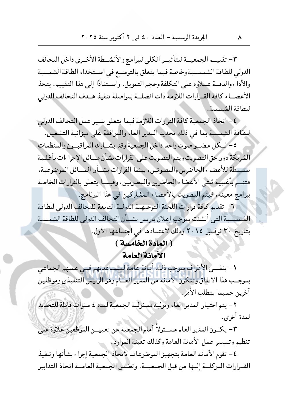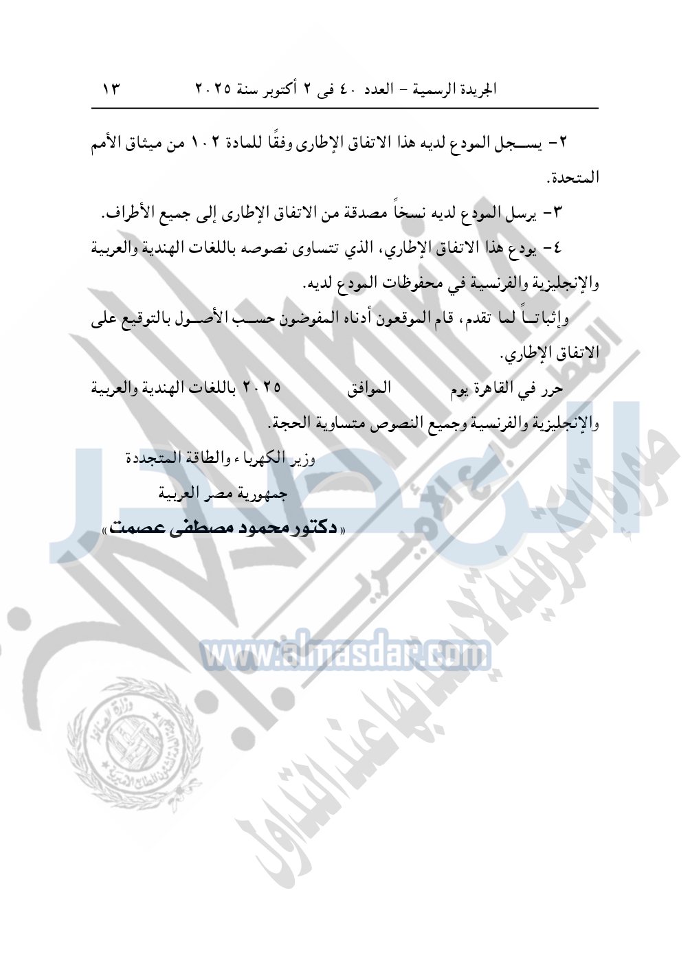نشرت الجريدة الرسمية في العدد 40، بتاريخ 2 أكتوبر 2025، قرار رئيس جمهورية مصر العربية، رقم 176 لسنة 2025، بشأن الموافقة على تعديل الاتفاق الإطاري للتحالف الدولي للطاقة الشمسية ISA.