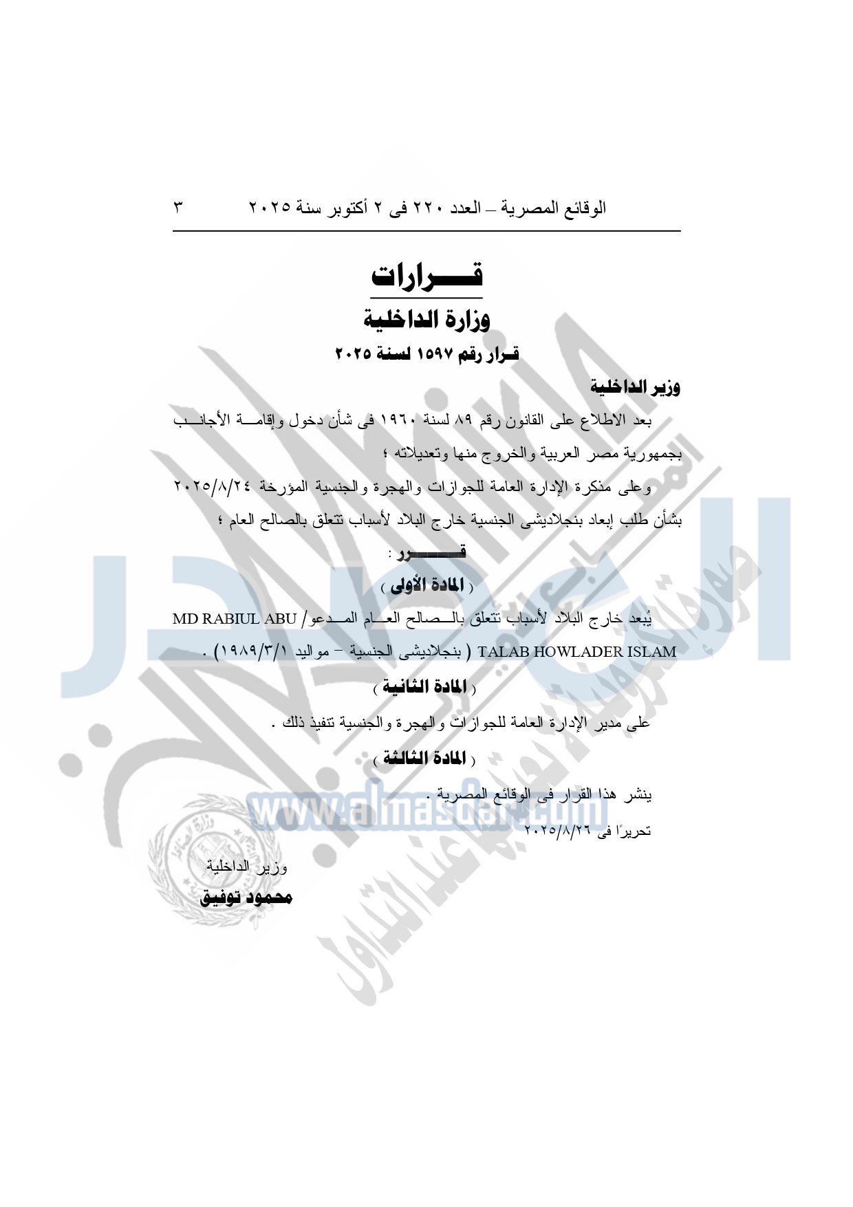 نشرت الوقائع المصرية في العدد 220، الصادر في 2 أكتوبر سنة 2025، قرار وزارة الداخلية قرار رقم 1597 لسنة 2025، بشأن إبعاد شخص بنجلاديشى خارج البلاد.