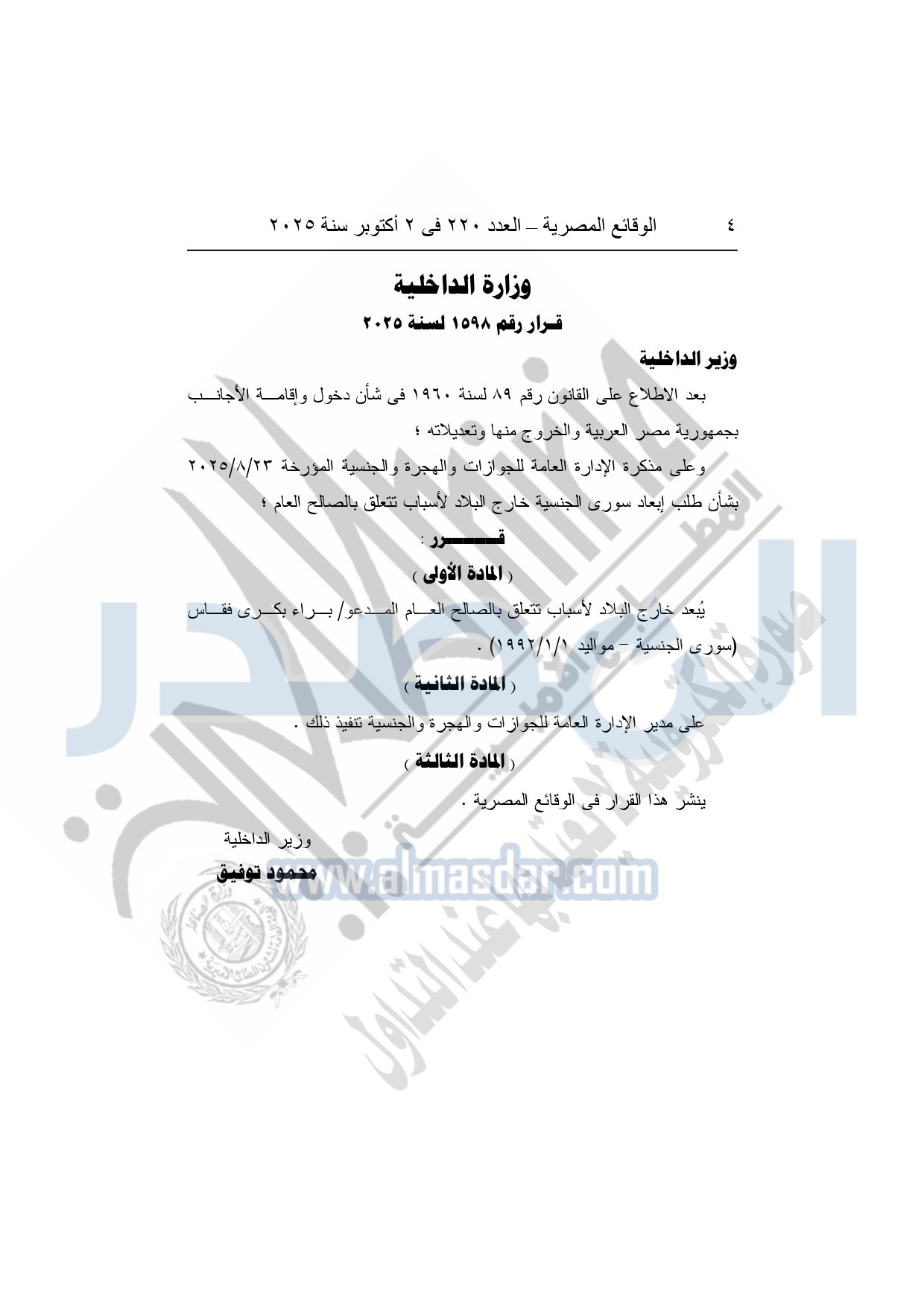 كما نشرت الوقائع المصرية في العدد 220، الصادر في 2 أكتوبر سنة 2025، قرار وزارة الداخلية قرار رقم 1598 لسنة 2025، بشأن إبعاد شخص سوري خارج البلاد.