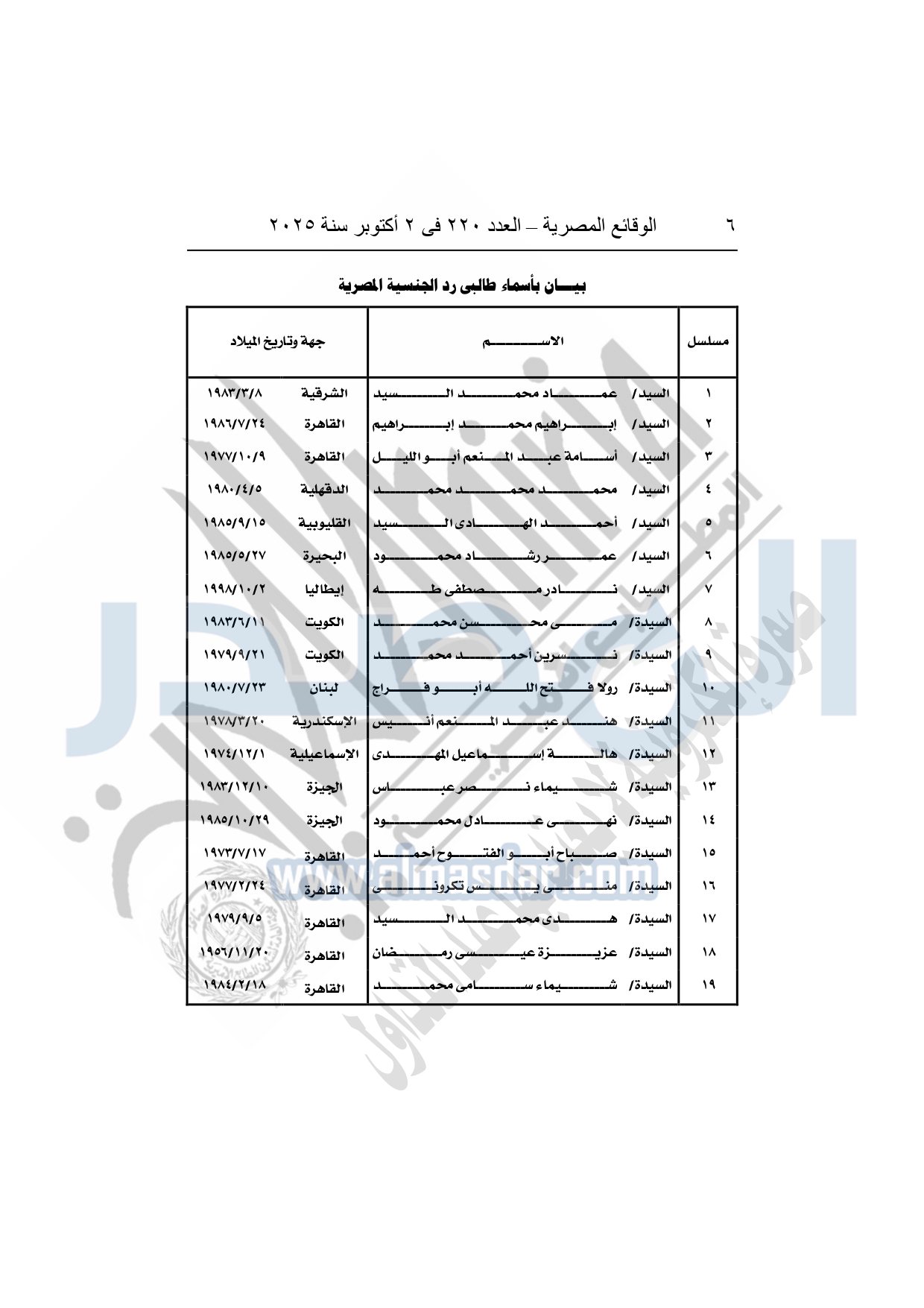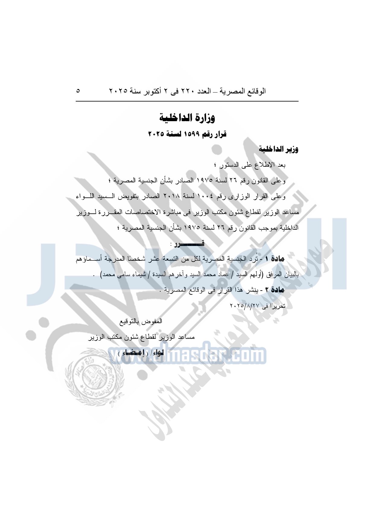 نشرت الوقائع المصرية في العدد 220 الصادر في 2 أكتوبر سنة 2025، وزارة الداخلية، رقم 1599 لسنة 2025، بشأن رد الجنسية المصرية لـ19 شخص.