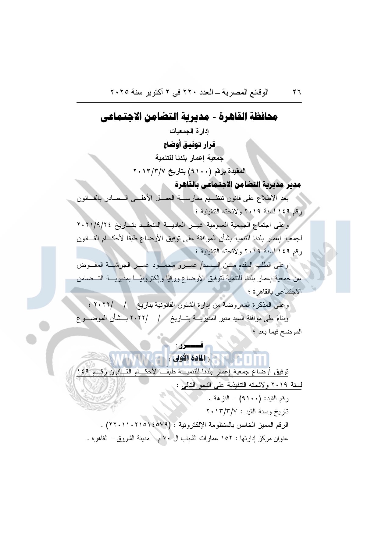 نشرت الوقائع المصرية في العدد 220، في 2 أكتوبر 2025، قرار مديرية التضامن الاجتماعي بالقاهرة، بشأن توفيق أوضاع جمعية إعمار بلدنا للتنمية، المقيدة برقم "9100"، بتاريخ 7-3-2013.