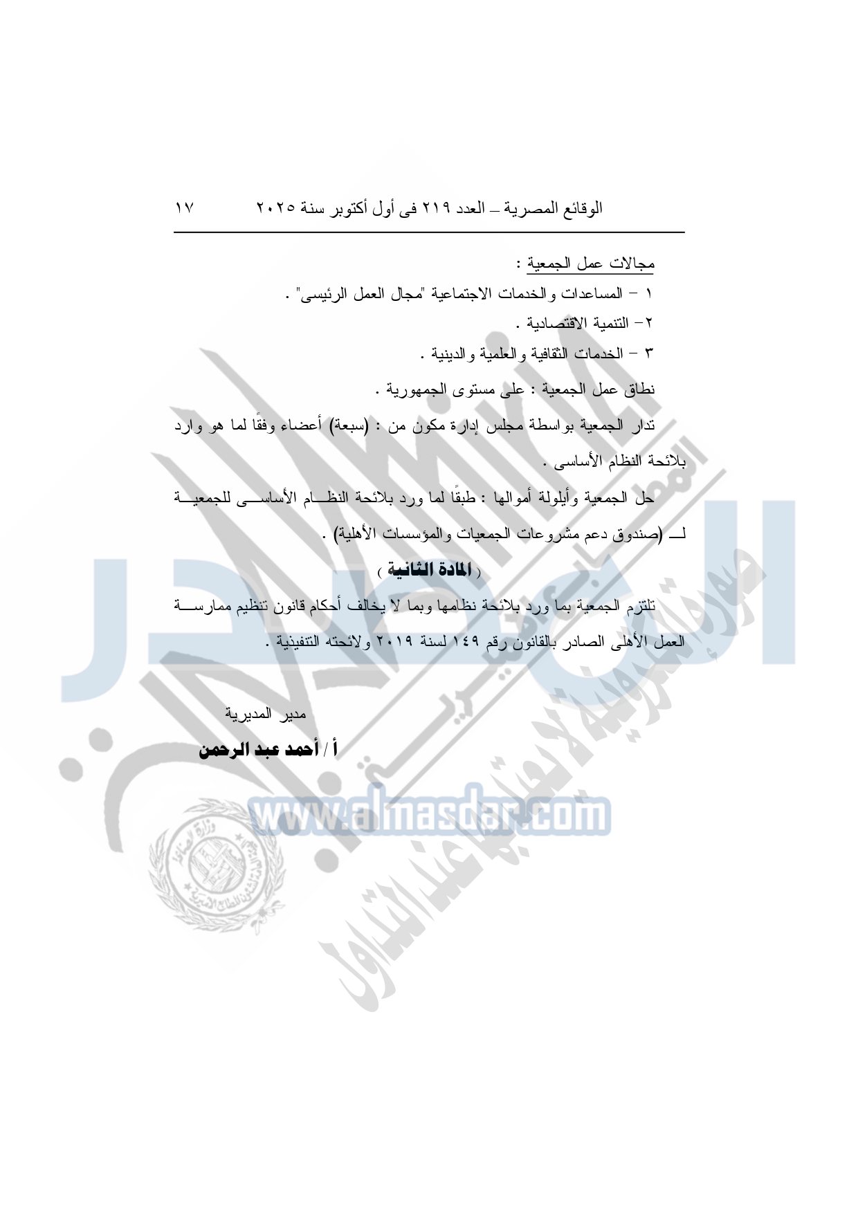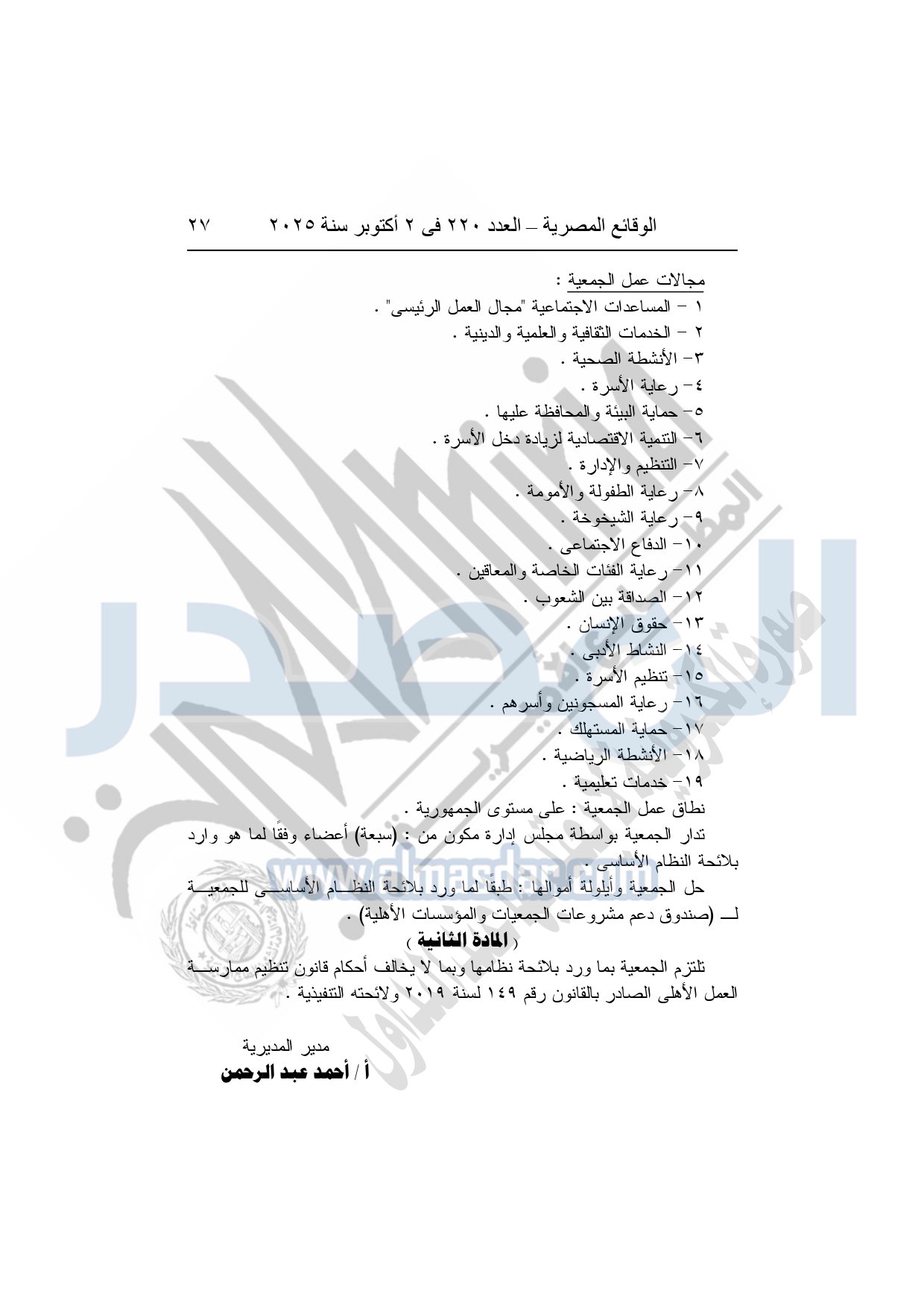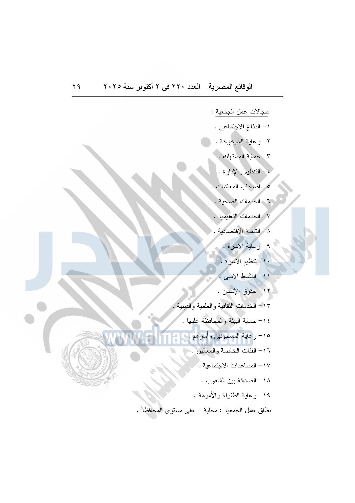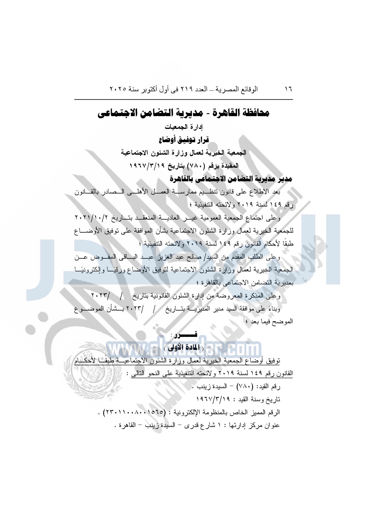 وايضا نشرت الوقائع المصرية في العدد 219، في أول أكتوبر 2025، قرار مديرية التضامن الاجتماعي بالقاهرة، بشأن توفيق أوضاع الجمعية الخيرية لعمال وزارة الشئون الاجتماعية، المقيدة برقم "780"، بتاريخ 19-3-1967.