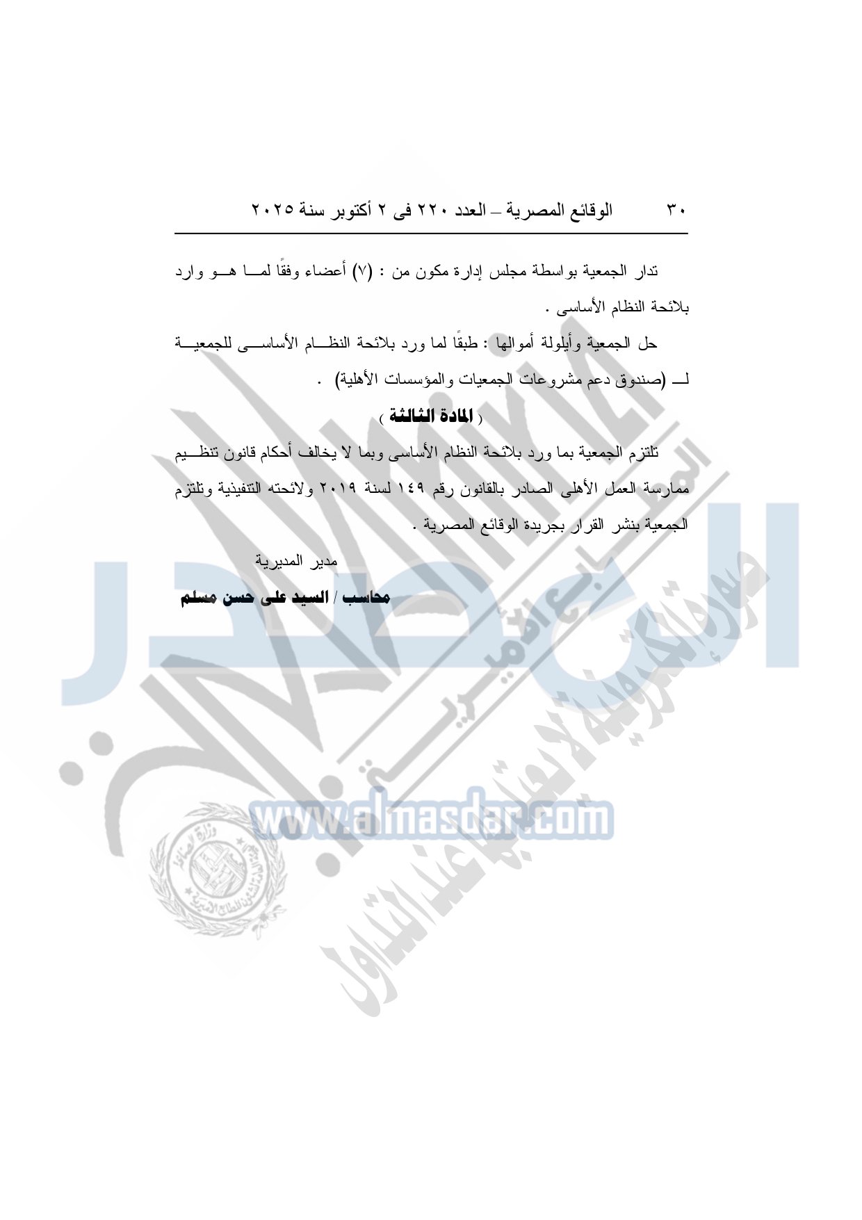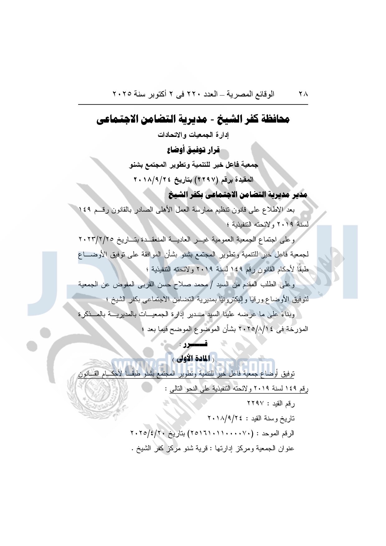 كما نشرت الوقائع المصرية في العدد 220، في 2 أكتوبر 2025، قرار مديرية التضامن الاجتماعي بكفر الشيخ، بشأن توفيق أوضاع جمعية فاعل خير للتنمية وتطوير المجتمع بشنو، المقيدة برقم "2297"، بتاريخ 24-9-2018.