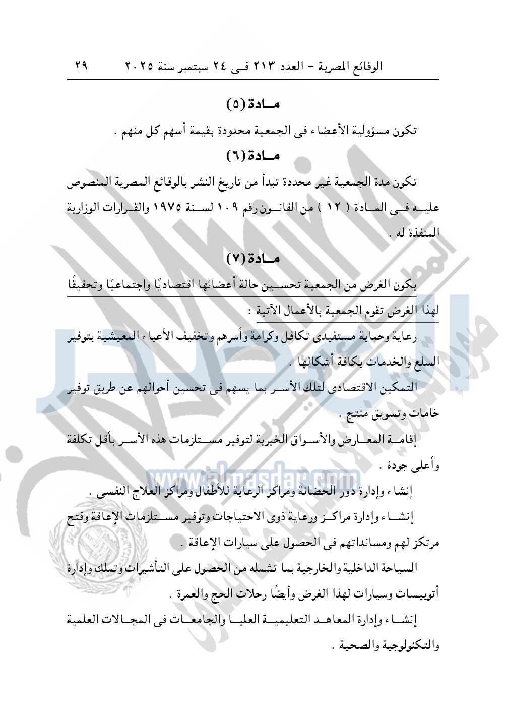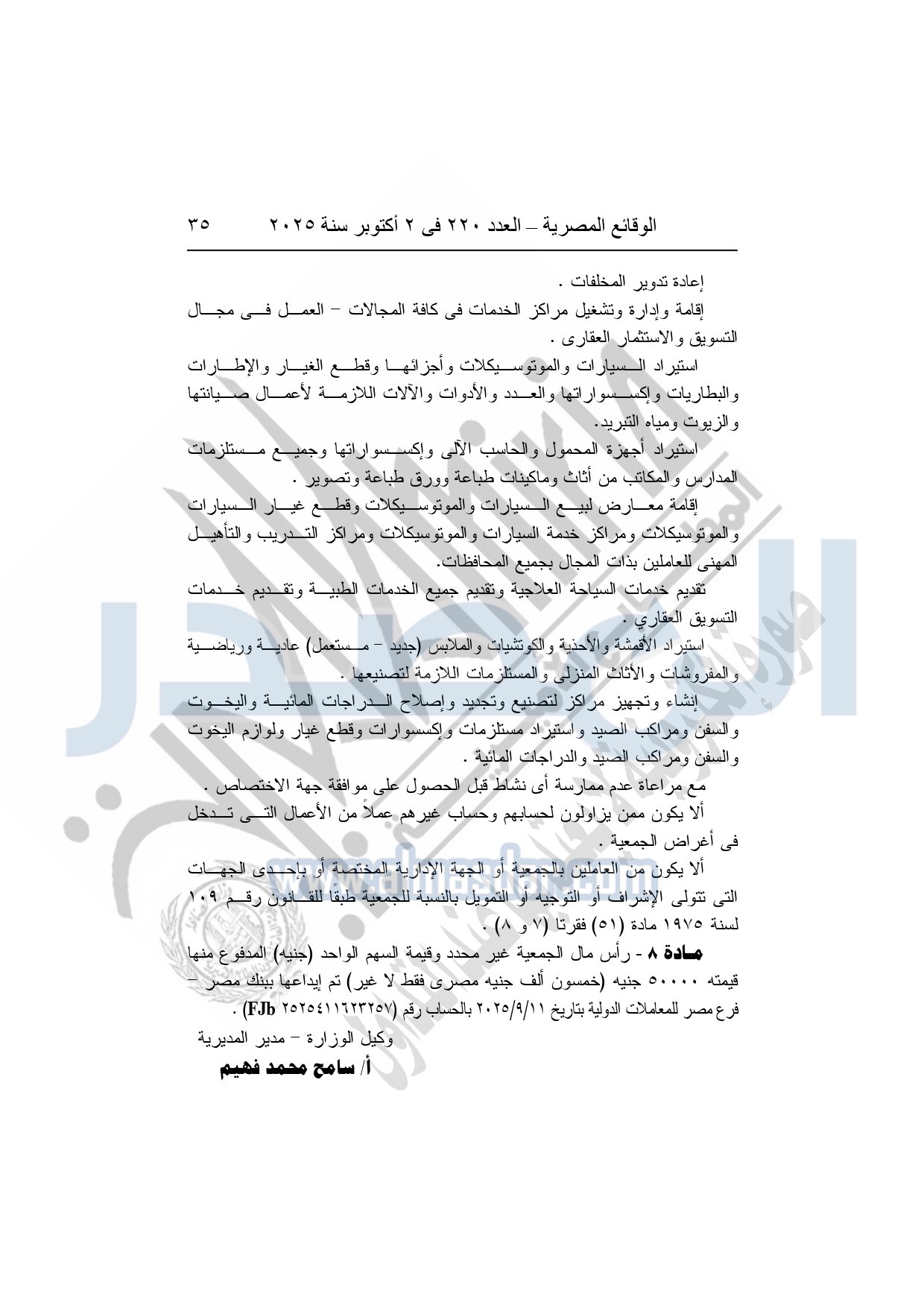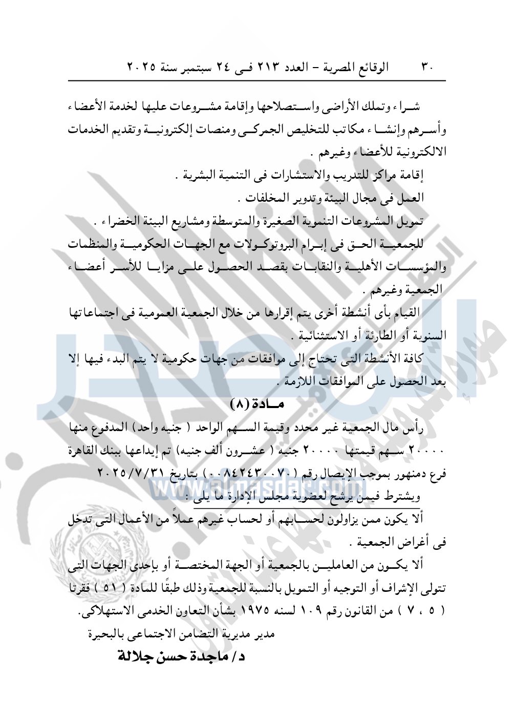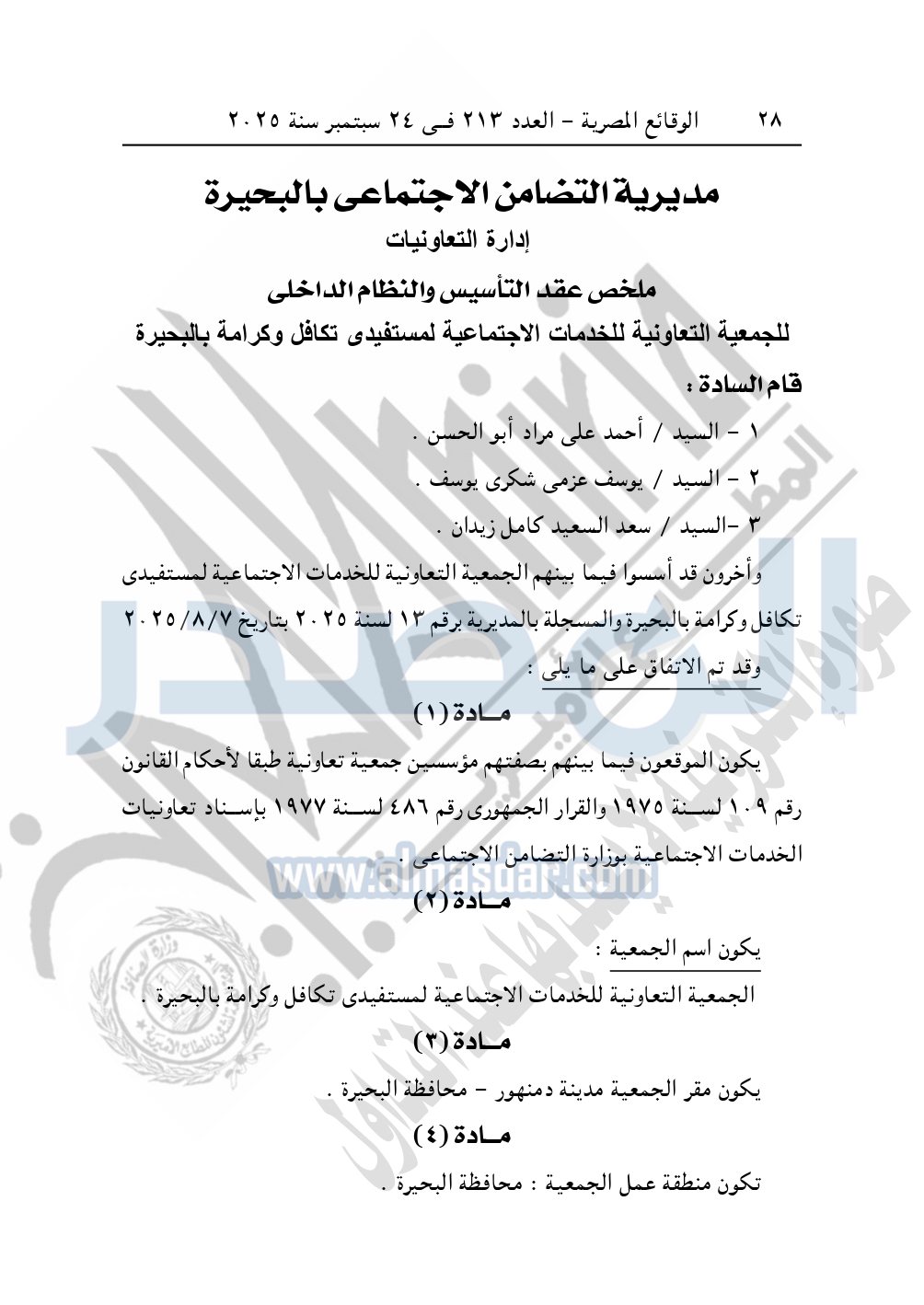 كما نشرت الوقائع المصرية في العدد 213، في 24 سبتمبر 2025، قرار مديرية التضامن الاجتماعي بالجيزة، إدارة التعاونيات، بشأن ملخص نشر عقد التأسيس والنظام الداخلى للجمعية التعاونية للخدمات الاجتماعية لمستفيدى تكافل وكرامة بالبحيرة.