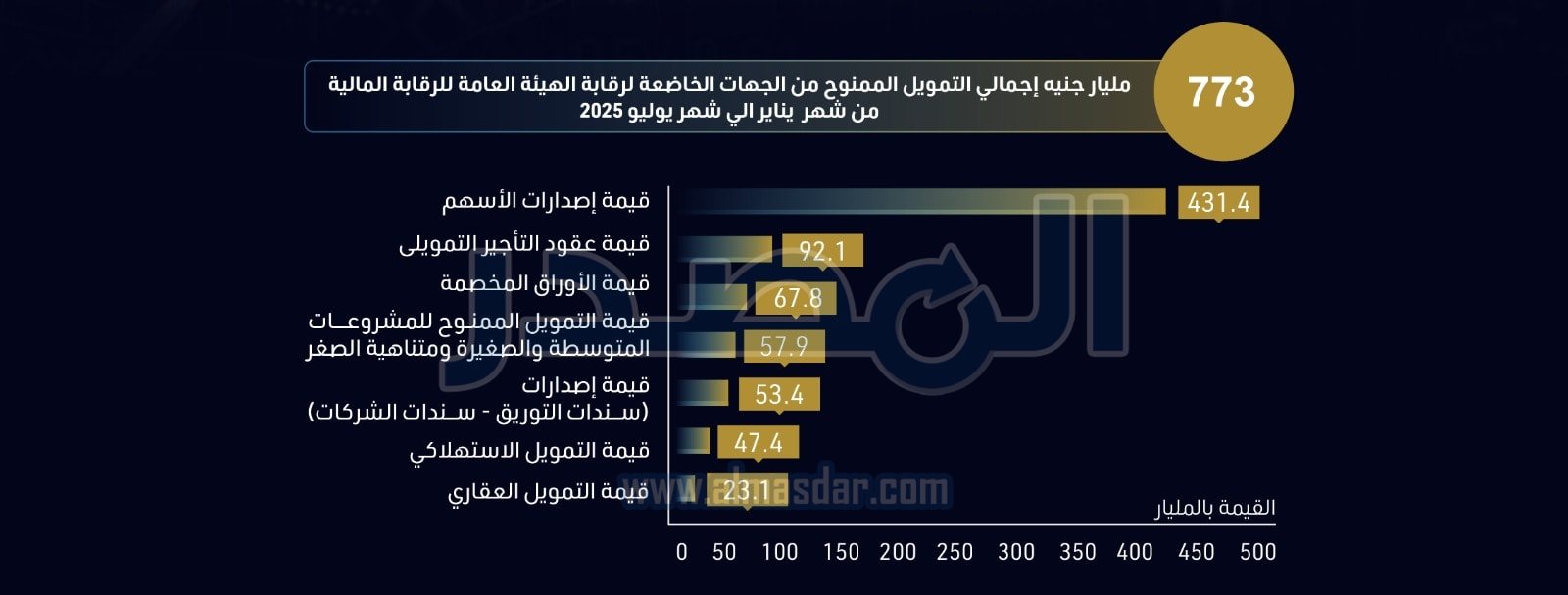 أظهرت أحدث التقارير الصادرة من الهيئة العامة للرقابة المالية، أن إجمالي التمويل الممنوح من خلال الجهات الخاضعة لرقابة الهيئة "أنشطة سوق رأس المال، أنشطة التمويل غير المصرفي" بلغ قيمته 773 مليار جنيه خلال الفترة من يناير إلى نهاية شهر يوليو 2025.
