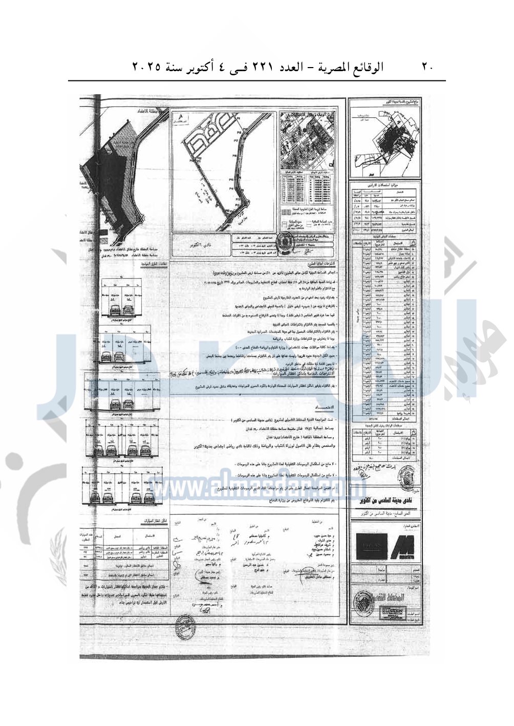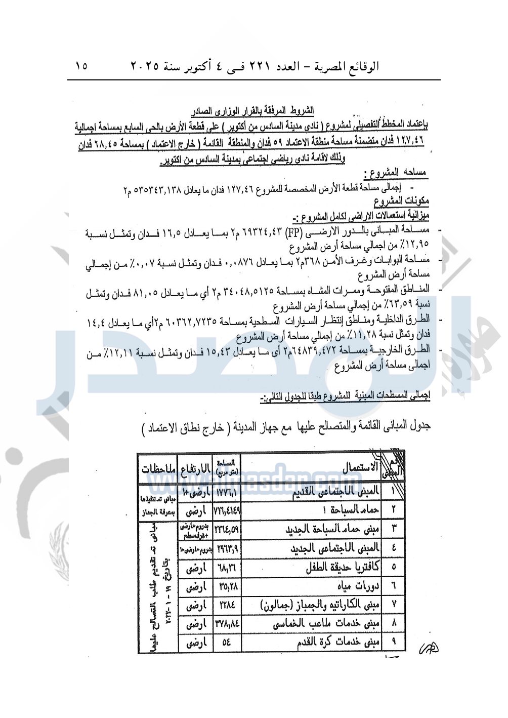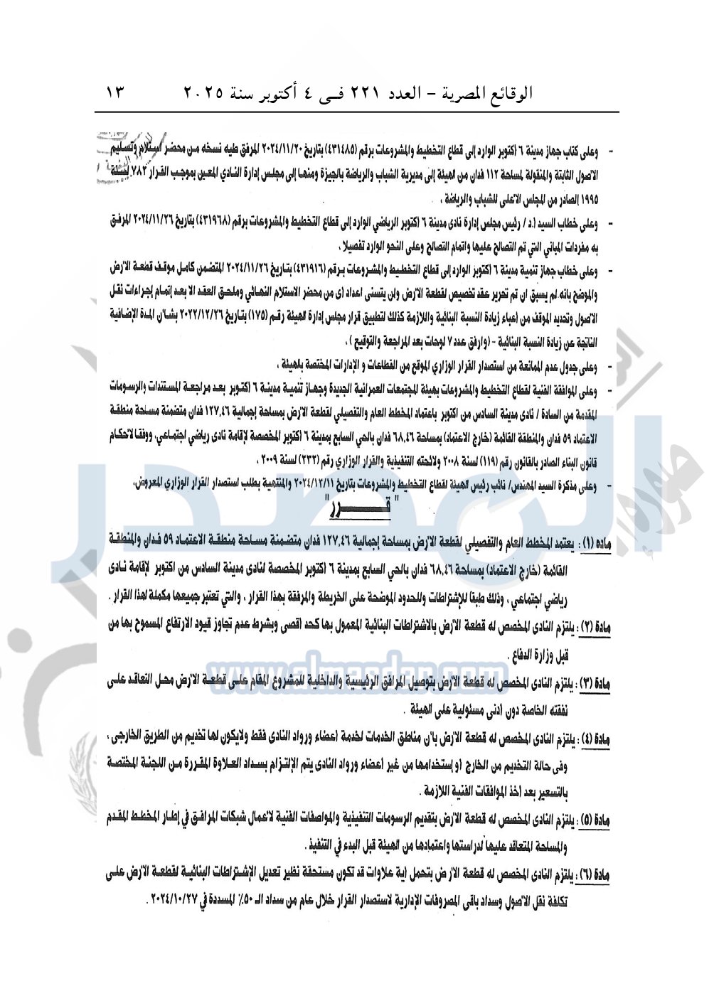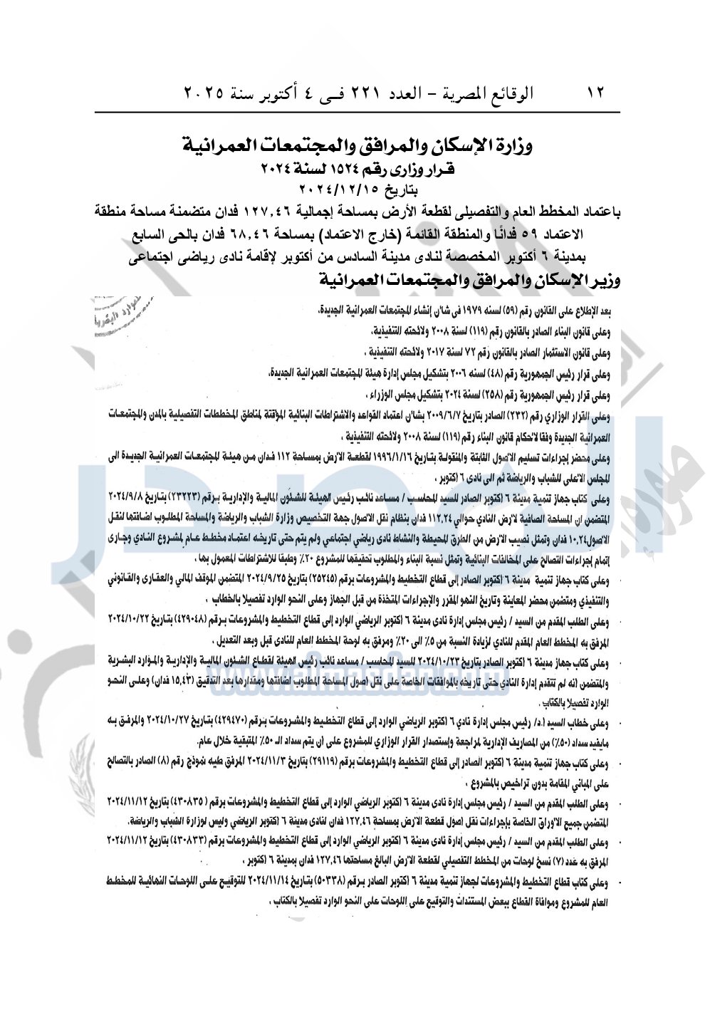 نشرت الوقائع المصرية في العدد 221، بتاريخ 4 أكتوبر 2025، قرار وزارة الإسكان والمرافق والمجتمعات العمرانية، قرار رقم 1524 لسنة 2024، بتاريخ 15-12-2024، بشأن اعتماد المخطط العام والتفصيلى لقطعة الأرض بمساحة إجمالية 127.46 فدان متضمنة مساحة منطقة الاعتماد 59 فدانًا والمنطقة القائمة "خارج الاعتماد" بمساحة 68.46 فدان بالحى السابع بمدينة 6 أكتوبر المخصصة لنادى مدينة السادس من أكتوبر لإقامة نادي رياضي اجتماعي.