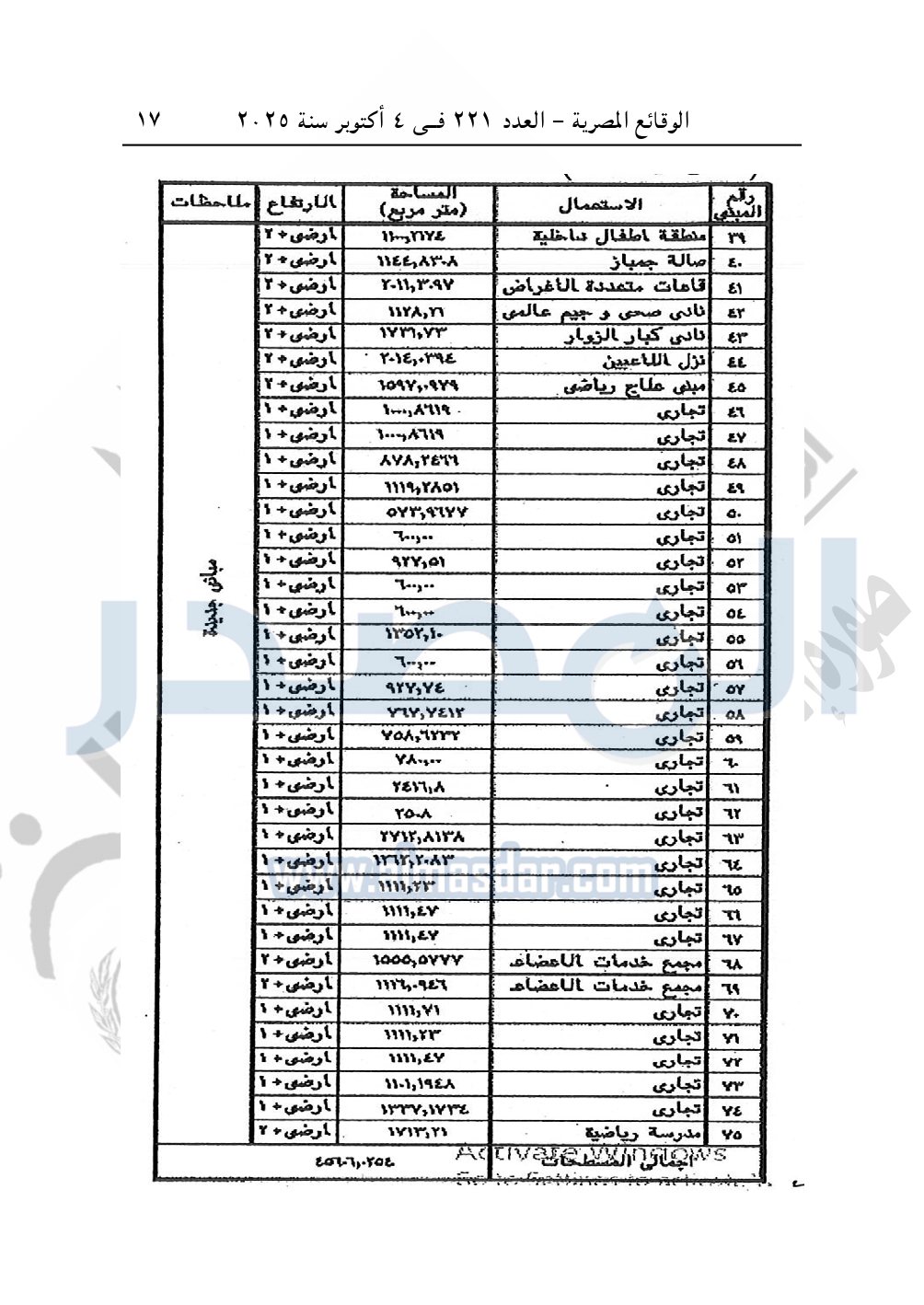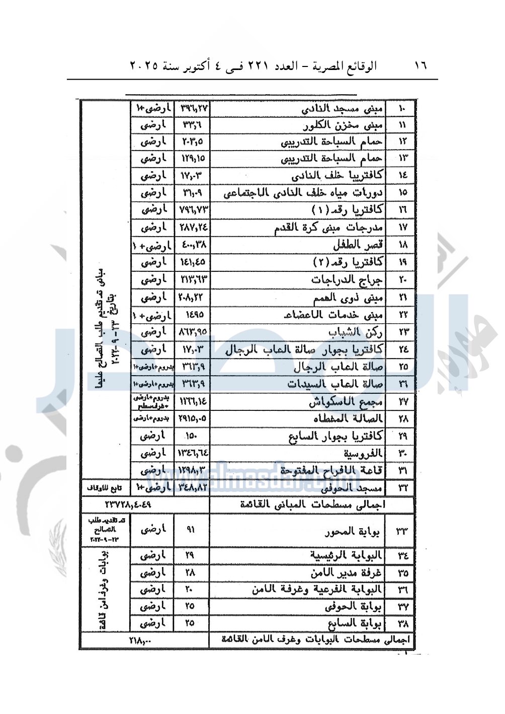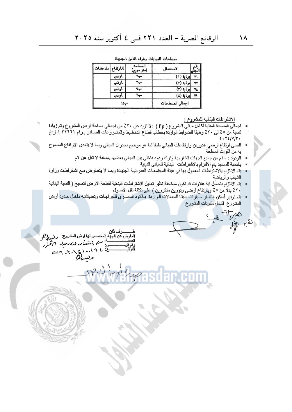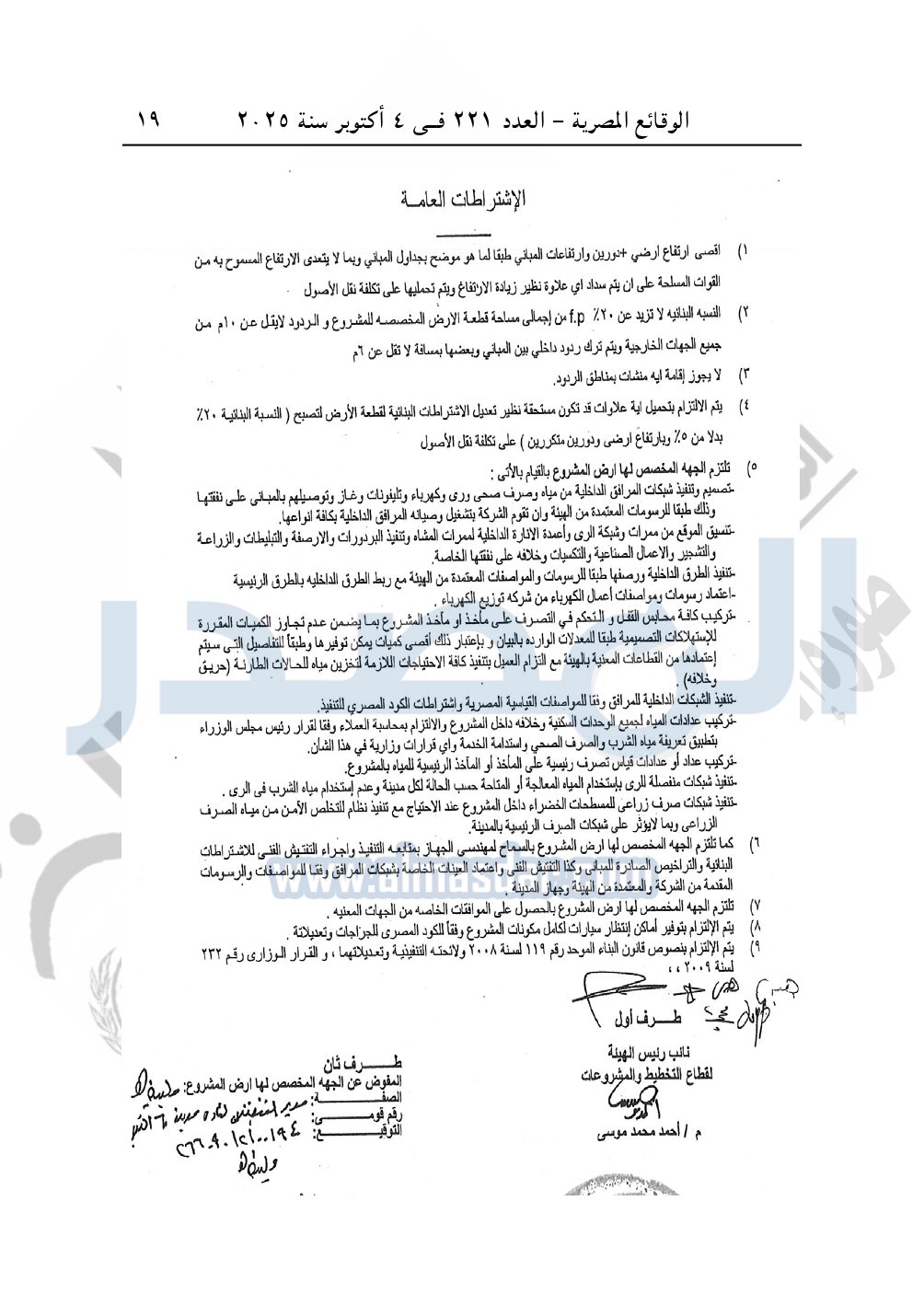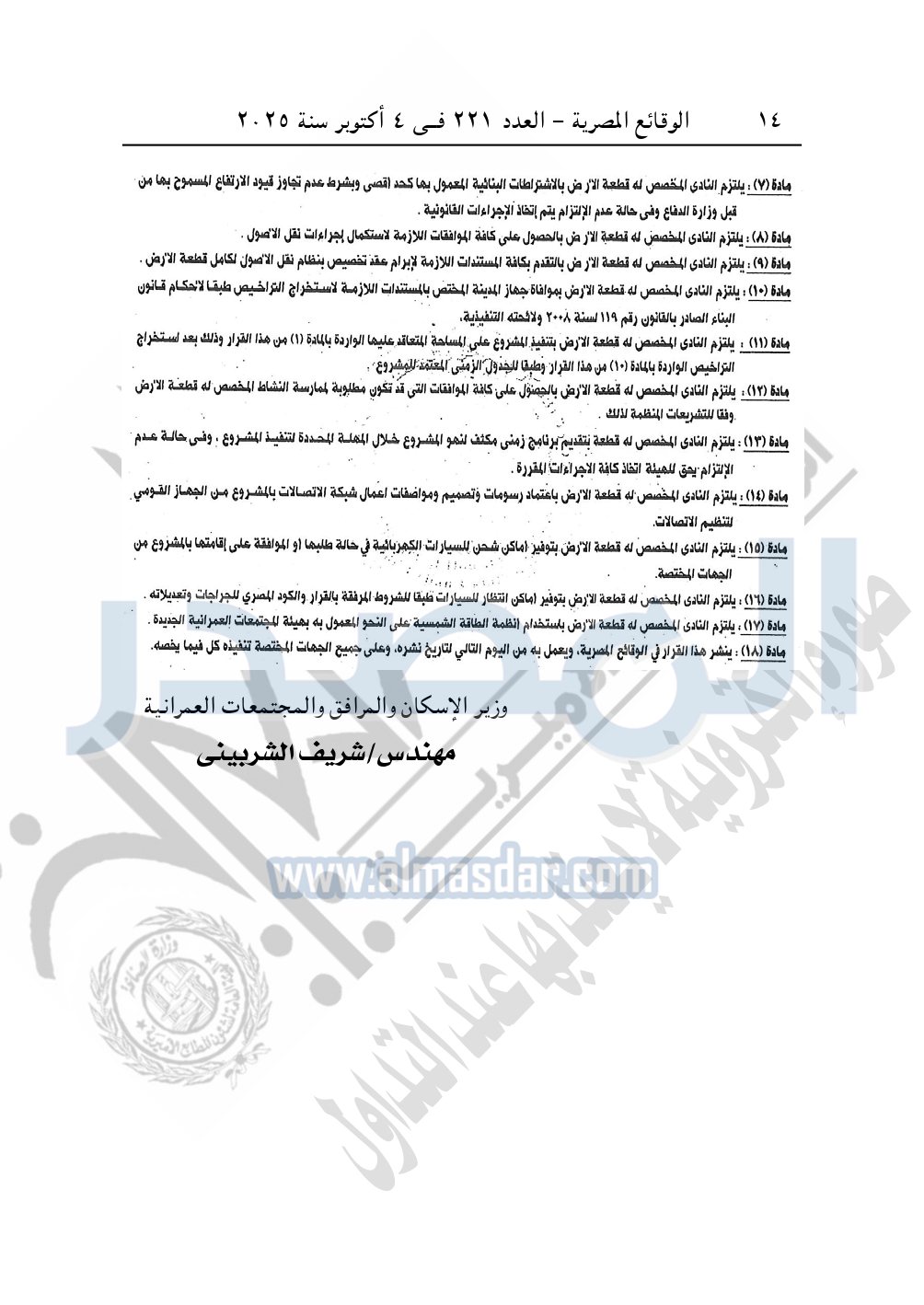 يلتزم النادى المخصص له قطعة الأرض بتحمل اية علاوات قد تكون مستحقة نظير تعديل الإشتراطات البنائية لقطعة الأرض على تكلفة نقل الأصول وسداد باقى المصروفات الإدارية لاستصدار القرار خلال عام من سداد الـ50% المسددة في 27-10-2024.