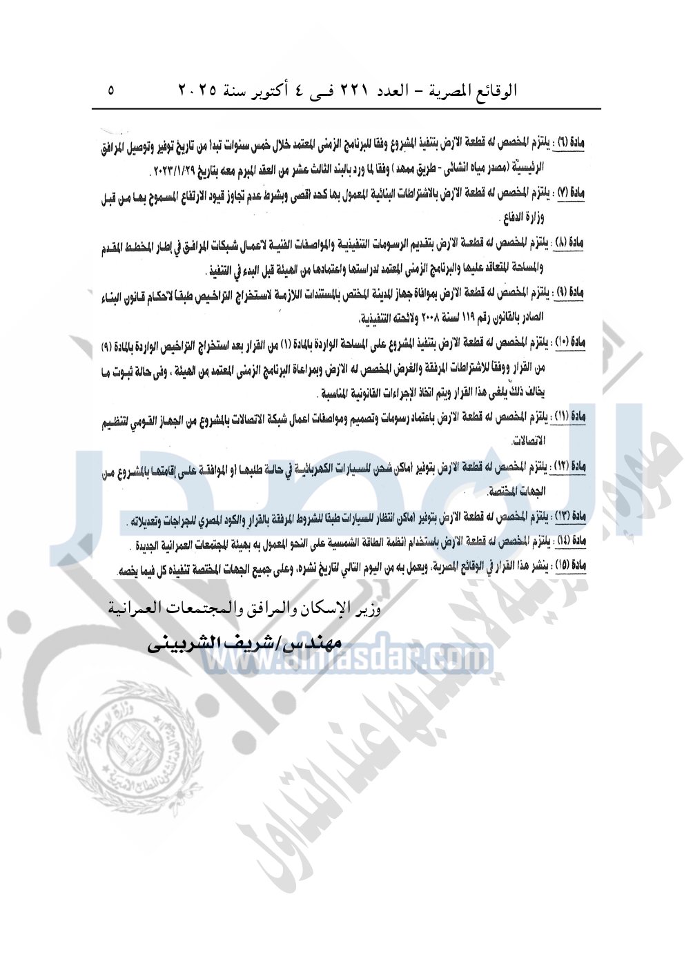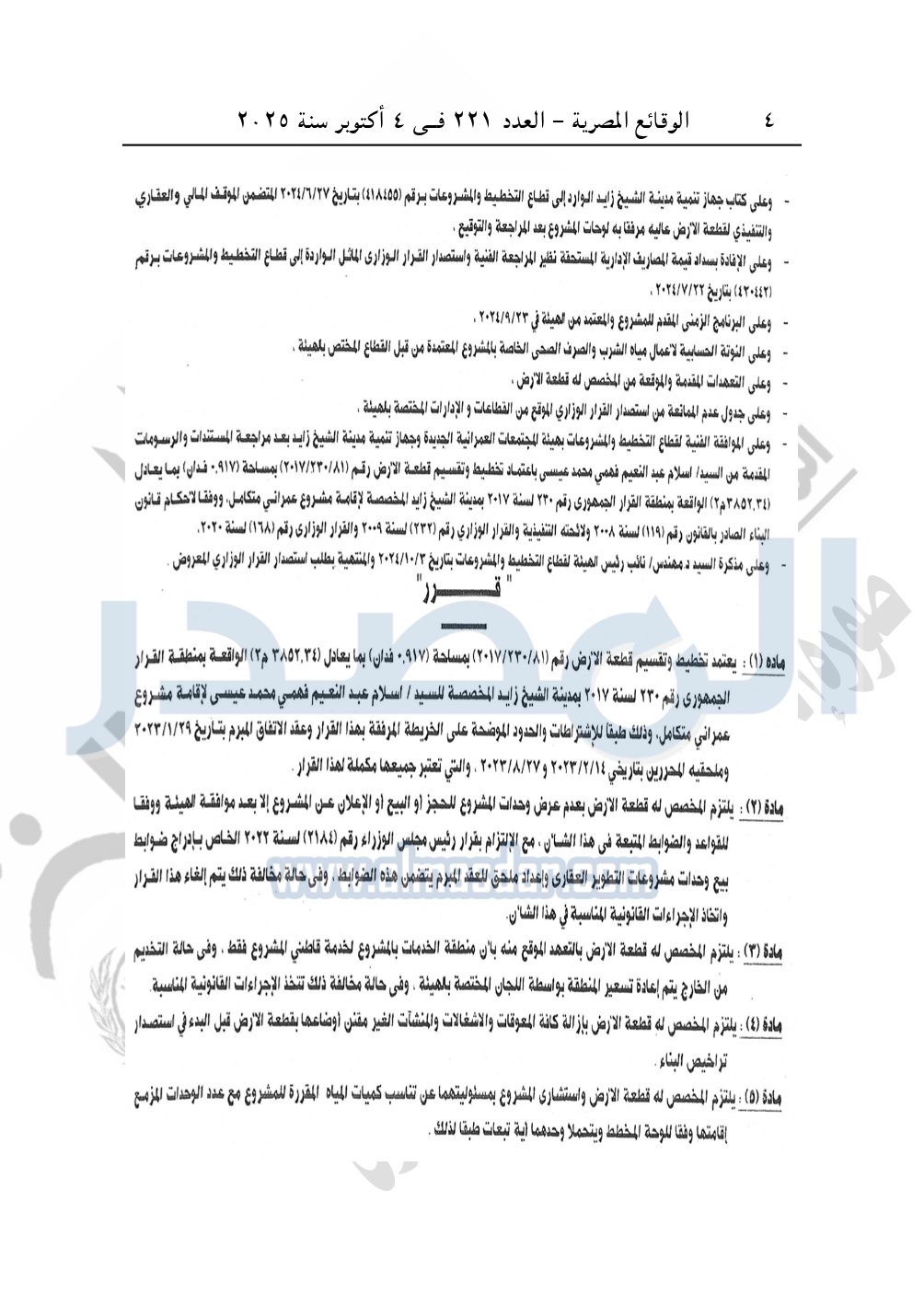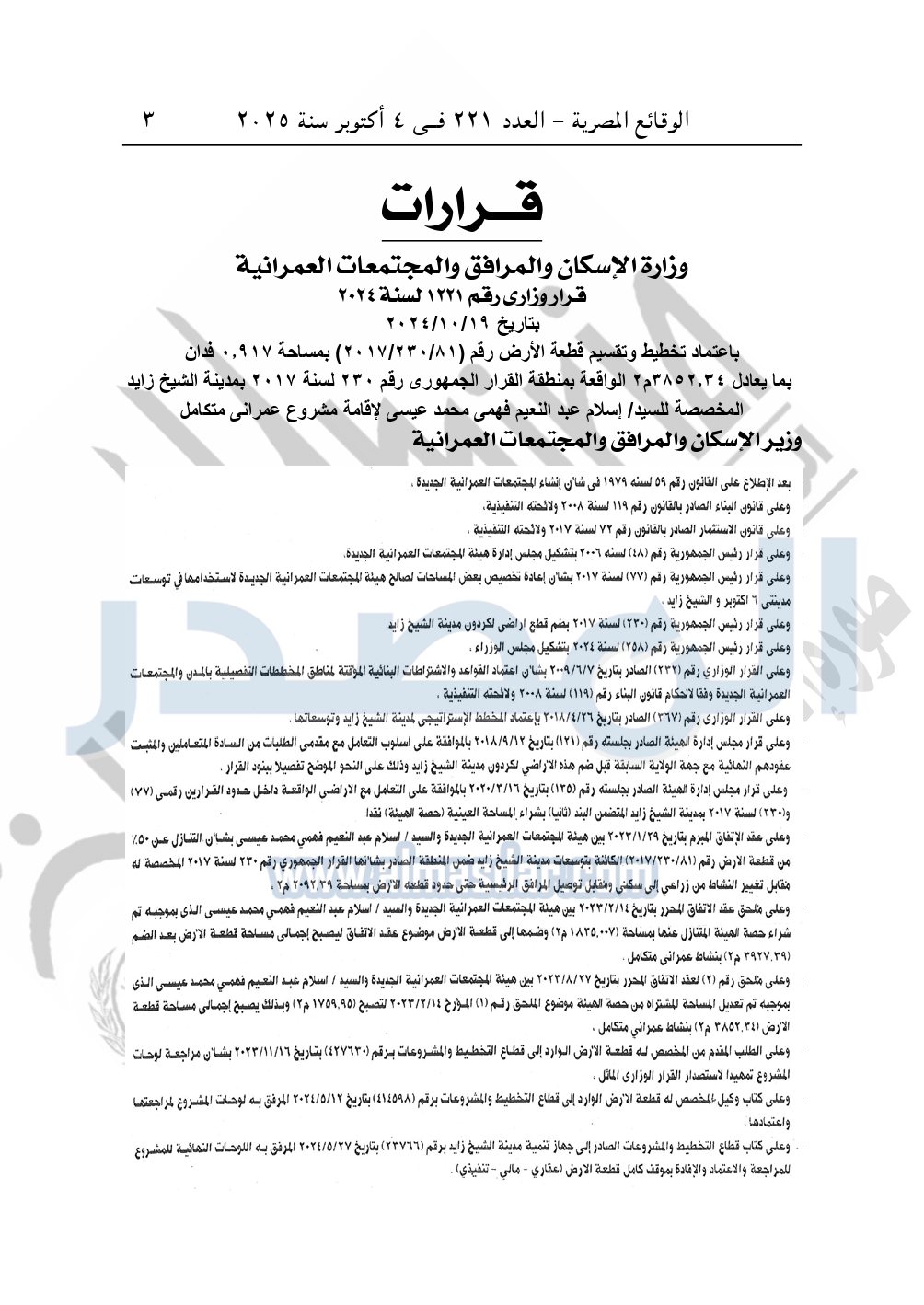 نشرت الوقائع المصرية في العدد 221، بتاريخ 4 أكتوبر 2025، قرار وزارة الإسكان والمرافق والمجتمعات العمرانية، قرار رقم 1221 لسنة 2024، بتاريخ 19-10-2024، بشأن اعتماد تخطيط وتقسيم قطعة الأرض رقم "81 / 230 / 2017" مساحة 0.917 فدان بما يعادل 3852.34م2 الواقعة بمنطقة القرار الجمهورى رقم 230 لسنة 2017 بمدينة الشيخ زايد المخصصة لـ إسلام عبد النعيم فهمى محمد عيسى لإقامة مشروع عمراني متكامل.
