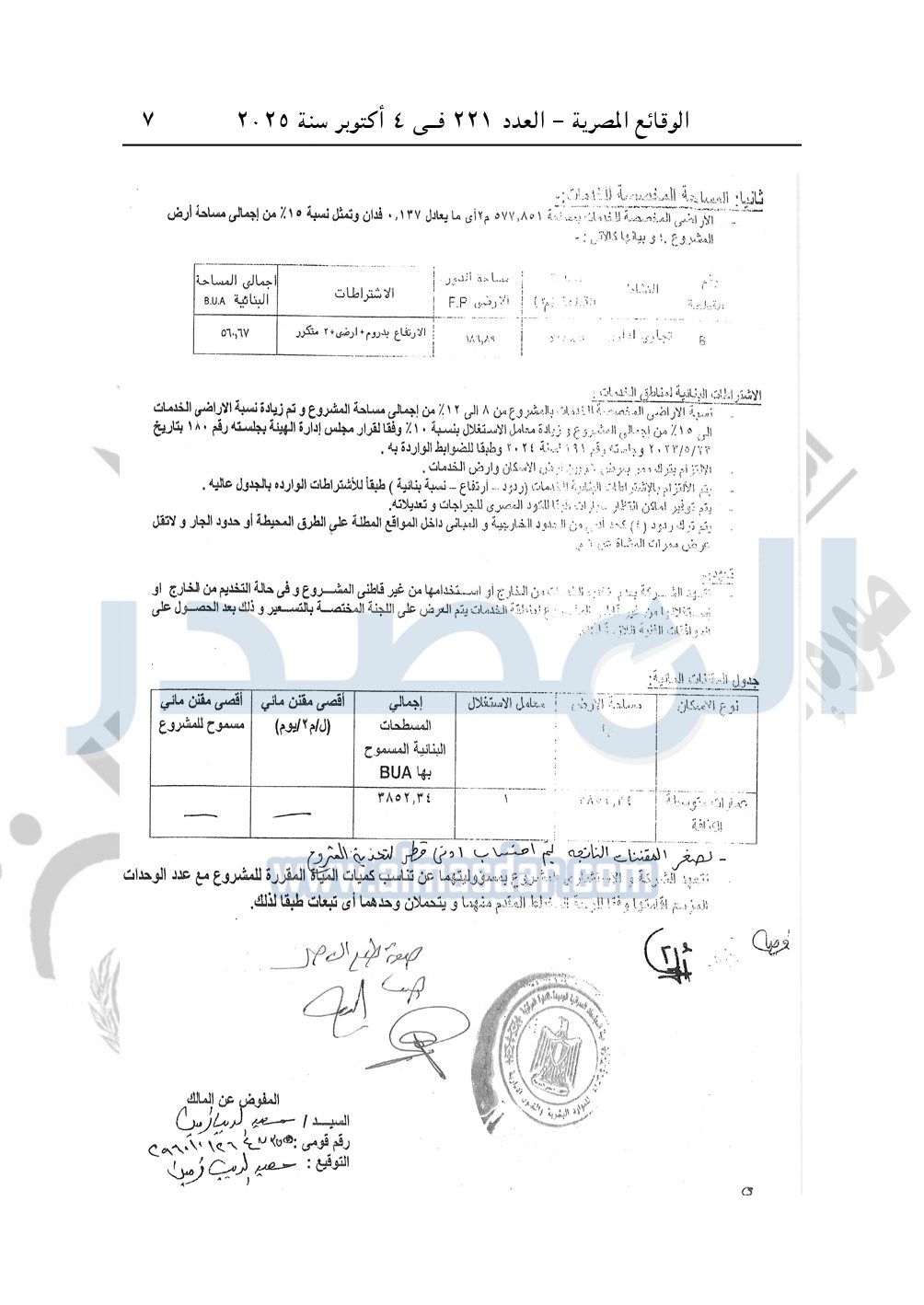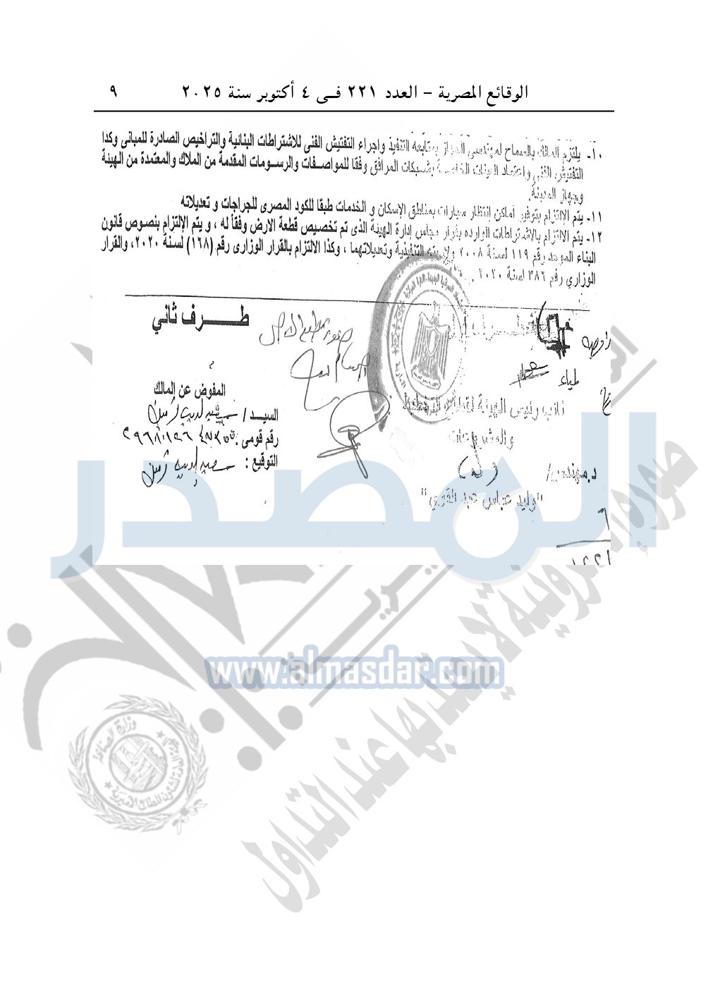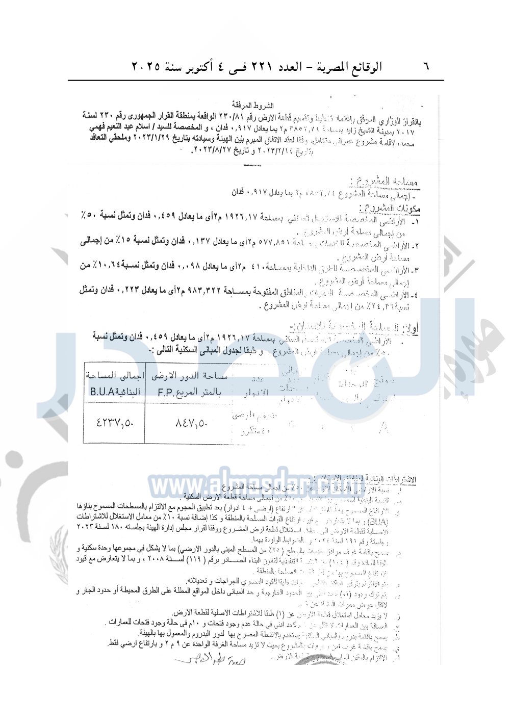 نشرت الوقائع المصرية في العدد 221، بتاريخ 4 أكتوبر 2025، قرار وزارة الإسكان والمرافق والمجتمعات العمرانية، قرار رقم 1221 لسنة 2024، بتاريخ 19-10-2024، بشأن اعتماد تخطيط وتقسيم قطعة الأرض رقم "81 / 230 / 2017" مساحة 0.917 فدان بما يعادل 3852.34م2 الواقعة بمنطقة القرار الجمهورى رقم 230 لسنة 2017 بمدينة الشيخ زايد المخصصة لـ إسلام عبد النعيم فهمى محمد عيسى لإقامة مشروع عمراني متكامل.
