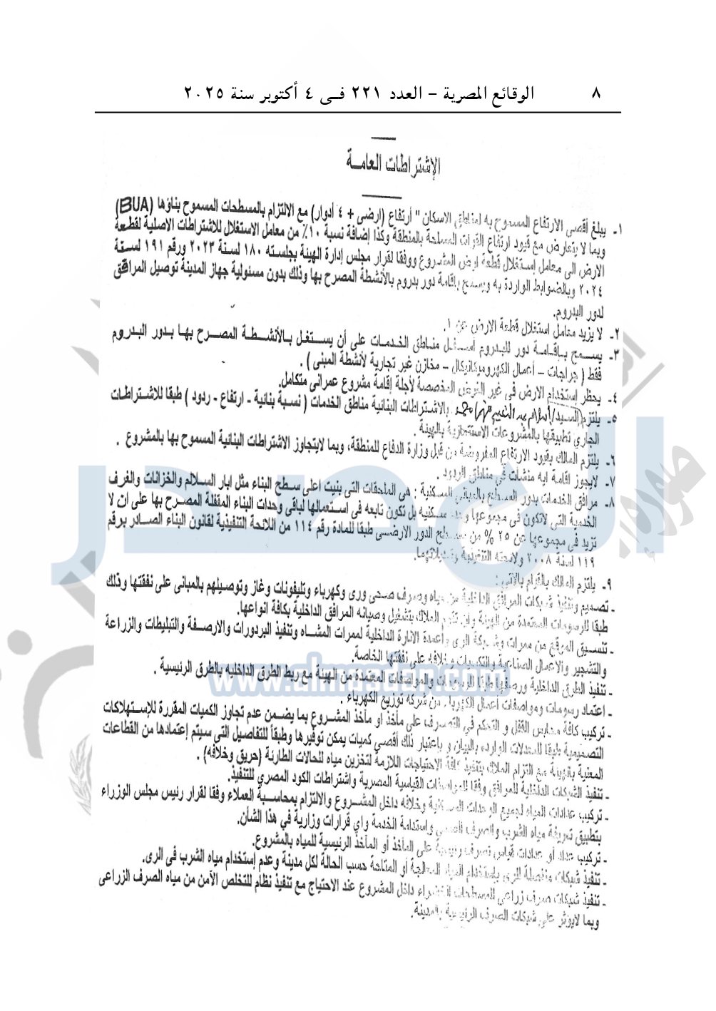 يلتزم المخصص له قطعة الأرض بإزالة كافة المعوقات والاشغالات والمنشآت الغير مقنن أوضاعها بقطعة الأرض قبل البدء في استصدار تراخيص البناء.