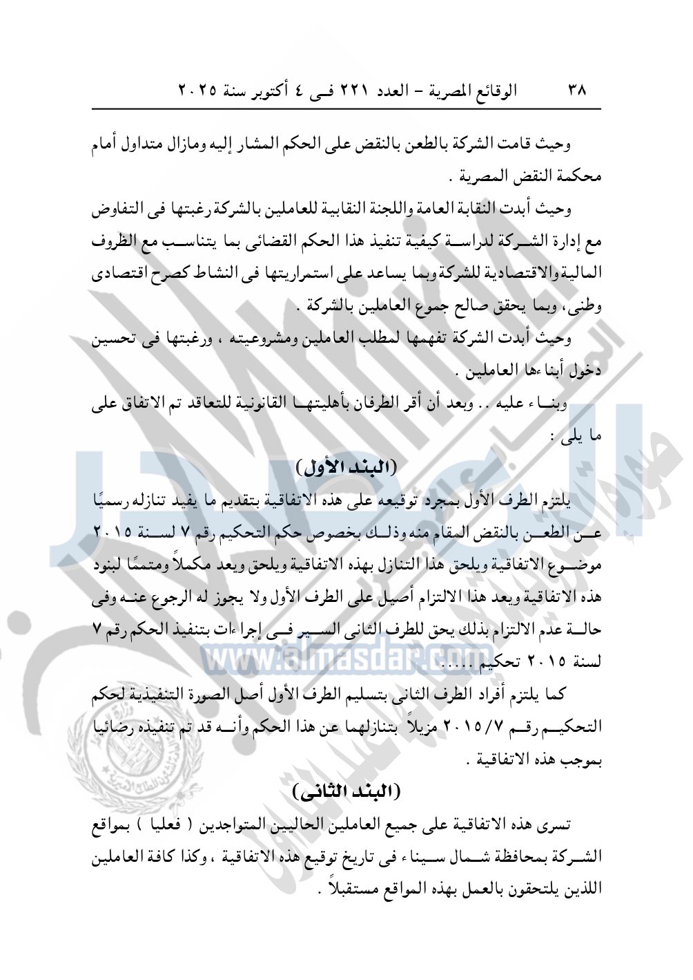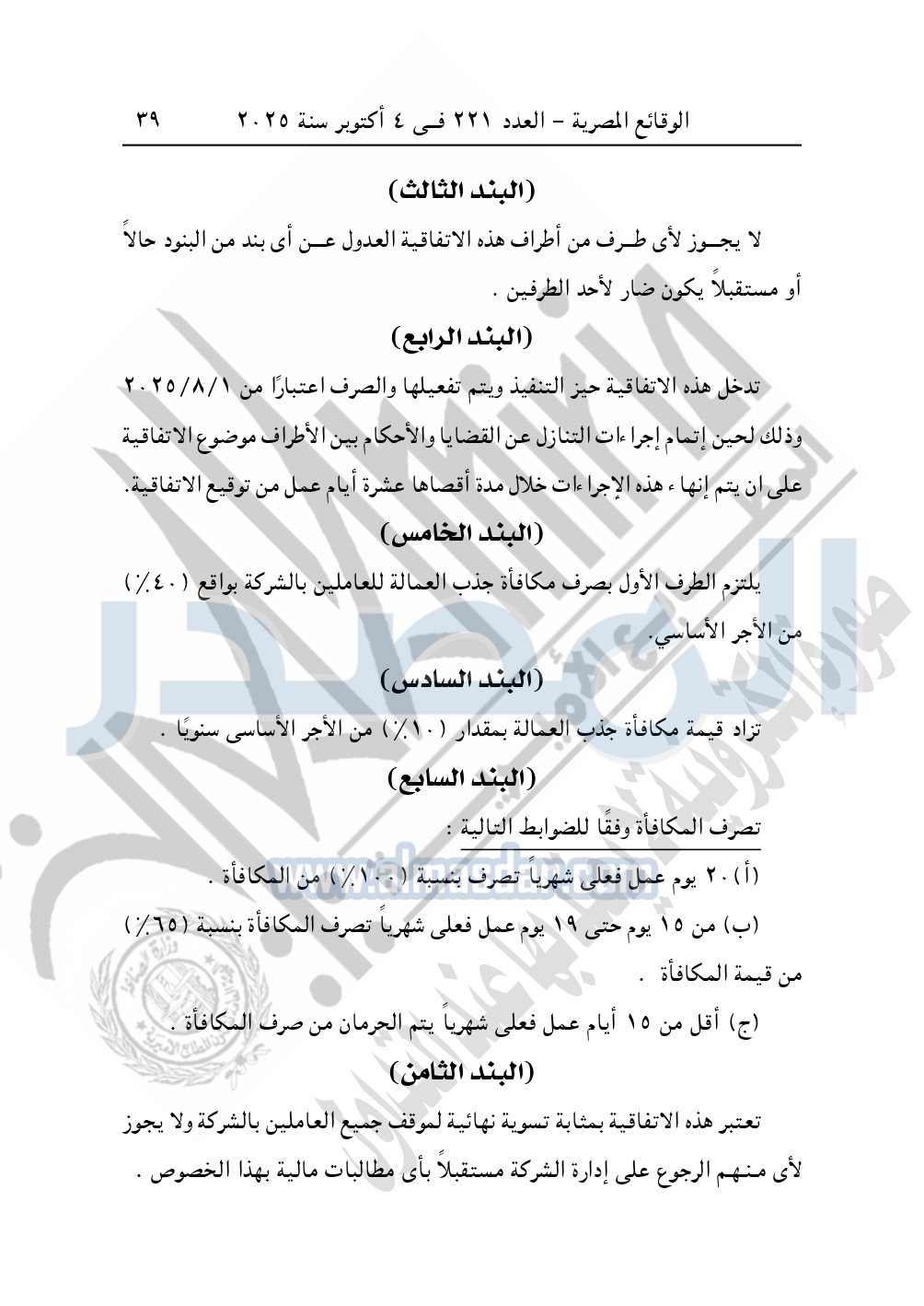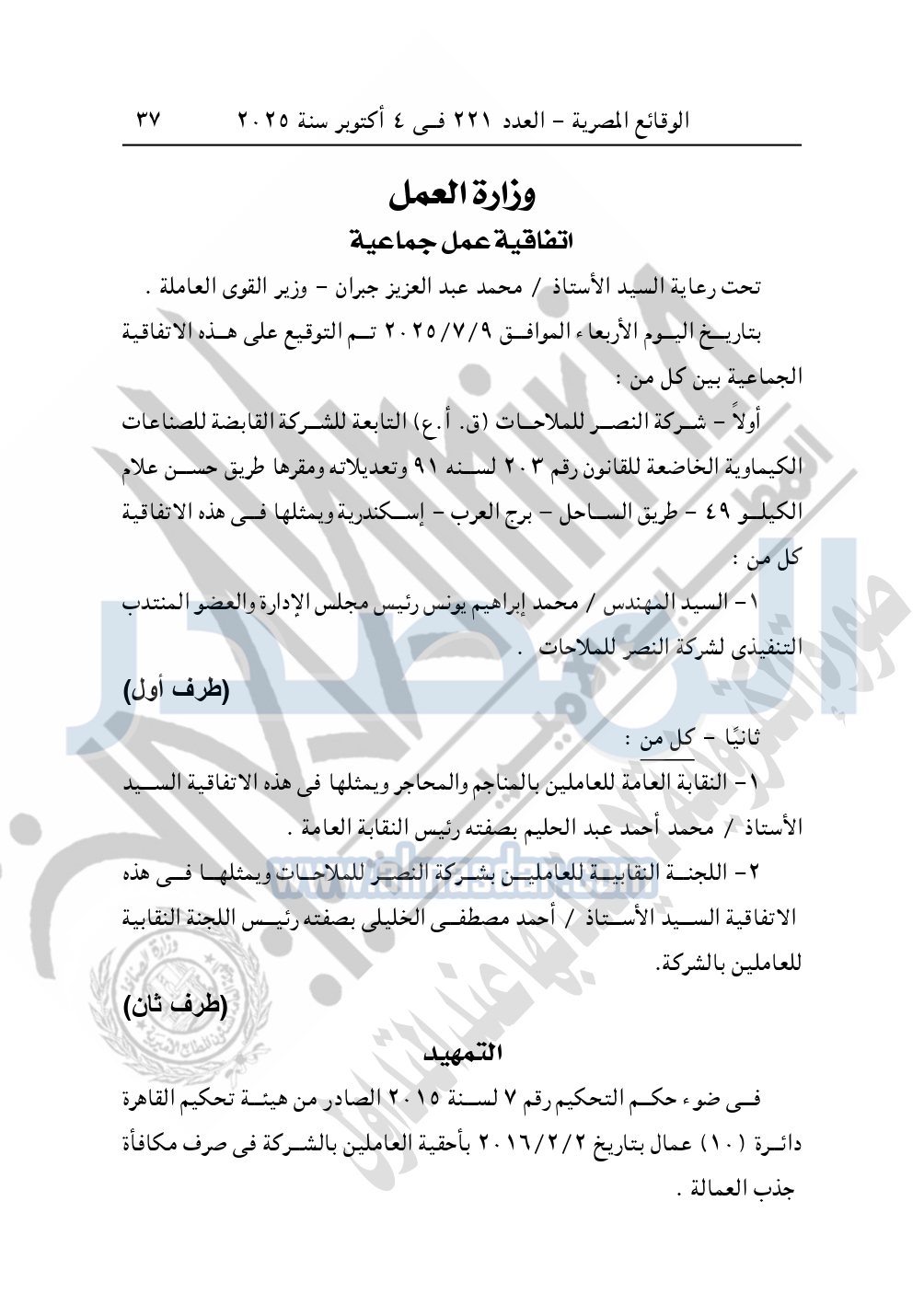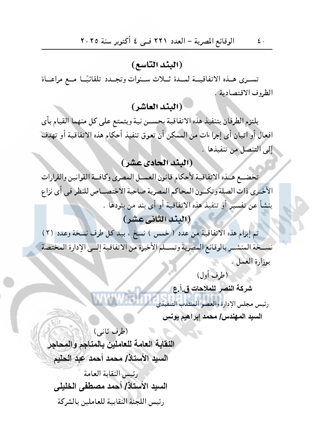 نشرت الوقائع المصرية في العدد 221 بتاريخ 4 أكتوبر 2025، اتفاقية عمل جماعية، التي تم توقيعها يوم الأربعاء الموافق 9-7-2025، تحت رعاية محمد جبران وزير العمل.