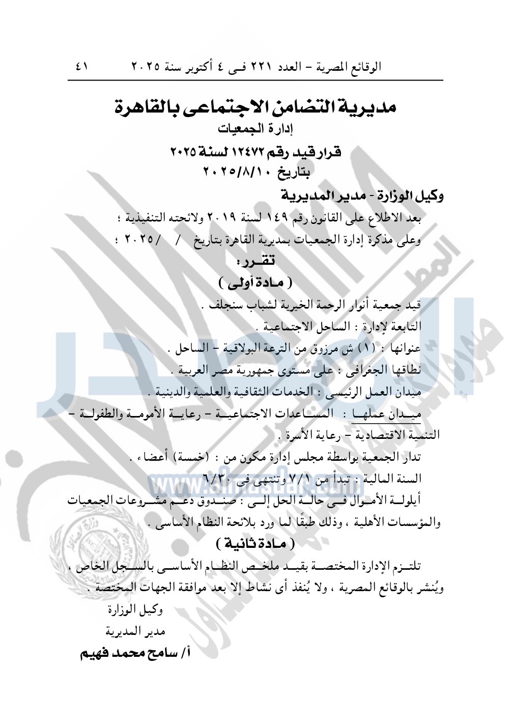 نشرت الوقائع المصرية في العدد 221، بتاريخ 4 أكتوبر 2025، قرار مديرية التضامن الاجتماعي بالقاهرة، قيد رقم 12472 لسنة 2025، بتاريخ 10-8-2025، بشأن قيد جمعية أنوار الرحمة الخيرية لشباب سنجلف.