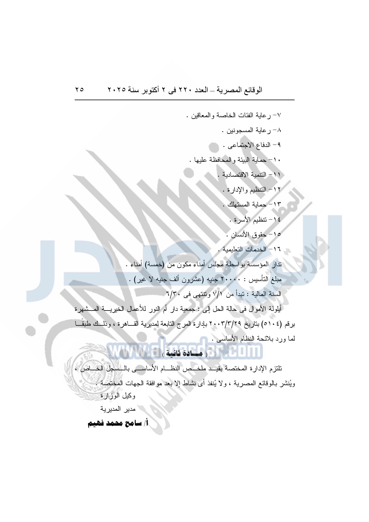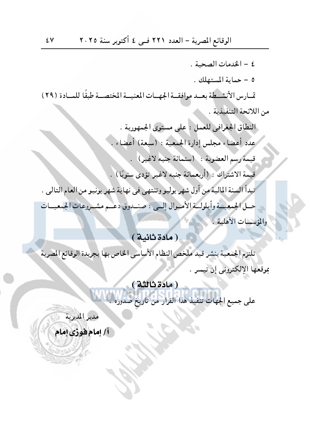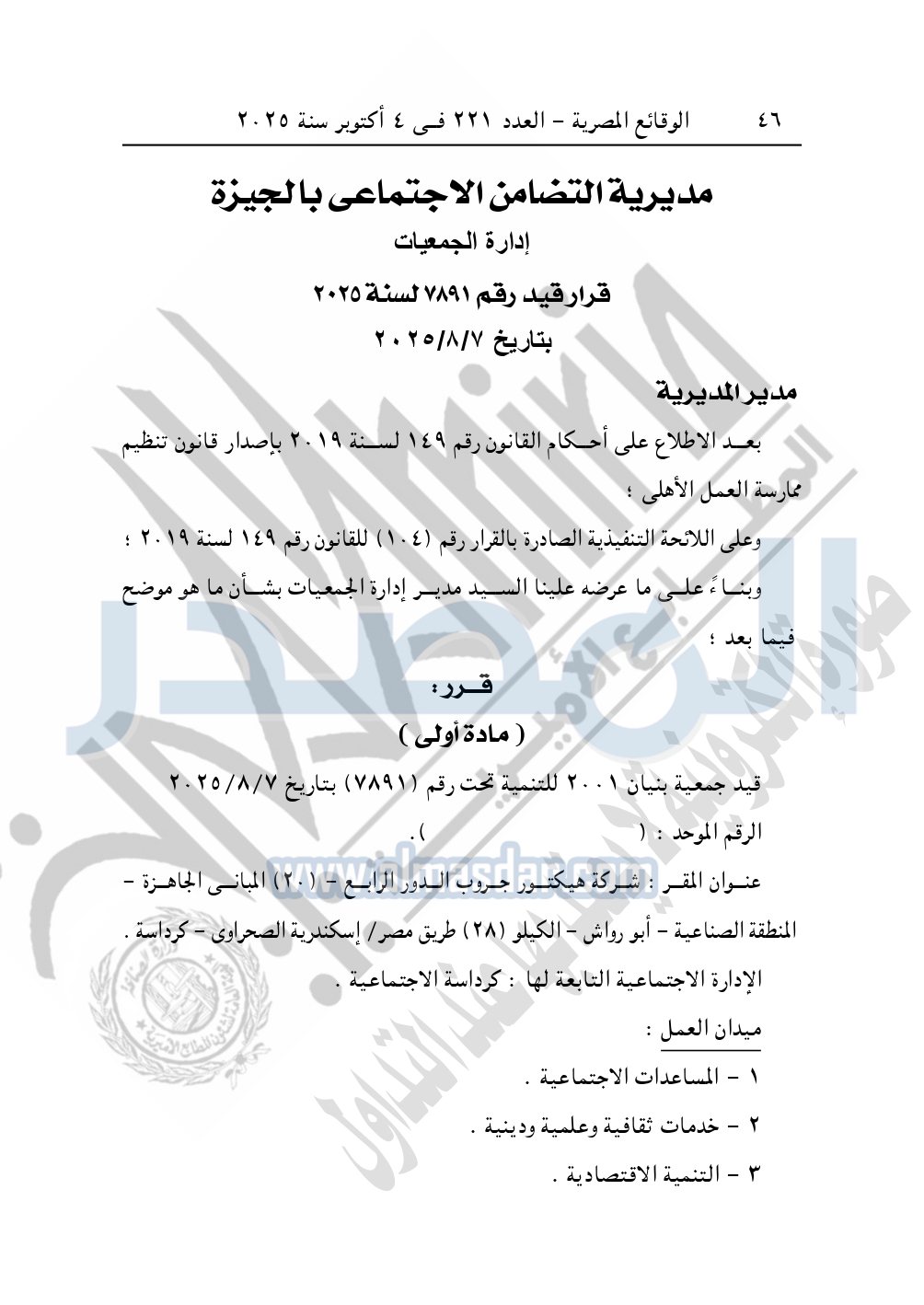 كما نشرت الوقائع المصرية في العدد 221، بتاريخ 4 أكتوبر 2025، قرار مديرية التضامن الاجتماعي بالجيزة، قيد رقم 7891 لسنة 2025، بتاريخ 7-8-2025، بشأن قيد جمعية بنيان 2001 للتنمية.
