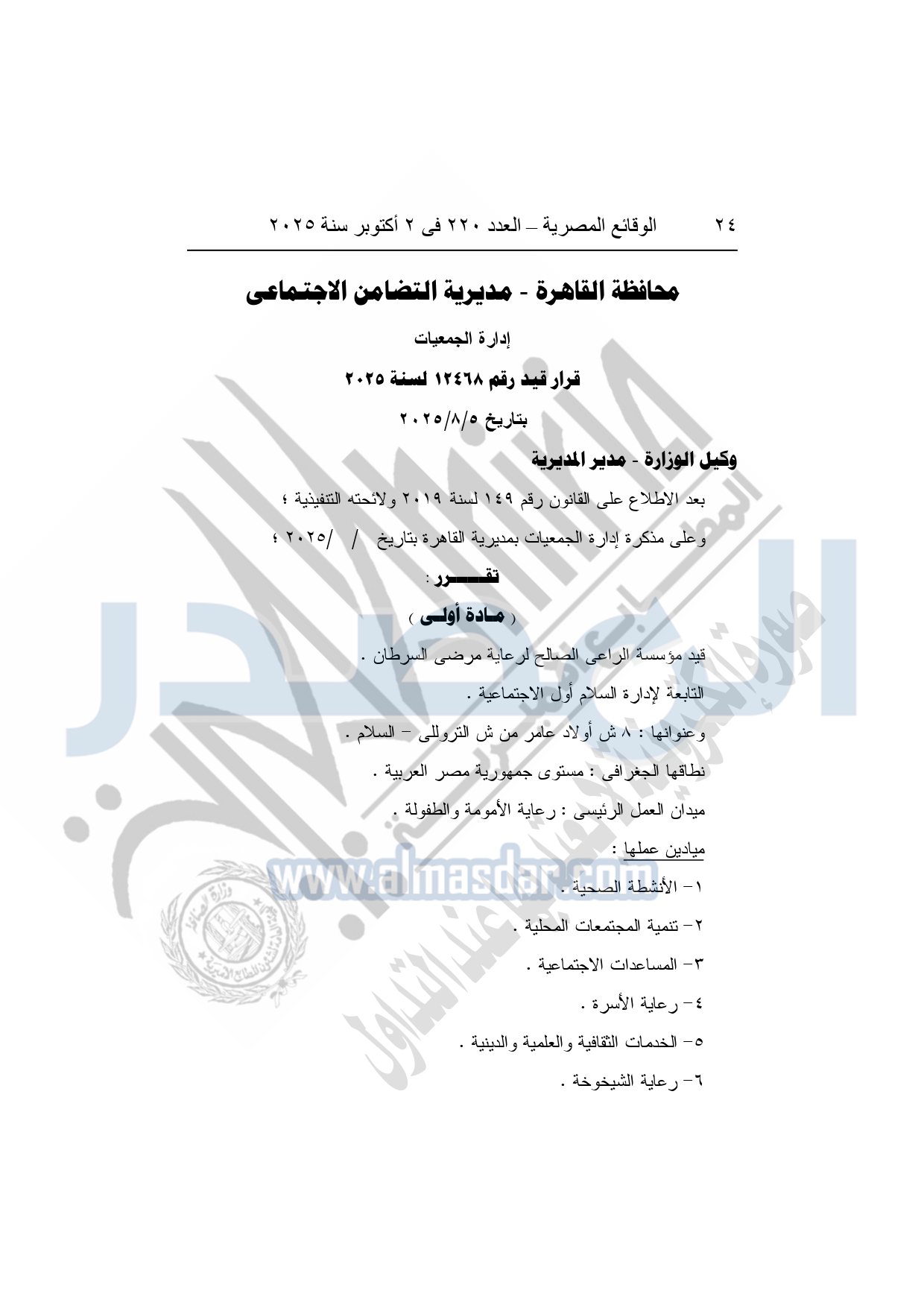 وأيضا نشرت الوقائع المصرية في العدد 220، بتاريخ 2 أكتوبر 2025، قرار مديرية التضامن الاجتماعي بالقاهرة، قيد رقم 12468 لسنة 2025، بتاريخ 5-8-2025، بشأن قيد مؤسسة الراعي الصالح لرعاية مرضى السرطان.