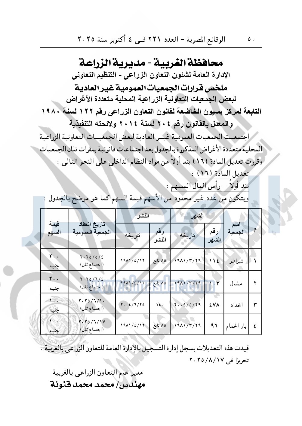 نشرت الوقائع المصرية في العدد 221، في 4 أكتوبر 2025، قرار مديرية الزراعة بالغربية، الإدارة العامة لشئون التعاون الزراعى - التنظيم التعاوني، بشأن ملخص قرارات الجمعيات العمومية غير العادية لبعض الجمعيات التعاونية الزراعية المحلية متعددة الأغراض التابعة لمركز بسيون الخاضعة لقانون التعاون الزراعى رقم 122 لسنة 1980 والمعدل بالقانون رقم 204 لسنة 2014 ولائحته التنفيذية.