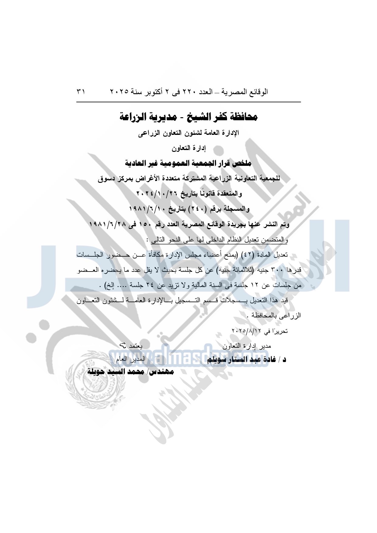 كما نشرت الوقائع المصرية في العدد 220، في 2 أكتوبر 2025، قرار مديرية الزراعة بكفر الشيخ، الإدارة العامة لشئون التعاون الزراعى - إدارة التعاون، بشأن ملخص قرار الجمعية العمومية غير العادية للجمعية التعاونية الزراعية المشتركة متعددة الأغراض بمركز دسوق والمنعقدة قانونا بتاريخ 26-10-2024، والمسجلة برقم "240" بتاريخ 10-6-1981، وتم النشر عنها بجريدة الوقائع المصرية العدد رقم 150 في 28-6-1981.