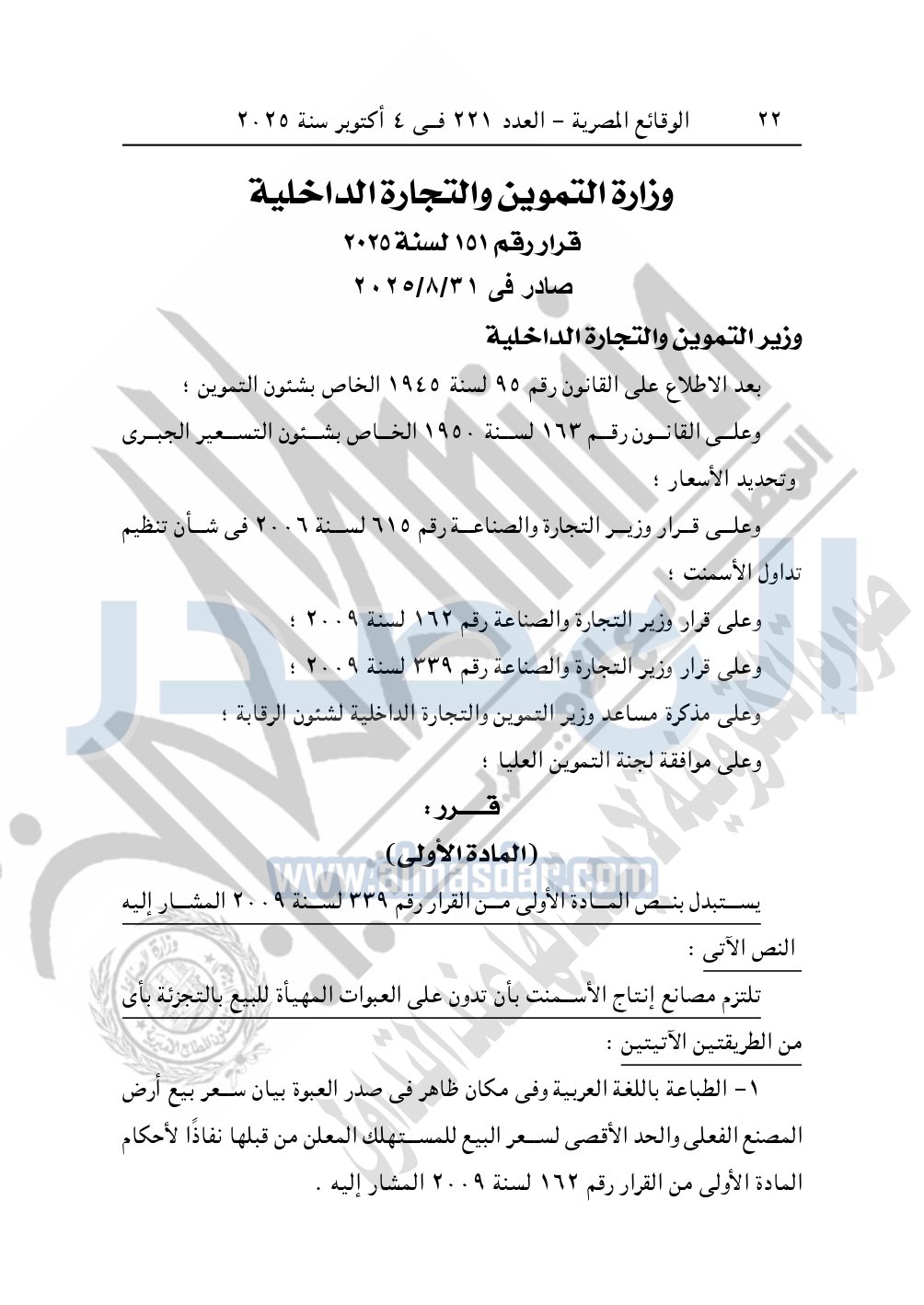 نشرت الوقائع المصرية في العدد 221، في 4 أكتوبر 2025، قرار وزارة التموين والتجارة الداخلية، رقم 151 لسنة 2025، صادر في 31-8-2025، بشأن إلتزام مصانع إنتاج الأسمنت بأن تدون على العبوات المهيأة للبيع بالتجزئة.