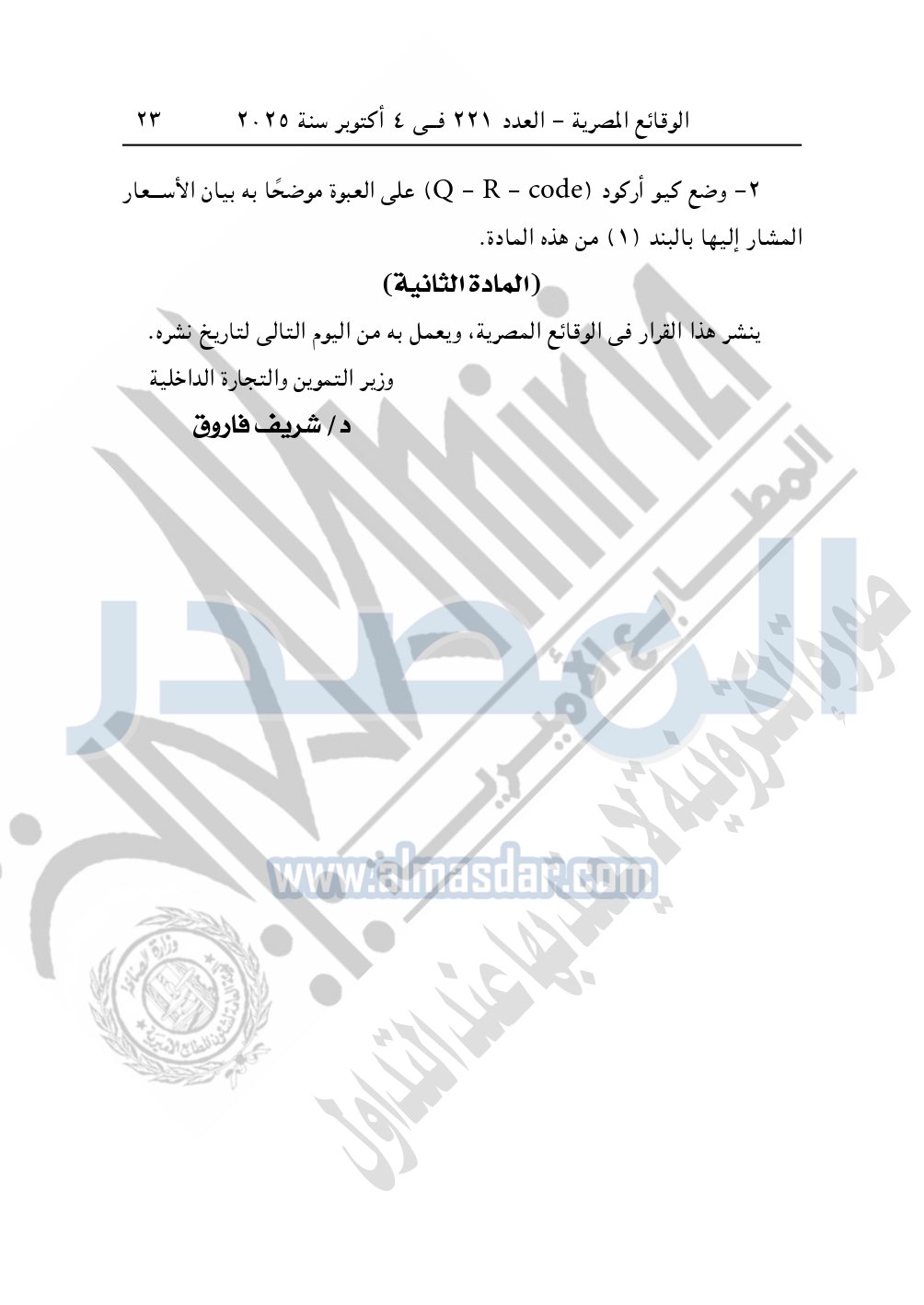 2- وضع كيو أركود "Q - R – code" على العبوة موضحا به بيان الأسعار المشار إليها بالبند "1" من هذه المادة.