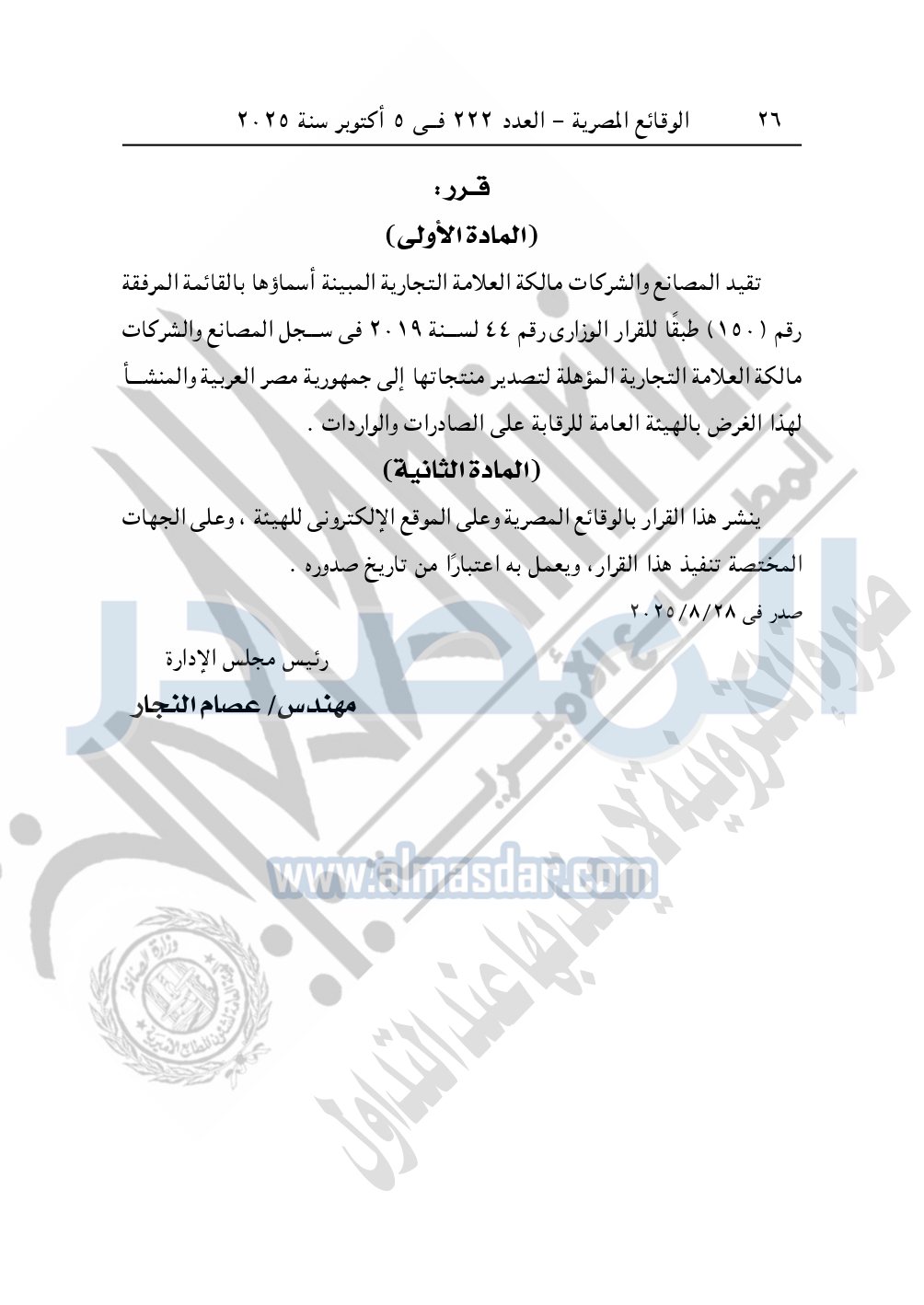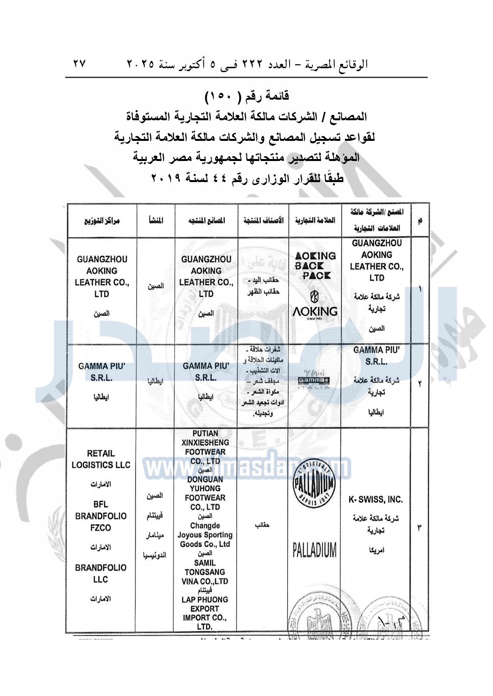 تقيد المصانع والشركات مالكة العلامة التجارية المبينة أسماؤها بالقوائم المرفقة رقم "150" طبقاً للقرار رقم 44 لسنة 2019 في سجل المصانع والشركات مالكة العلامة التجارية المؤهلة لتصدير منتجاتها إلى جمهورية مصر العربية والمنشأ لهذا الغرض بالهيئة العامة للرقابة على الصادرات والواردات.