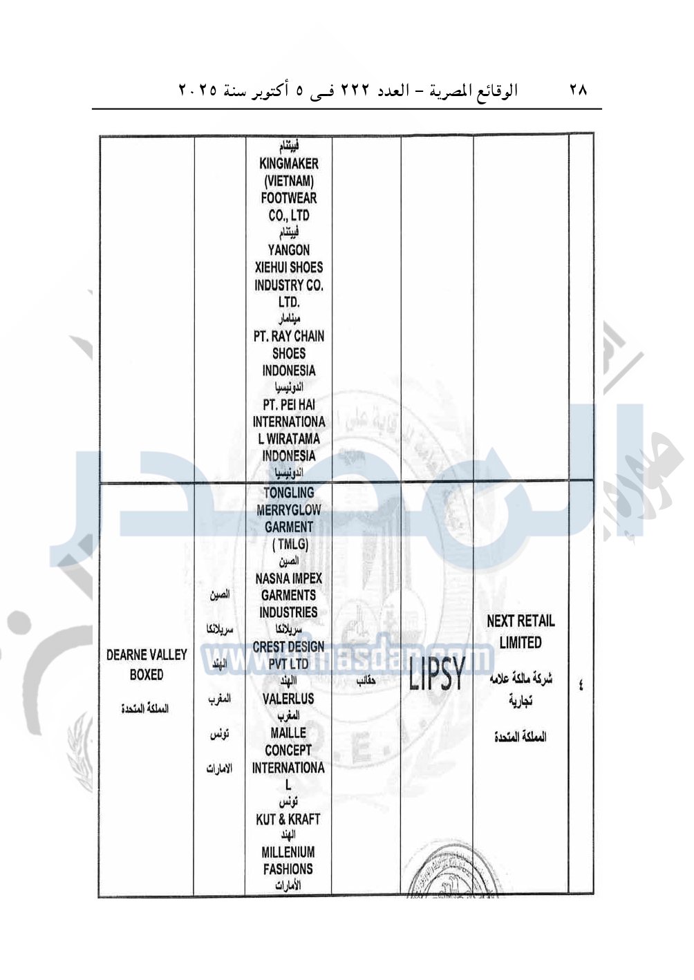 نشرت الوقائع المصرية في العدد 222، الصادر بتاريخ 5 أكتوبر 2025، قرار الهيئة العامة للرقابة على الصادرات والواردات رقم 997 لسنة 2025، بشأن قيد بعض المصانع والشركات مالكة العلامات التجارية المستوفاة لقواعد تسجيل المصانع المؤهلة لتصدير منتجاتها إلى جمهورية مصر العربية.