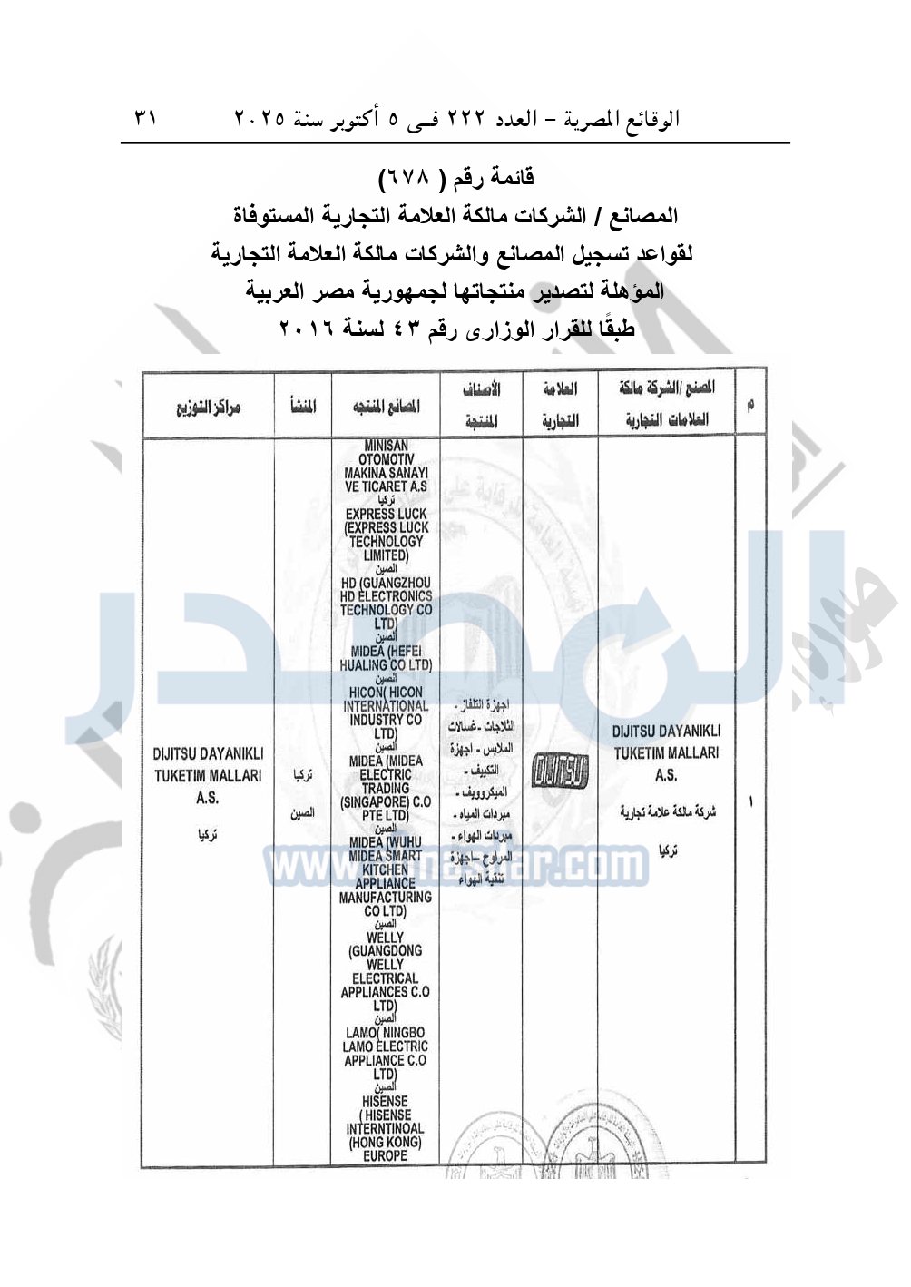 تقيد المصانع والشركات مالكة العلامة التجارية المبينة أسماؤها بالقوائم المرفقة رقم "678" طبقاً للقرار رقم 43 لسنة 2016 في سجل المصانع والشركات مالكة العلامة التجارية المؤهلة لتصدير منتجاتها إلى جمهورية مصر العربية والمنشأ لهذا الغرض بالهيئة العامة للرقابة على الصادرات والواردات.