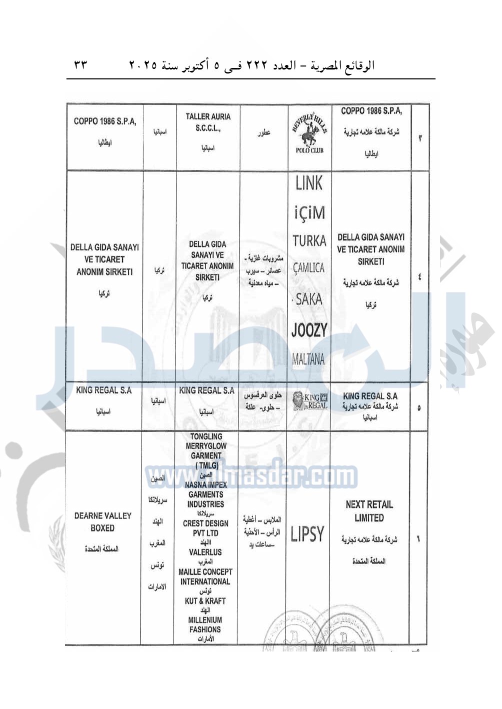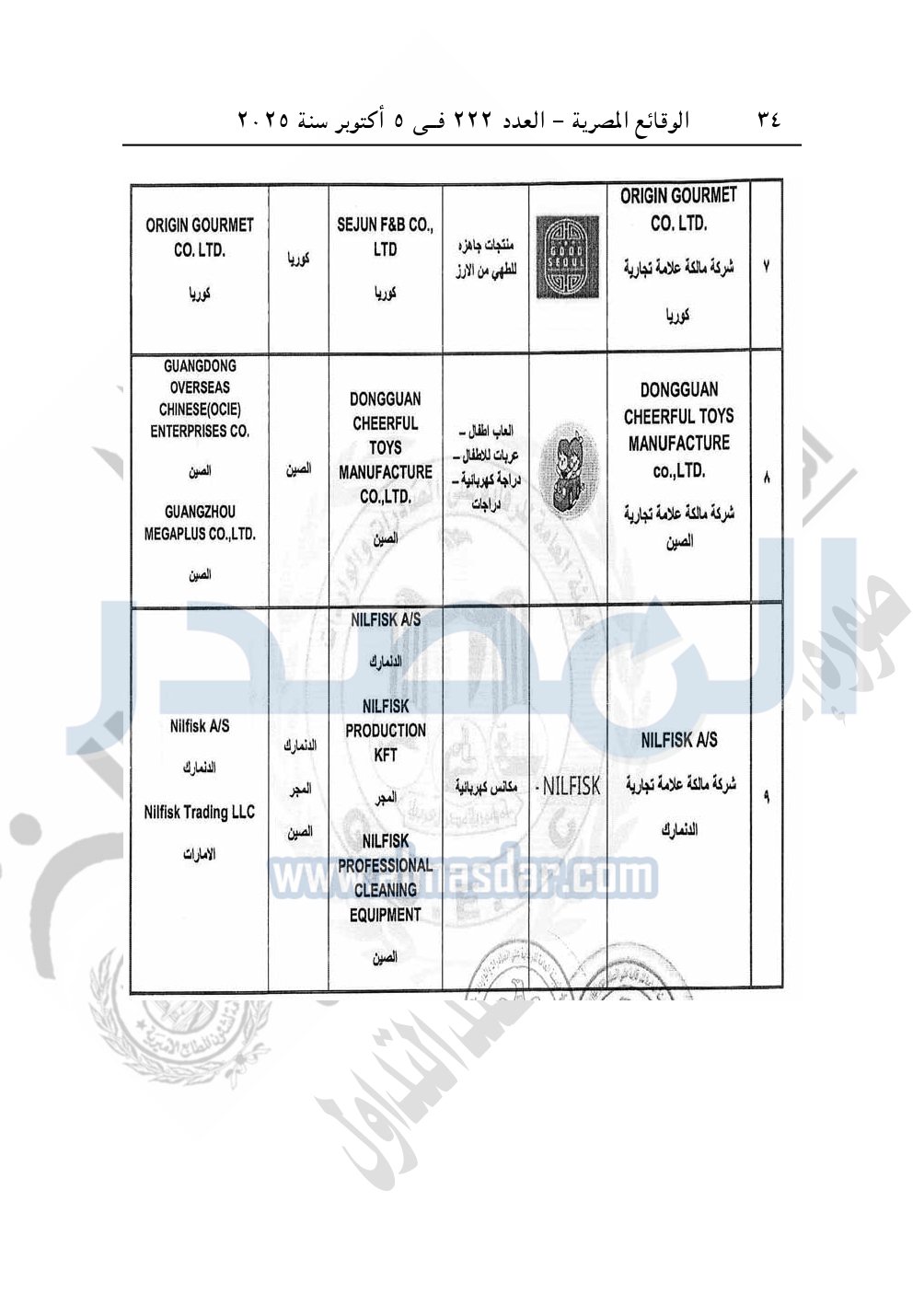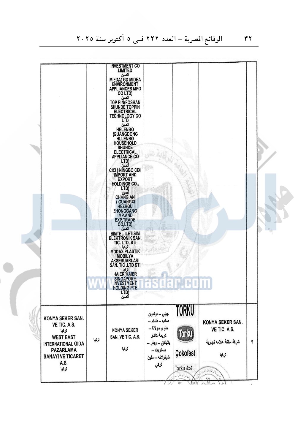 كما نشرت الوقائع المصرية في العدد 222، الصادر بتاريخ 5 أكتوبر 2025، قرار الهيئة العامة للرقابة على الصادرات والواردات رقم 998 لسنة 2025، بشأن قيد بعض المصانع والشركات مالكة العلامات التجارية المستوفاة لقواعد تسجيل المصانع المؤهلة لتصدير منتجاتها إلى جمهورية مصر العربية.